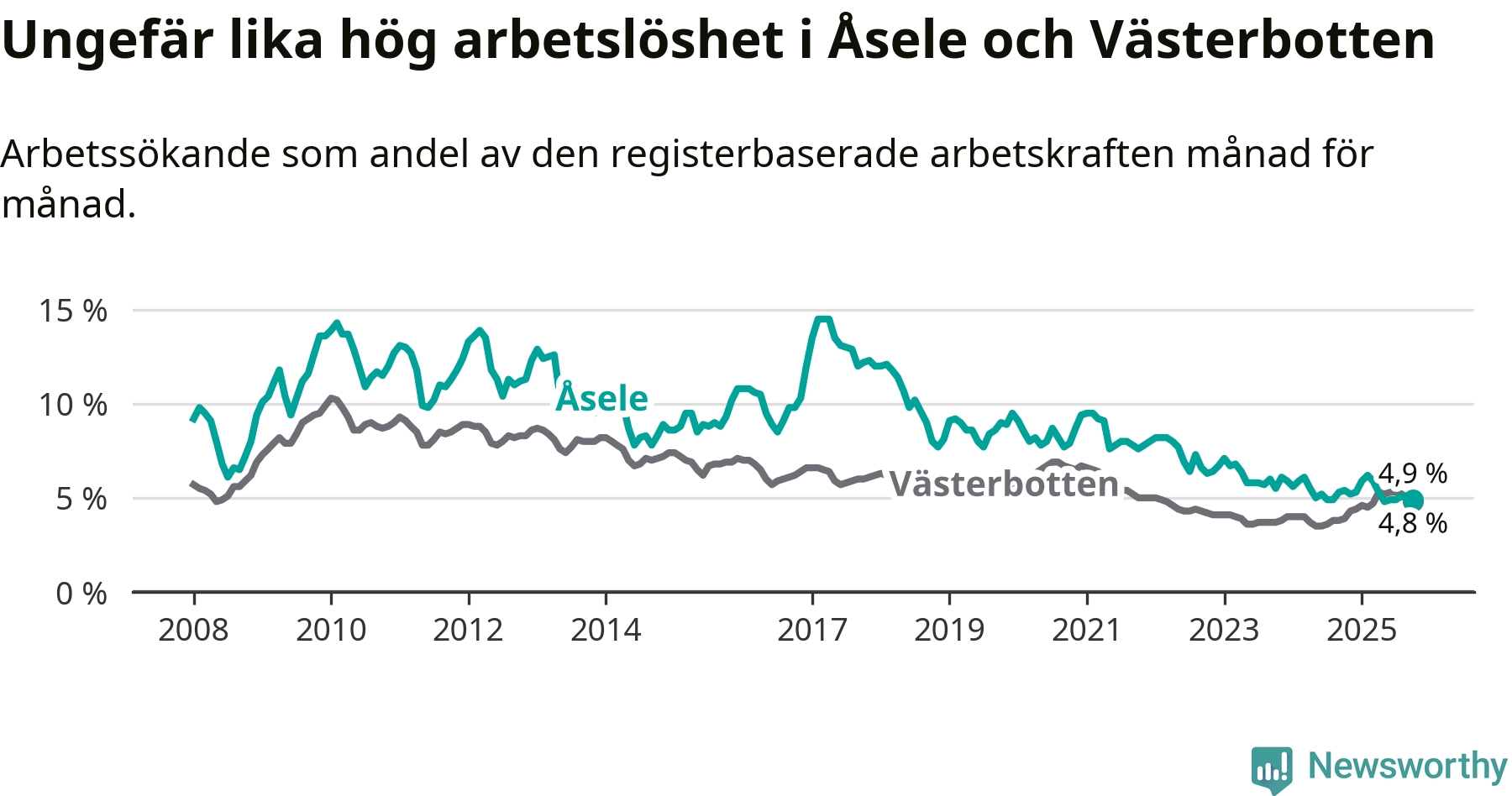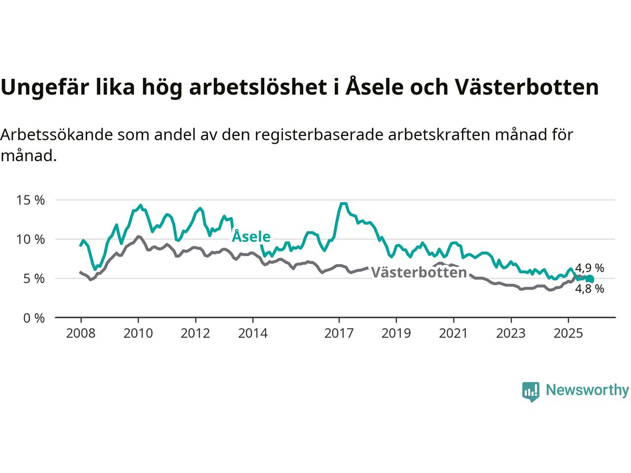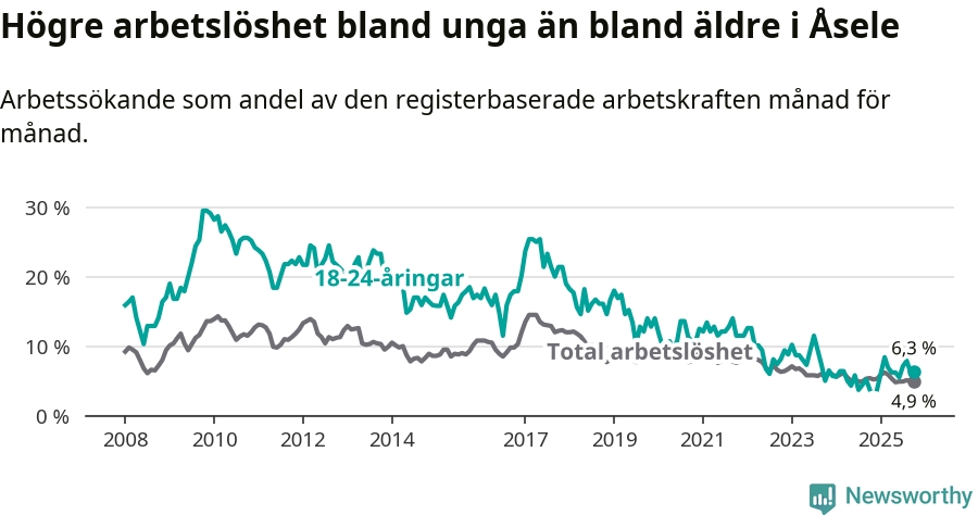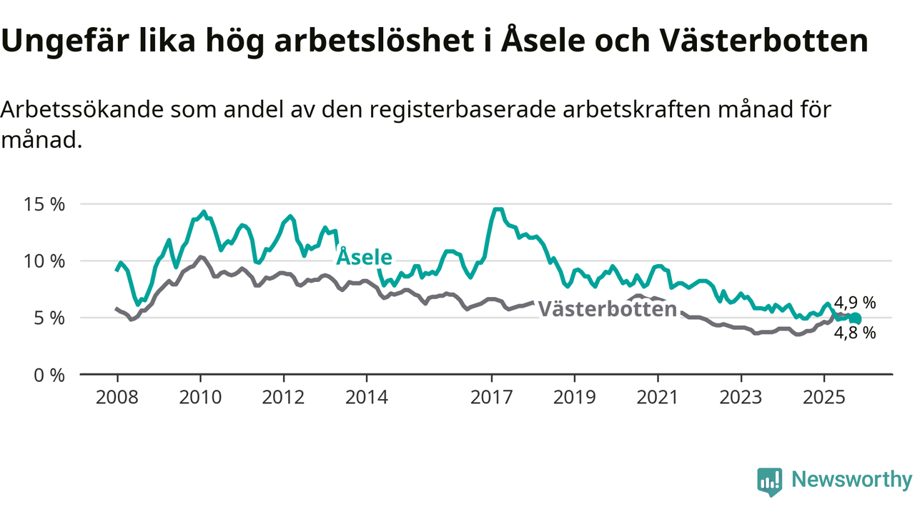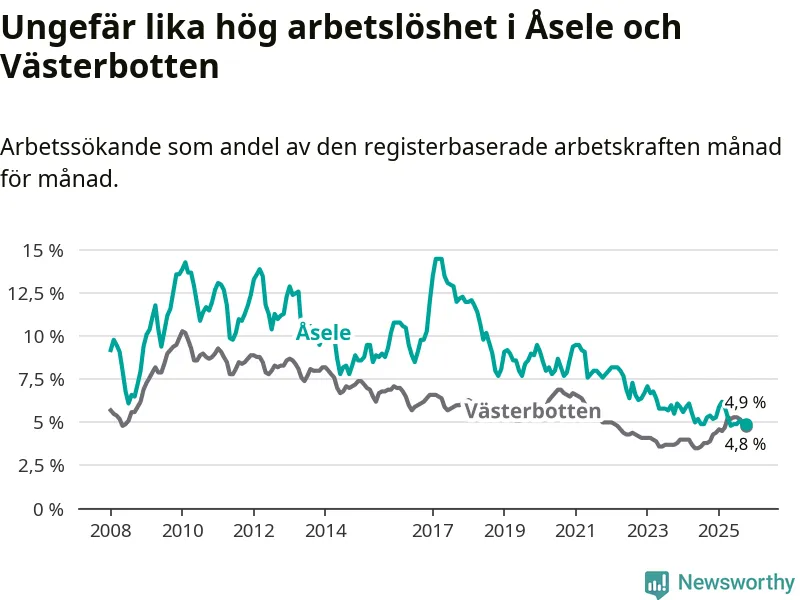 Anmärkningsvärt är att arbetslösheten nu, för första gången sedan juli 2023, är högre i Åsele än snittet i Västerbotten.