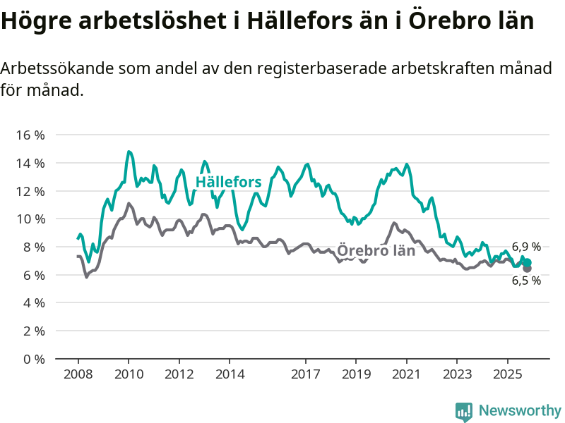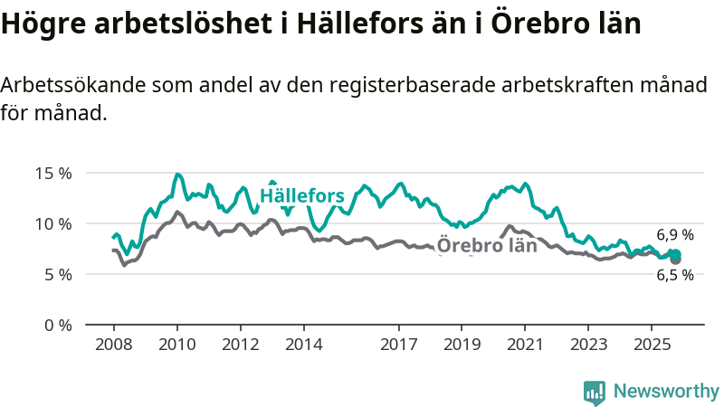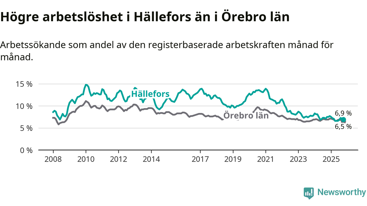 Under oktober månad rapporterade Hällefors kommun en total arbetslöshet på 6,9 procent. Det är en minskning jämfört med samma tidpunkt i fjol (−0,6 procentenheter). Även i Örebro län sjunker arbetslösheten .