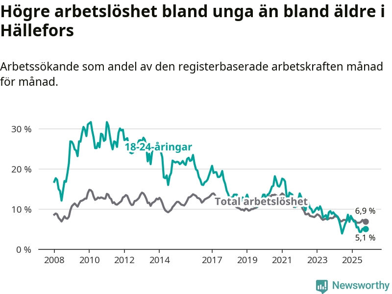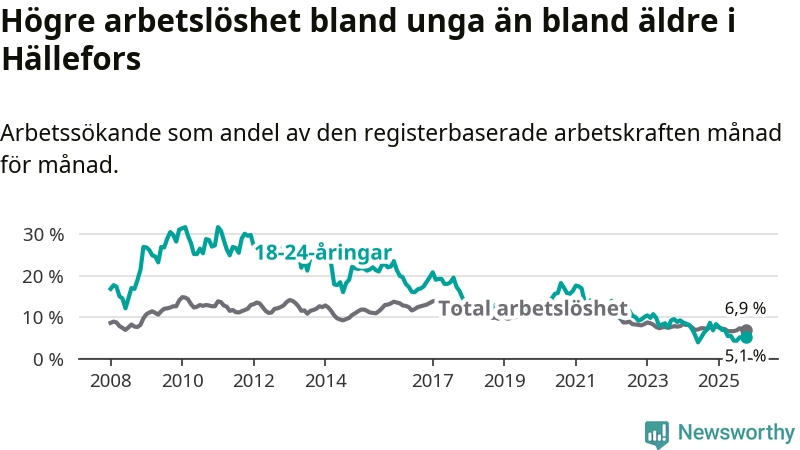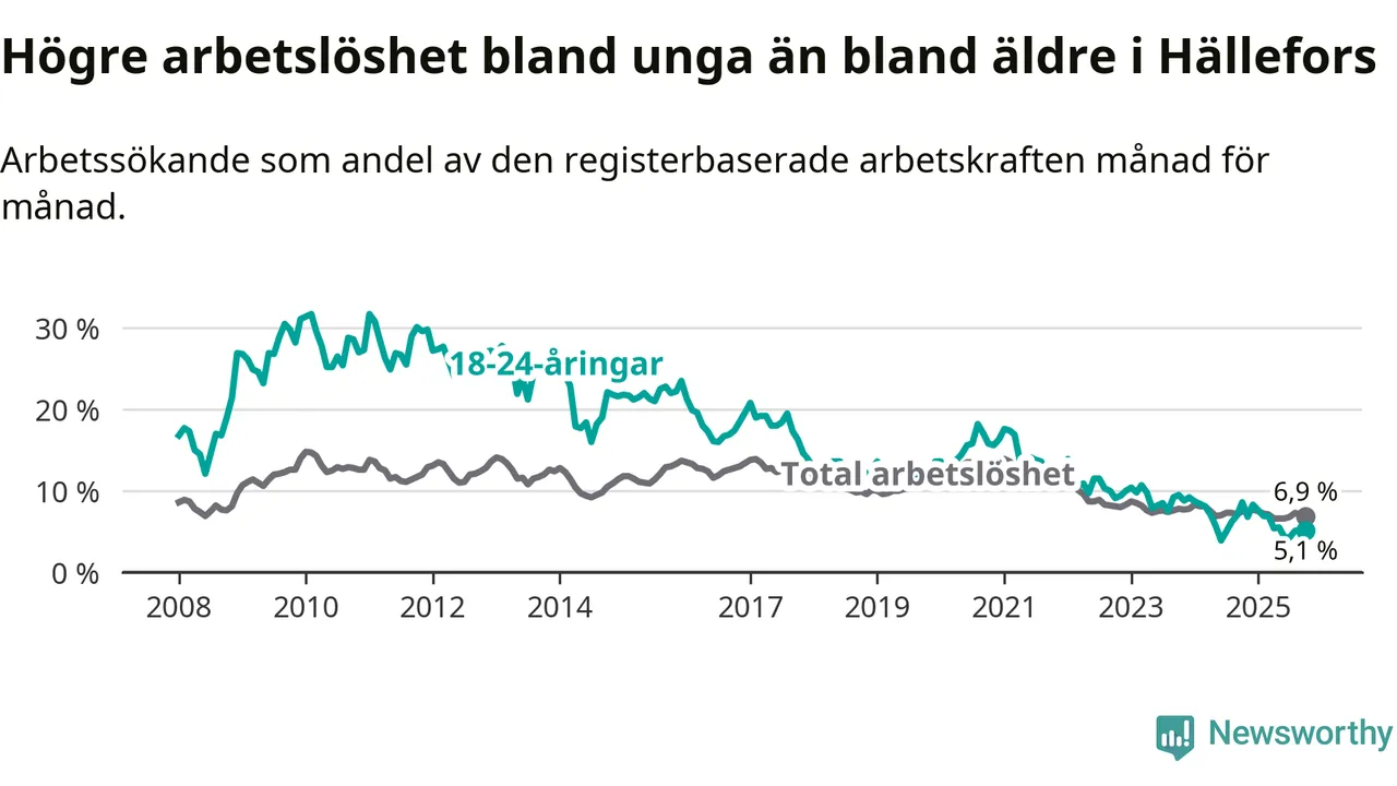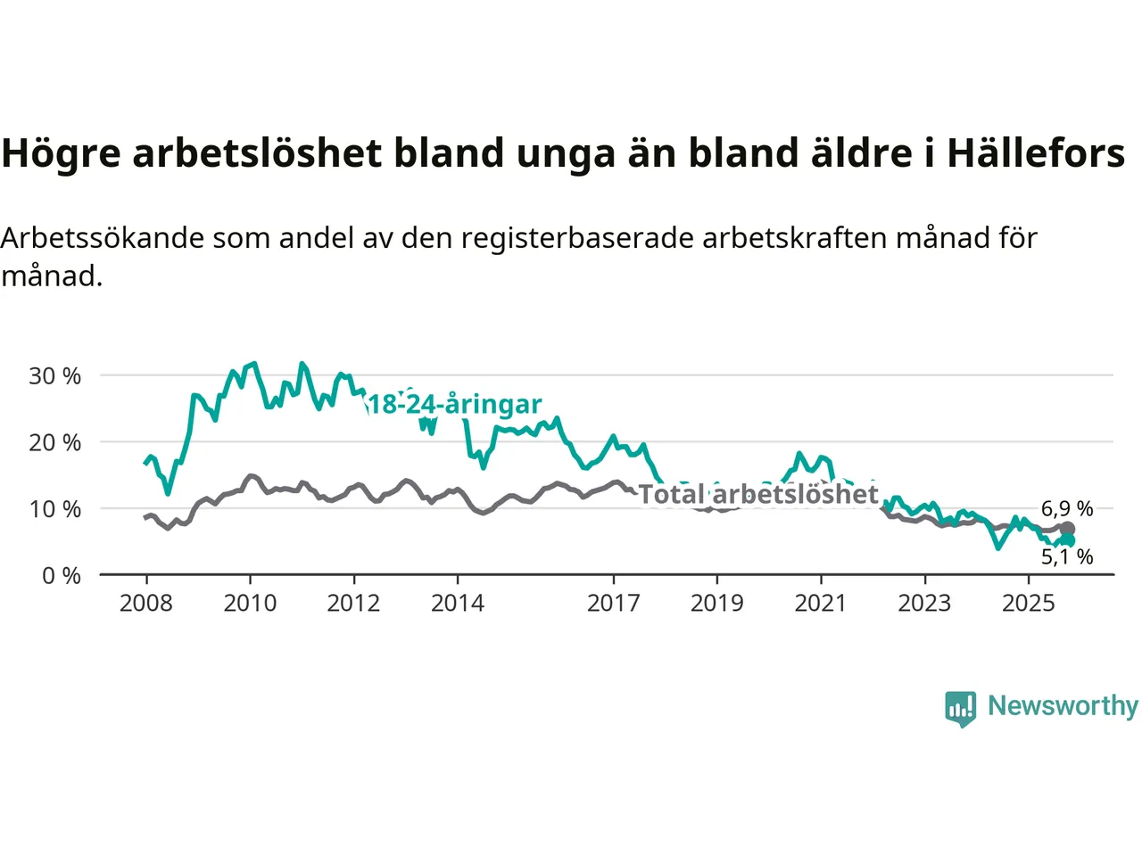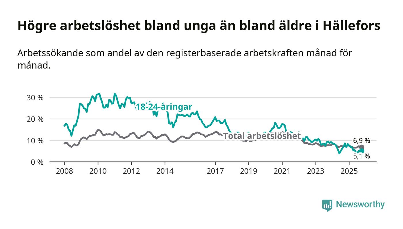 Den senaste månadsstatistiken från Arbetsförmedlingen visar på en nedgång i ungdomsarbetslöshet i Hällefors kommun med 3,5 procentenheter. Arbetslösheten bland personer i åldern 18–24 år låg i oktober på 5,1 procent.