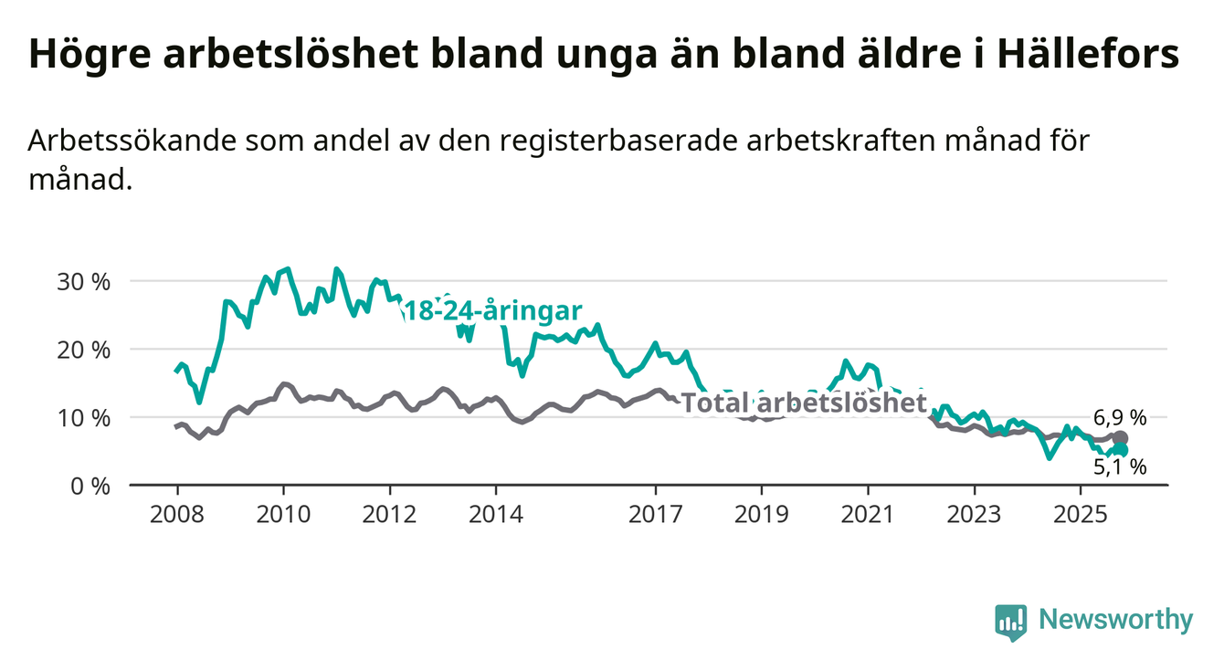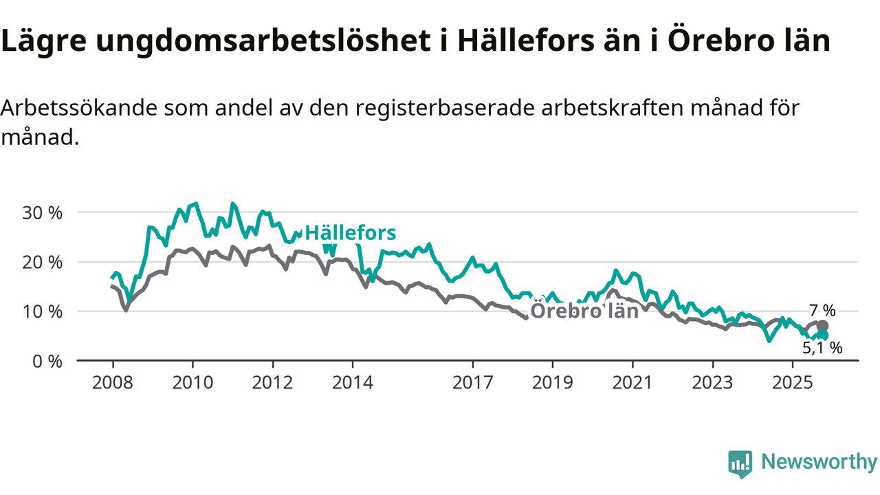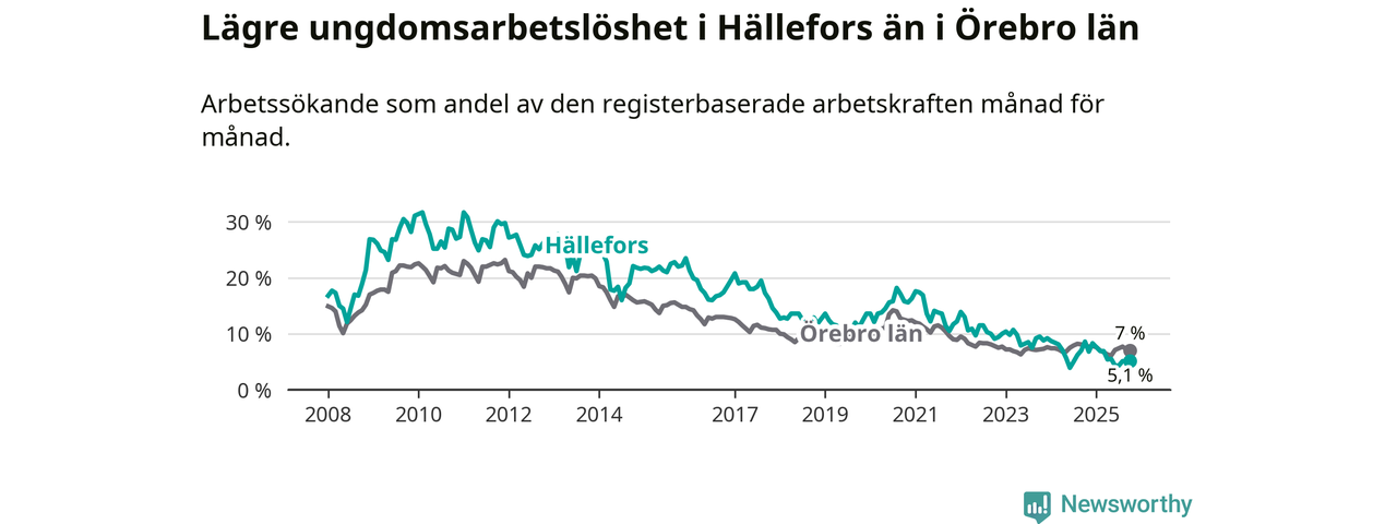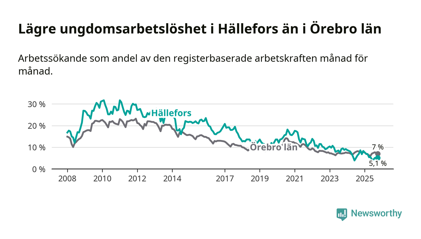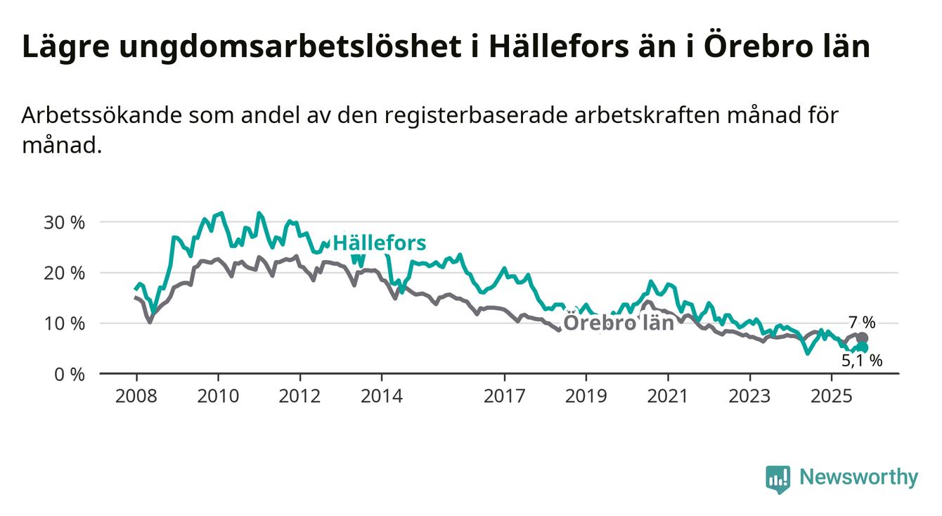 Medan Hällefors har högre total arbetslöshet än Örebro, ligger ungdomsarbetslösheten 1,9 procentenheter lägre i Hällefors.