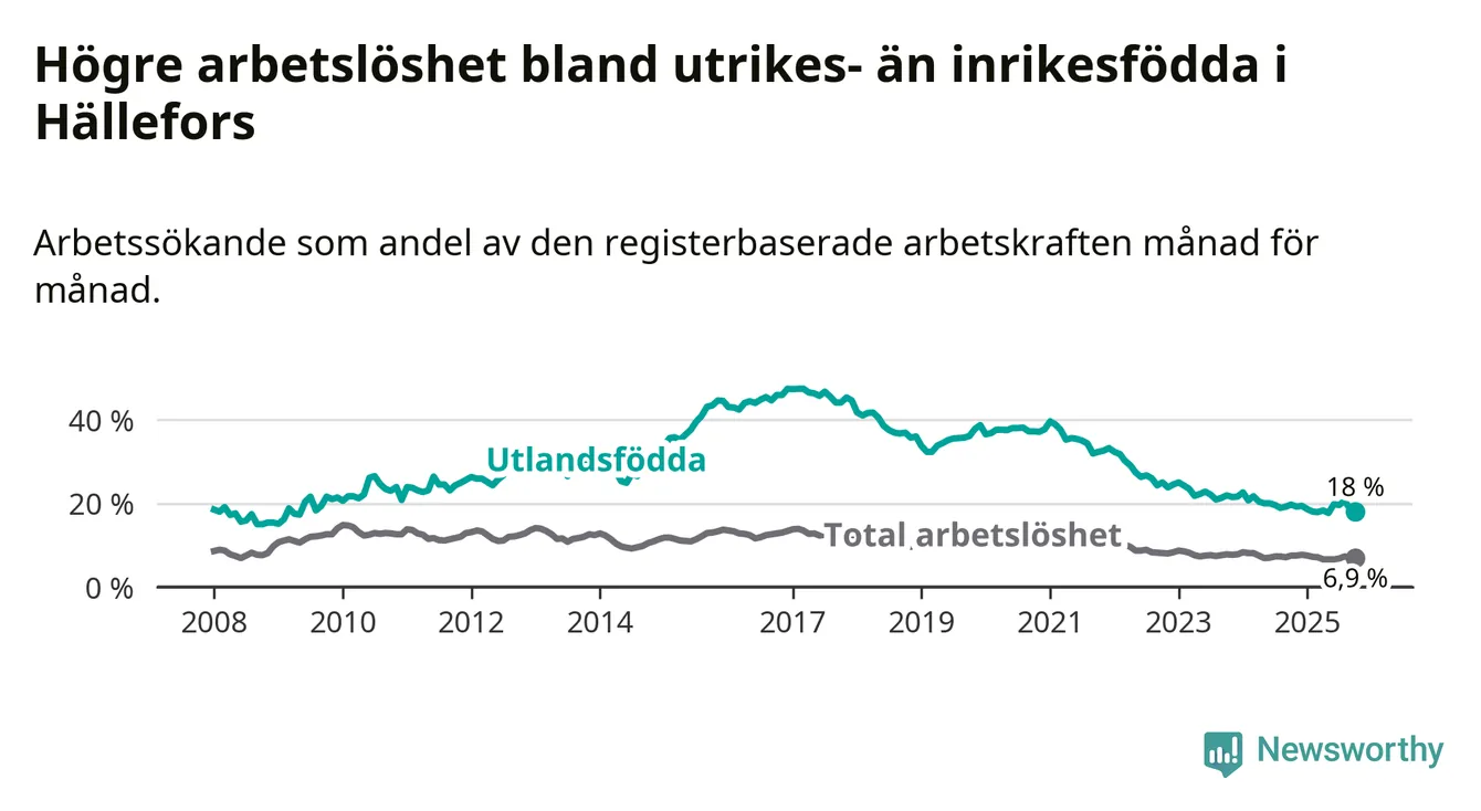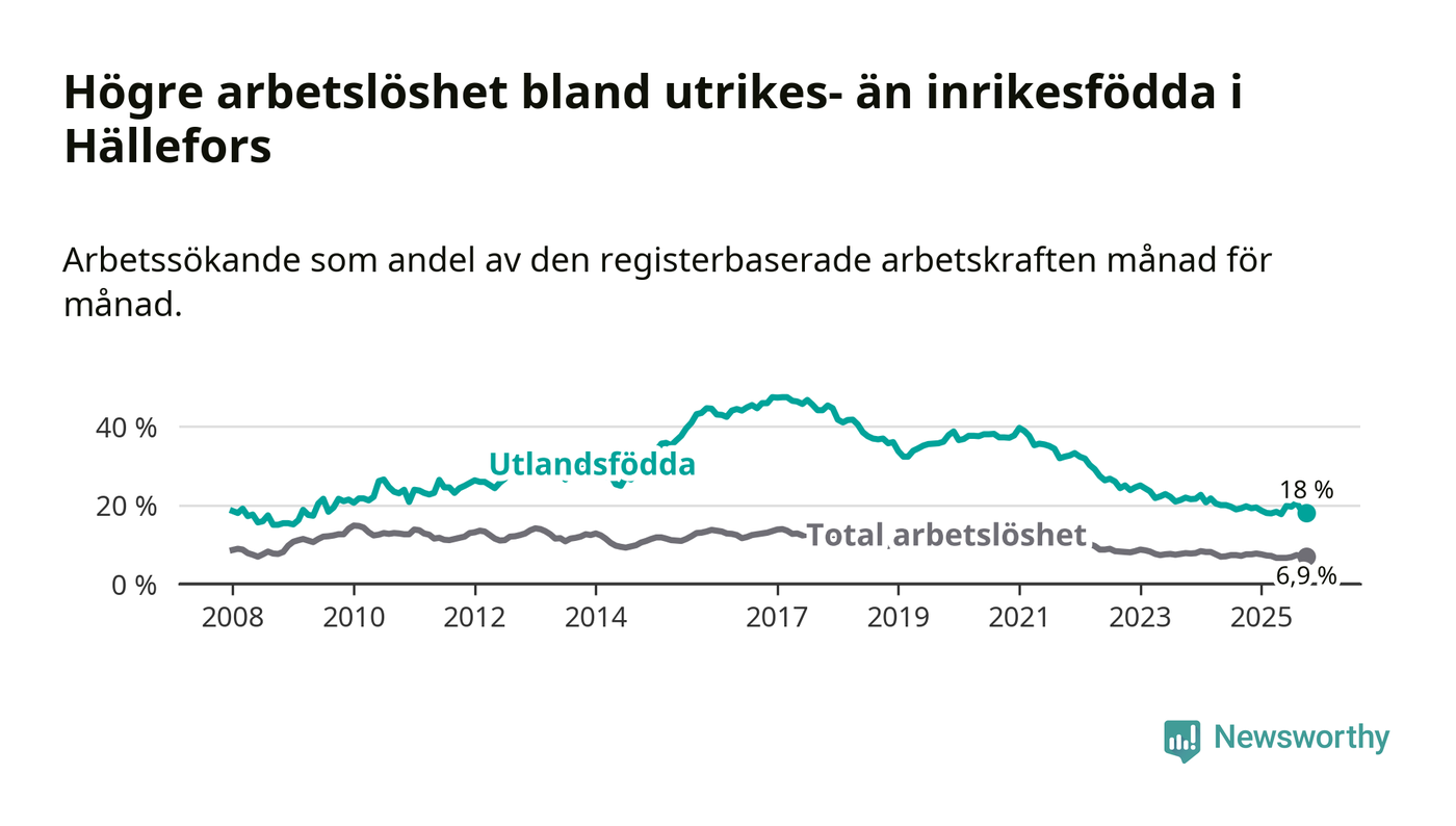 Arbetslösheten bland utlandsfödda var 18,0 procent i Hällefors under oktober månad, motsvarande 83 av 461 personer. Det är 1,7 procentenheter färre än vid samma tidpunkt i fjol (−18 om man räknar personer).