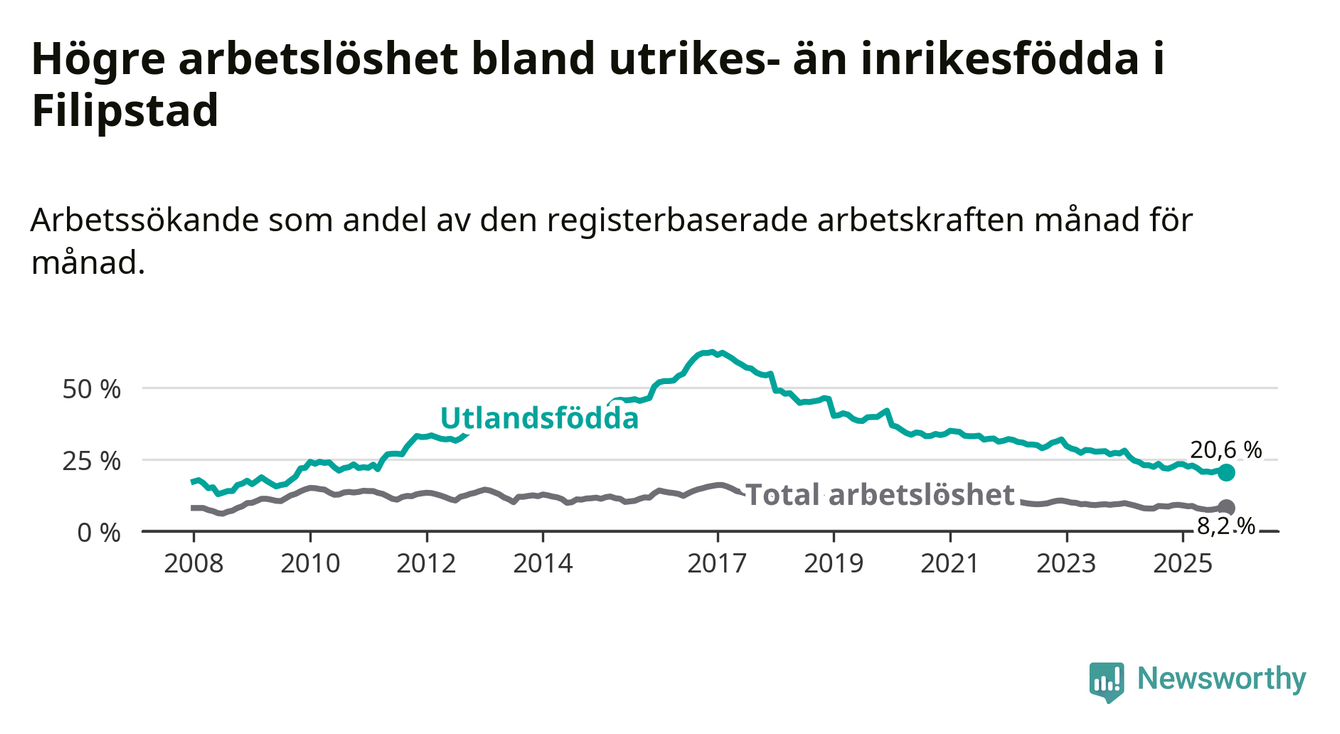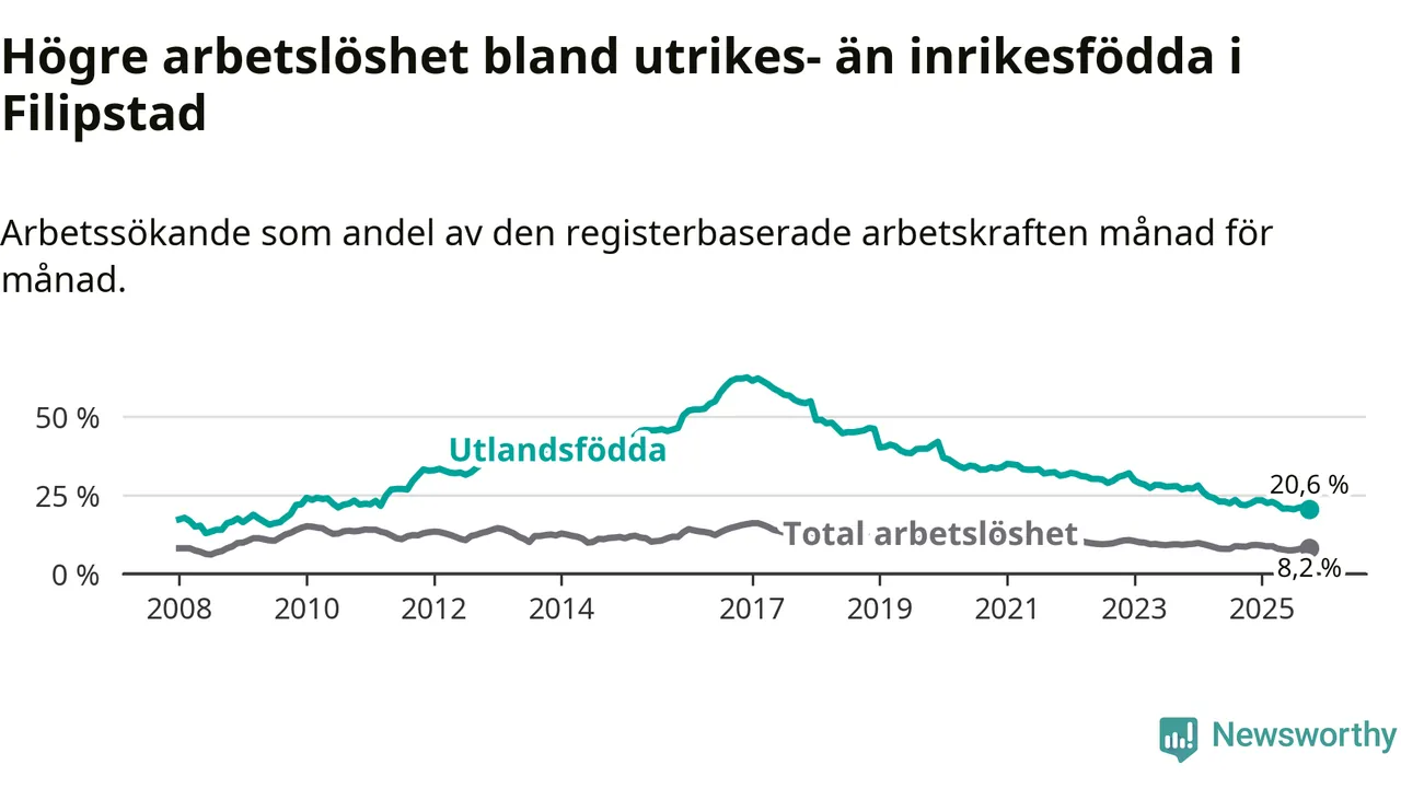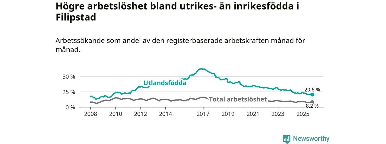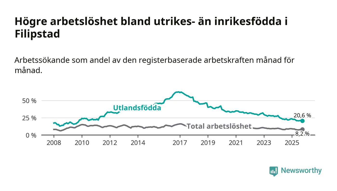 Arbetslösheten bland utlandsfödda var 20,6 procent i Filipstad under oktober månad, motsvarande 154 av 748 personer. Det är 1,2 procentenheter färre än vid samma tidpunkt i fjol (−16 om man räknar personer). Därmed har de utlandsföddas arbetslöshet varit lägre än vid samma tidpunkt i fjol i över två år i sträck. Sedan december 2022 har arbetslösheten bland utlandsfödda minskat från 32,0 till 20,6 procent.
