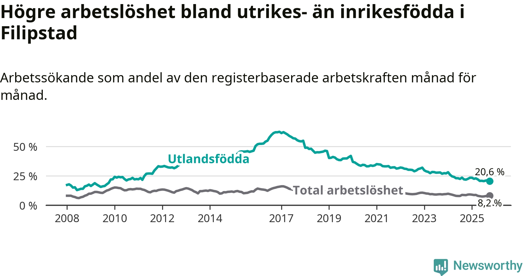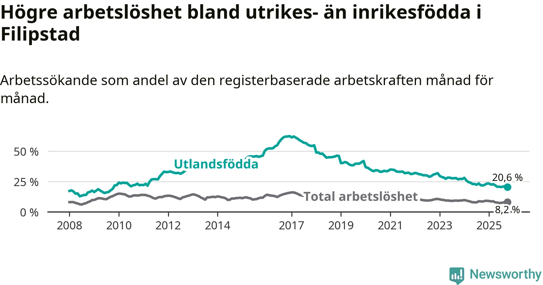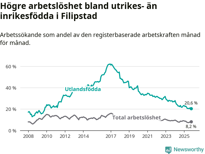 Arbetslösheten bland utlandsfödda var 20,6 procent i Filipstad under oktober månad, motsvarande 154 av 748 personer. Det är 1,2 procentenheter färre än vid samma tidpunkt i fjol (−16 om man räknar personer). Därmed har de utlandsföddas arbetslöshet varit lägre än vid samma tidpunkt i fjol i över två år i sträck. Sedan december 2022 har arbetslösheten bland utlandsfödda minskat från 32,0 till 20,6 procent.