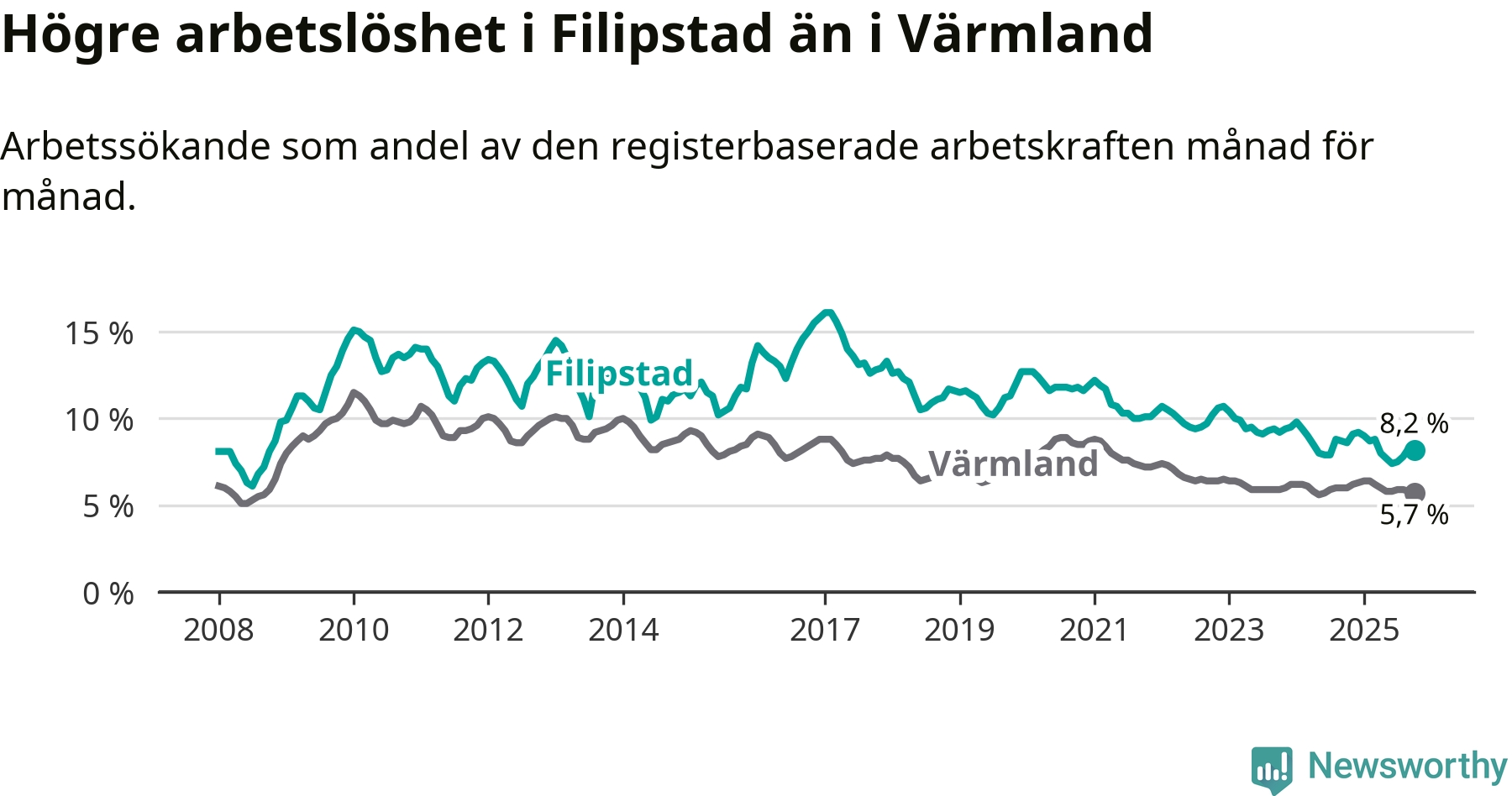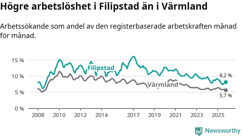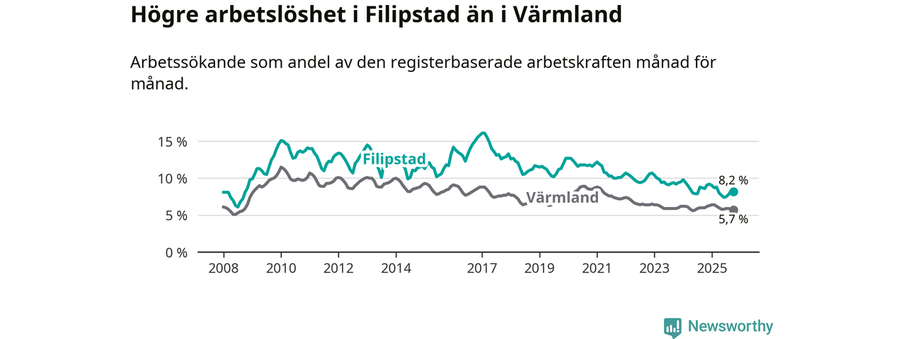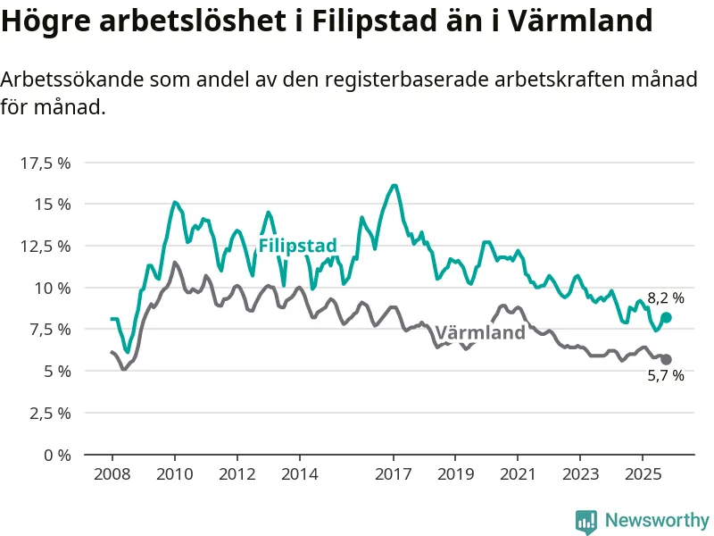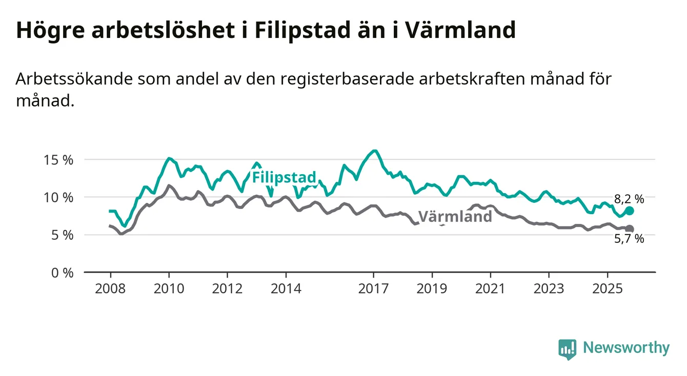 Det är 34:e månaden i följd som arbetslösheten i Filipstad är lägre än den var under samma tidpunkt året innan. Sedan december 2022 har arbetslösheten gått ner från 10,7 till 8,2 procent.