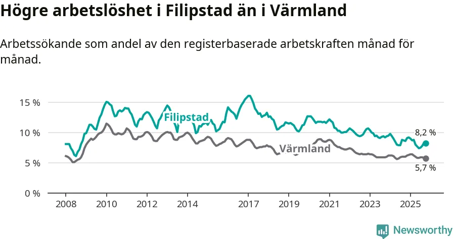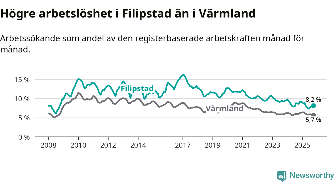 Under oktober månad rapporterade Filipstads kommun en total arbetslöshet på 8,2 procent. Det är en minskning jämfört med samma tidpunkt i fjol (−0,4 procentenheter). Även i Värmlands län sjunker arbetslösheten .