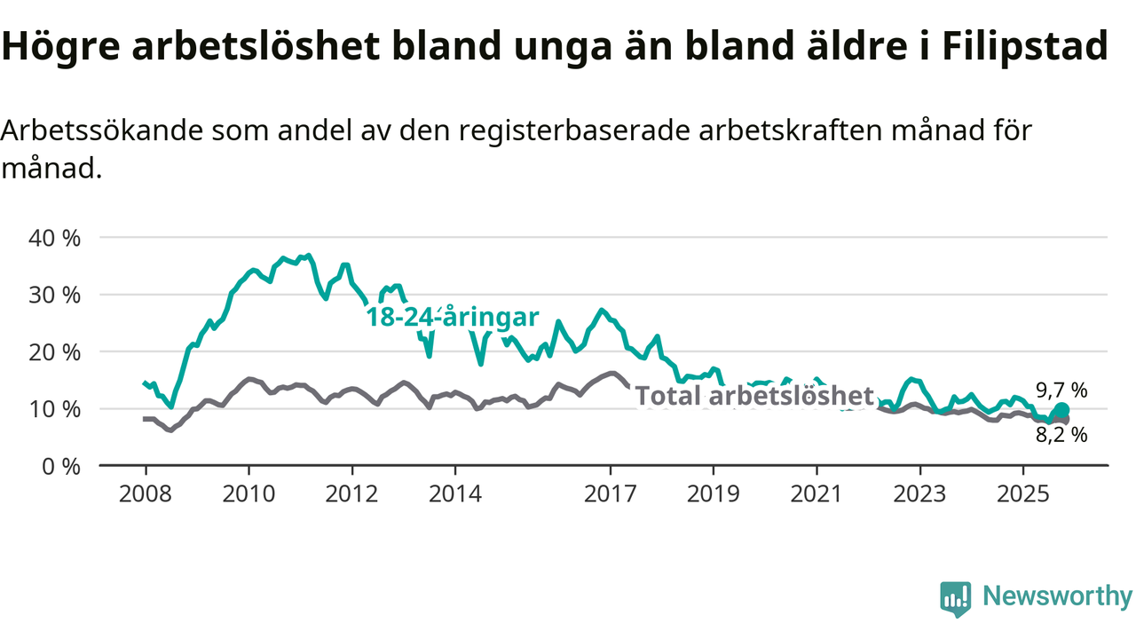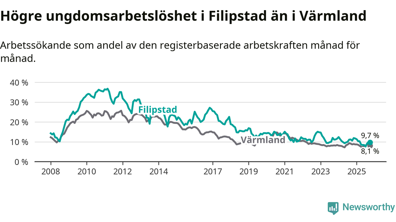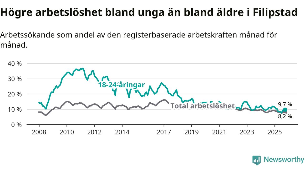 I och med den senaste månadens nedgång har de ungas arbetslöshet i Filipstad sjunkit tio månader i följd (ner från 11,7 procent i december 2024 till 9,7 procent nu).