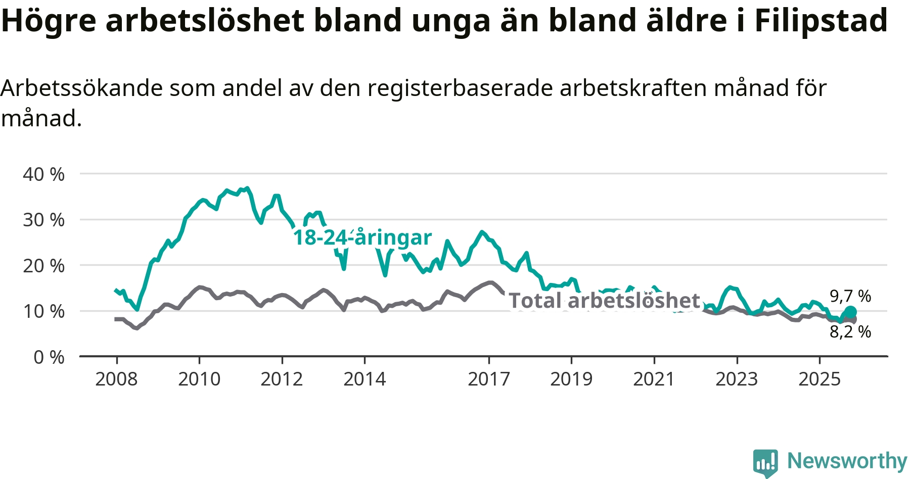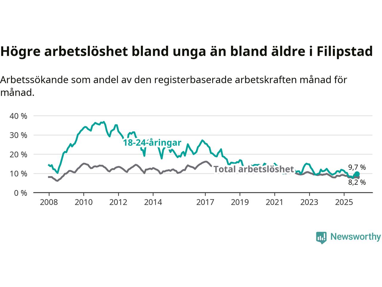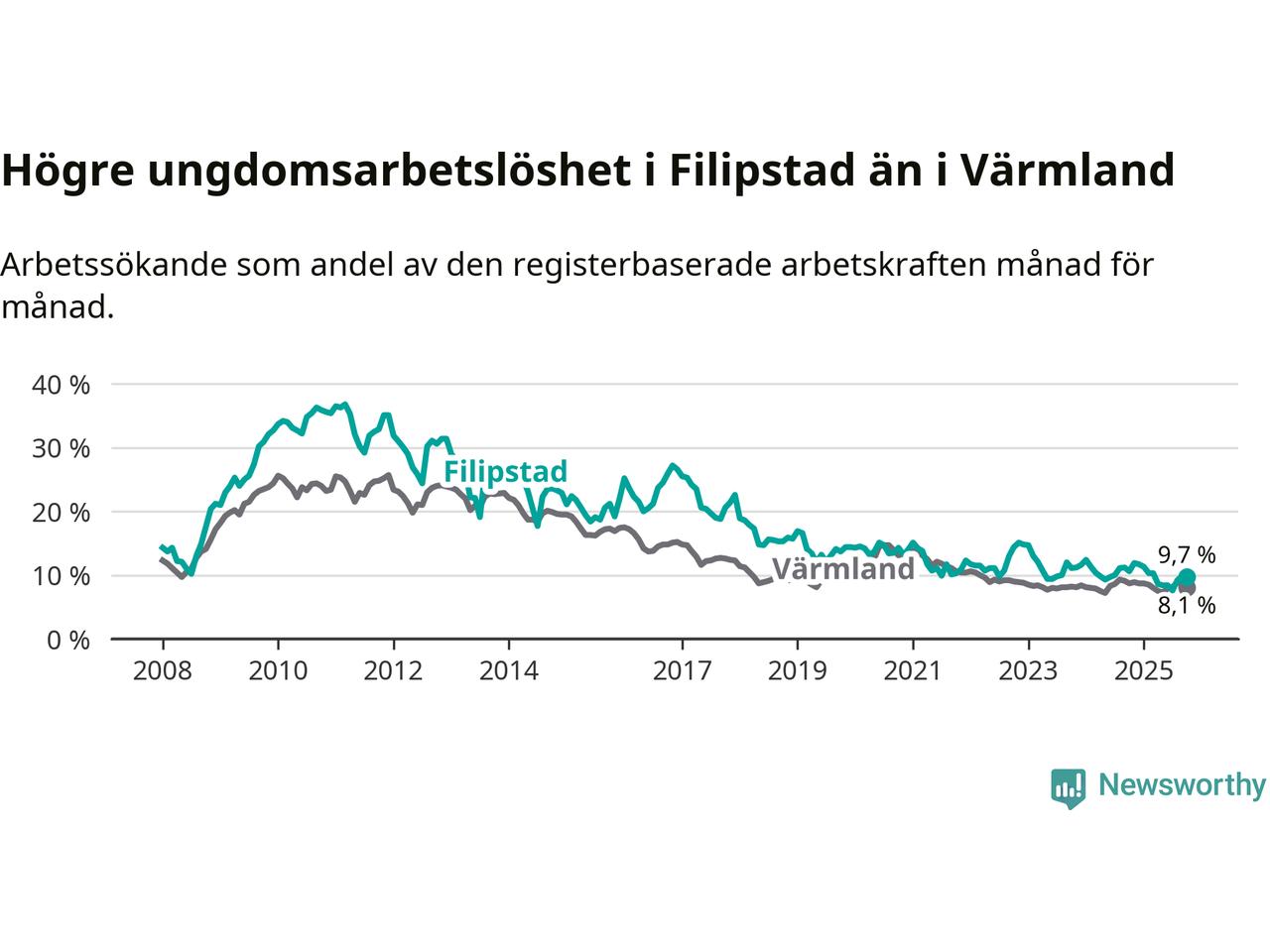 I och med den senaste månadens nedgång har de ungas arbetslöshet i Filipstad sjunkit tio månader i följd (ner från 11,7 procent i december 2024 till 9,7 procent nu).