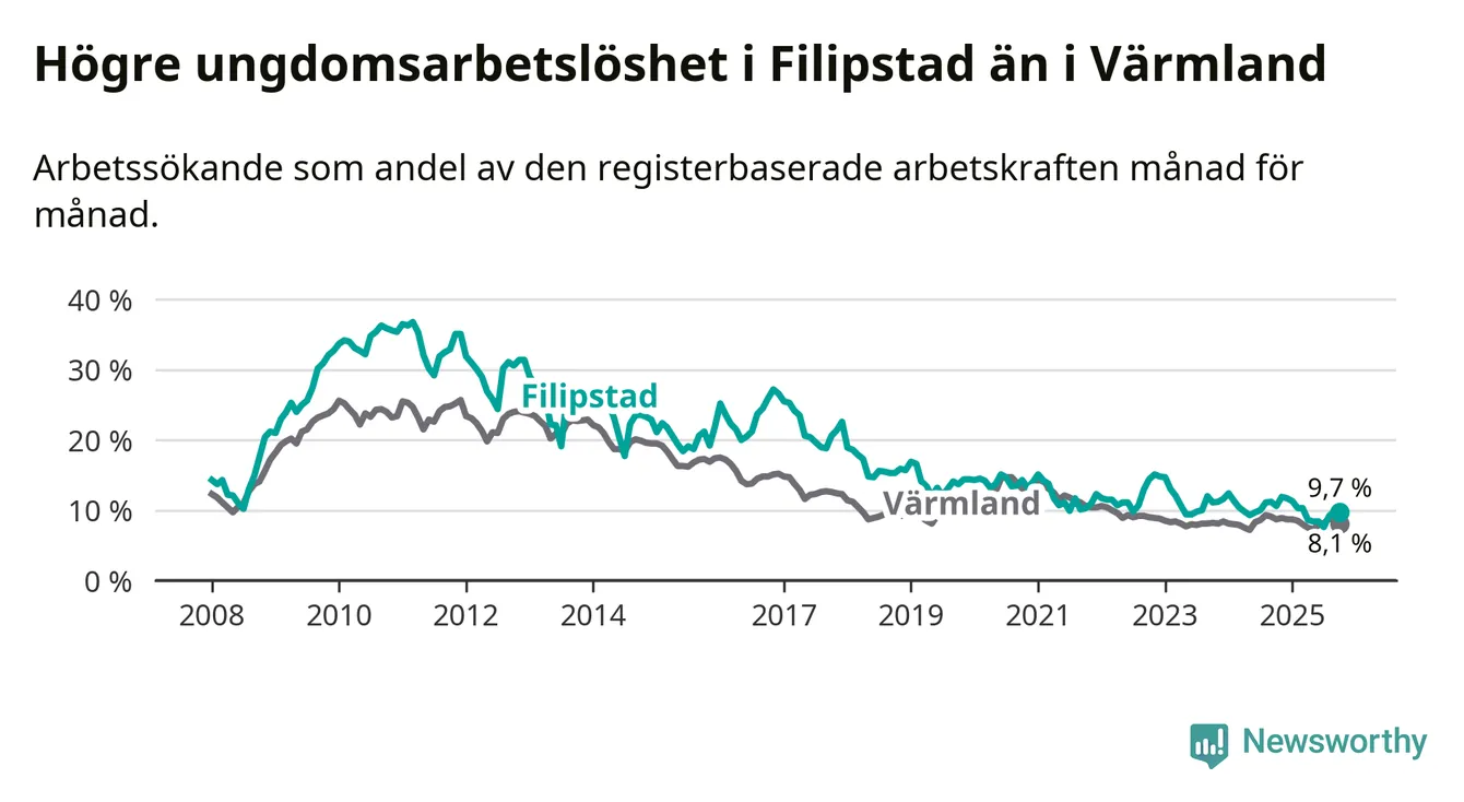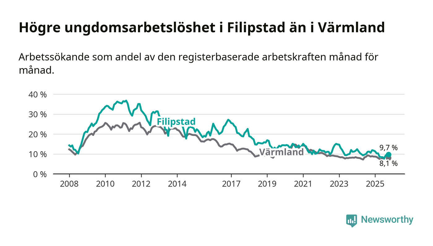 Precis som den totala arbetslösheten ligger ungdomsarbetslösheten i Filipstad högre än i Värmland som helhet. Skillnaden mellan kommunen och länet är 1,6 procentenheter.