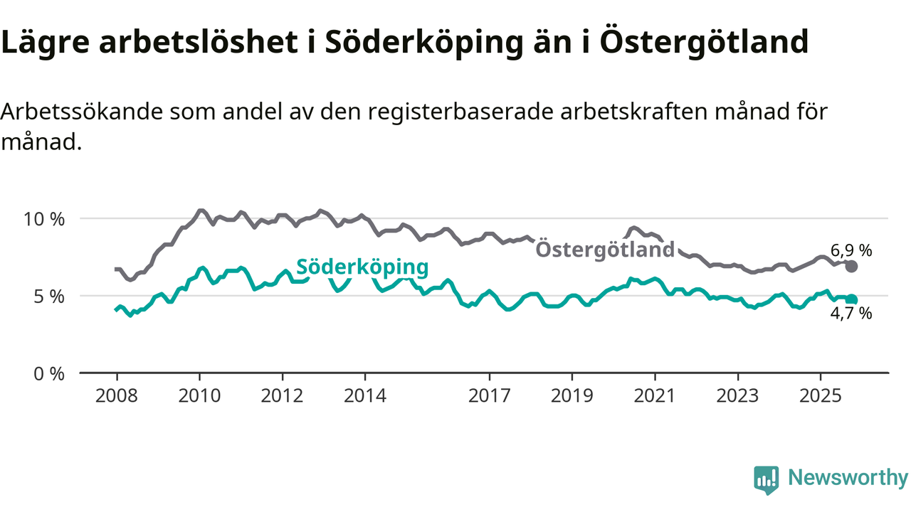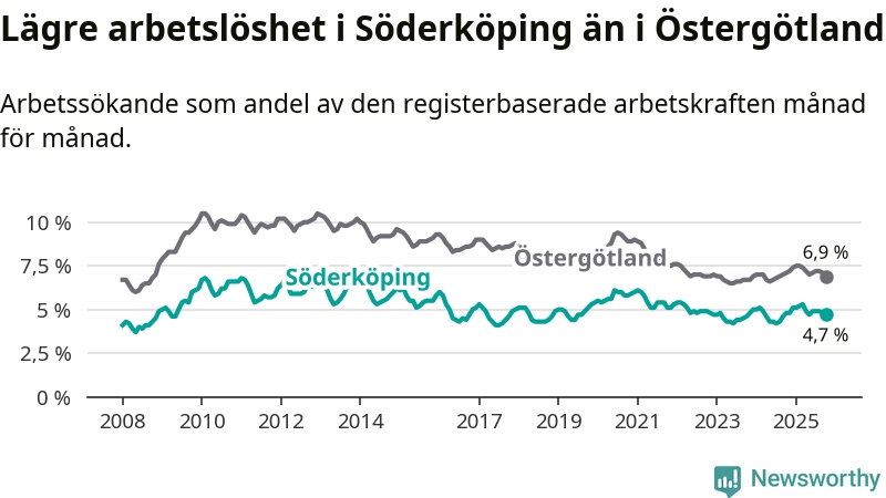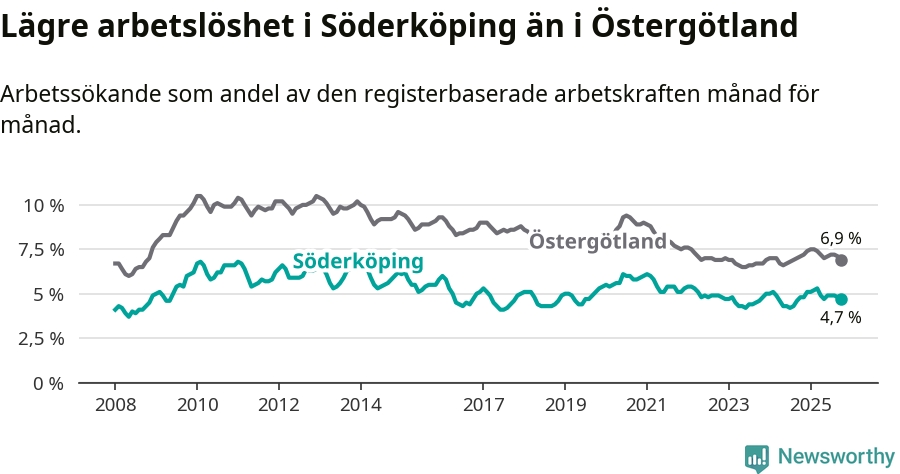Under oktober månad rapporterade Söderköpings kommun en total arbetslöshet på 4,7 procent. Det är en minskning jämfört med samma tidpunkt i fjol (−0,1 procentenheter). Även i Östergötlands län sjunker arbetslösheten något.