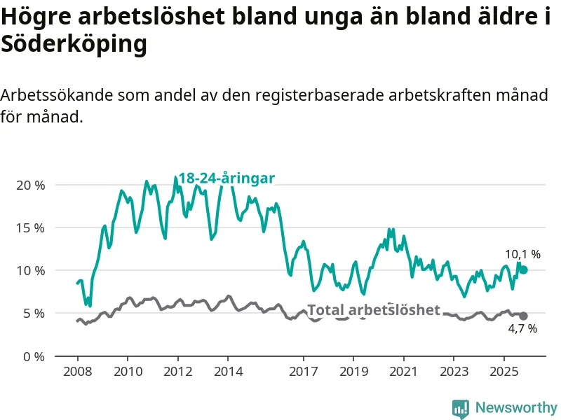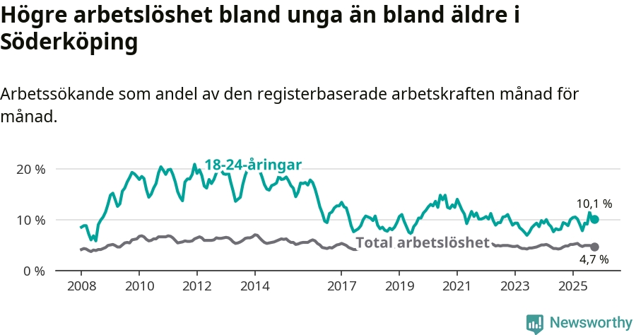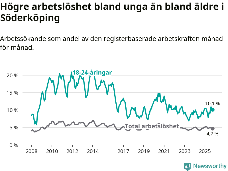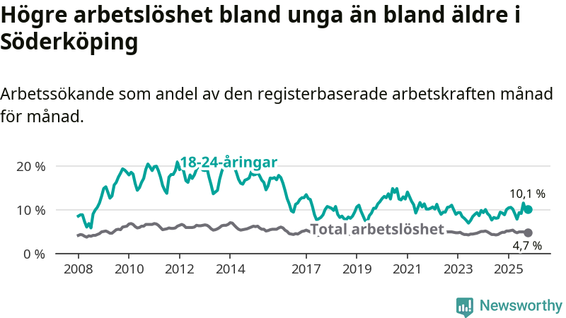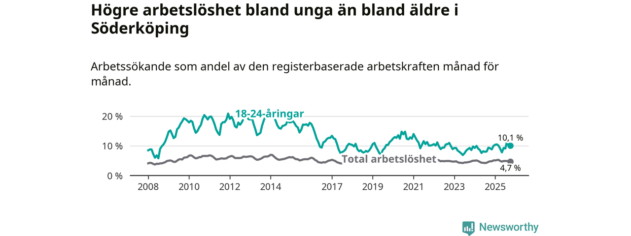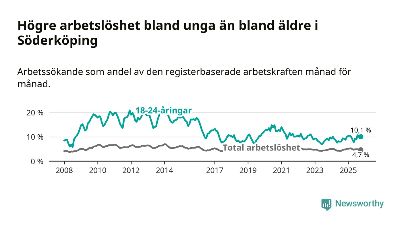 I och med den senaste månadens uppgång har de ungas arbetslöshet i Söderköping stigit tolv månader i följd (upp från 9,2 procent i oktober 2024 till 10,1 procent nu).