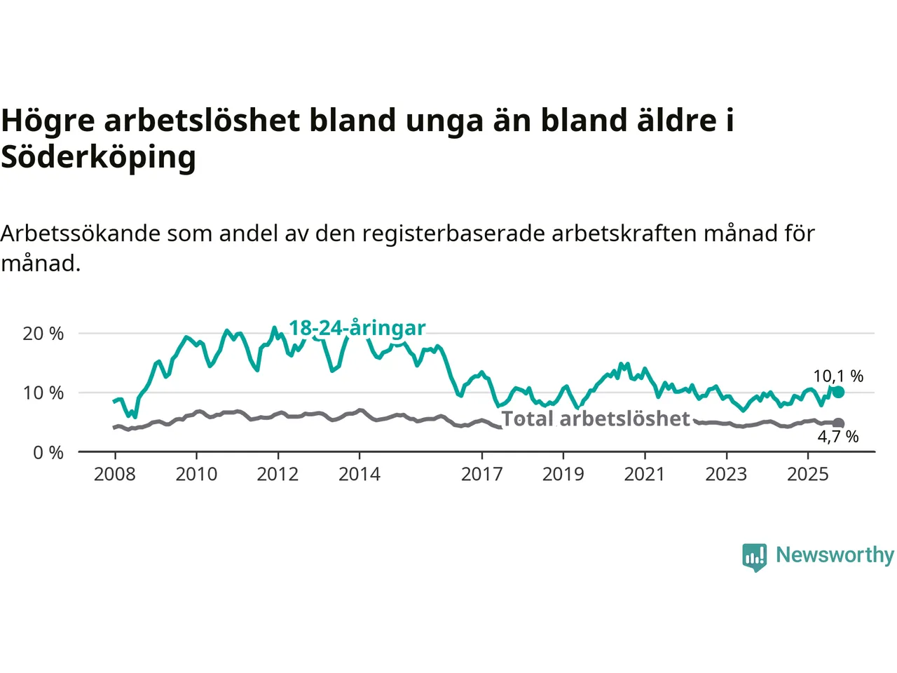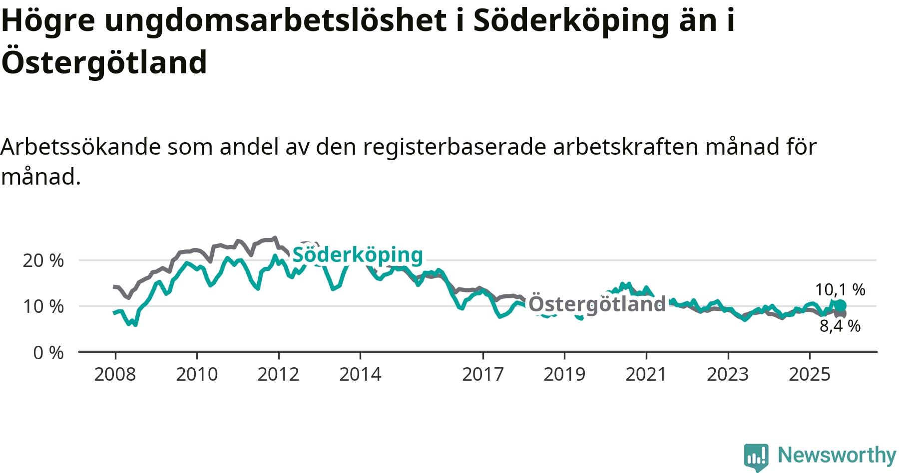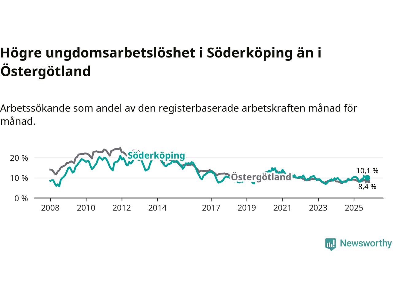 I och med den senaste månadens uppgång har de ungas arbetslöshet i Söderköping stigit tolv månader i följd (upp från 9,2 procent i oktober 2024 till 10,1 procent nu).