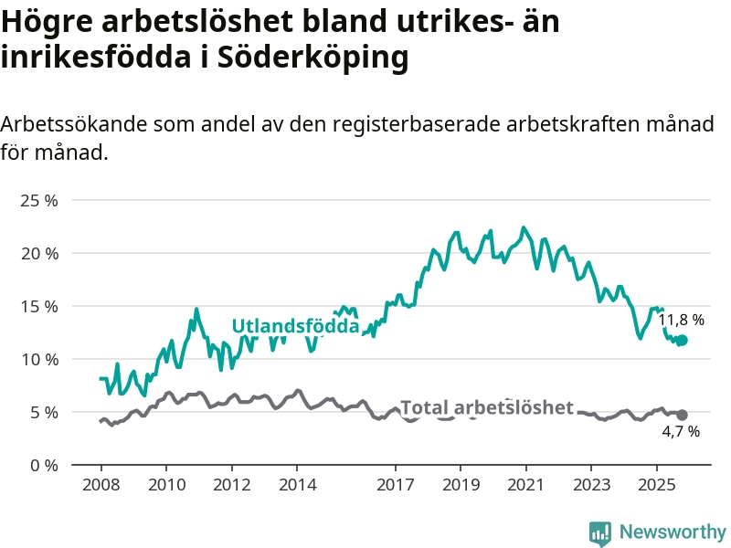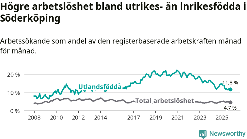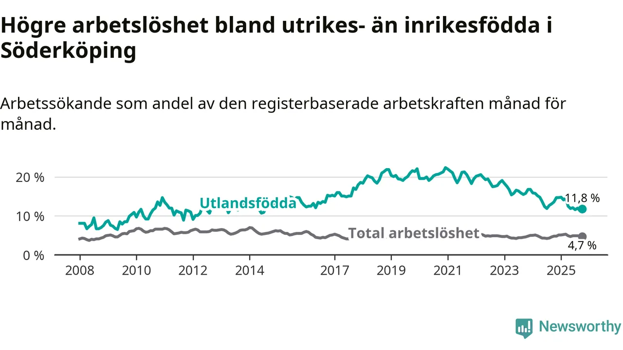 Arbetslösheten bland utlandsfödda var 11,8 procent i Söderköping under oktober månad, motsvarande 68 av 576 personer. Det är 1,8 procentenheter färre än vid samma tidpunkt i fjol (−13 om man räknar personer). Därmed har de utlandsföddas arbetslöshet varit lägre än vid samma tidpunkt i fjol i över två år i sträck. Sedan november 2022 har arbetslösheten bland utlandsfödda minskat från 18,6 till 11,8 procent.