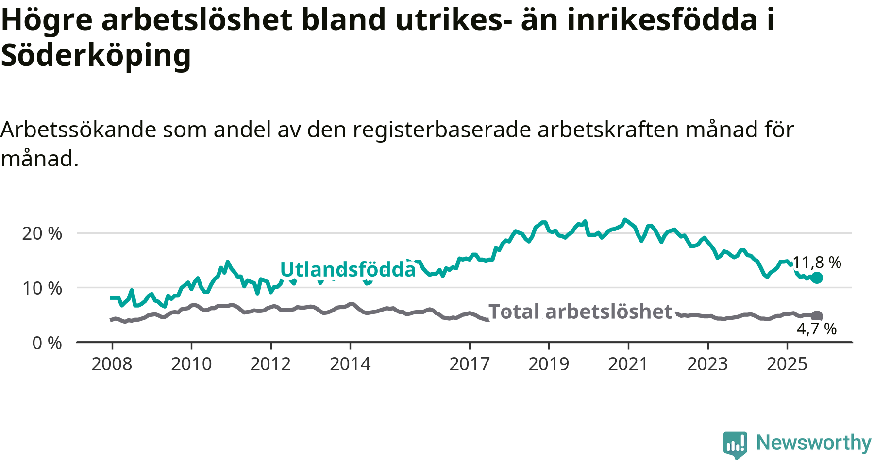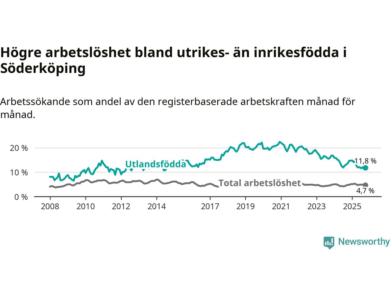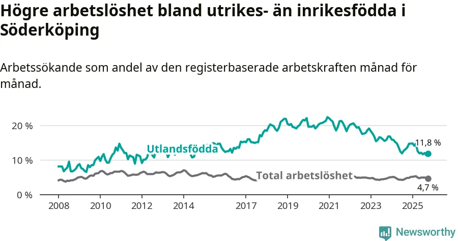 Skillnaden i arbetslöshet mellan utrikesfödda och hela befolkningen är 7,1 procentenheter i Söderköping. Det är en betydligt mindre skillnad än för ett år sedan (−1,7 procentenheter).