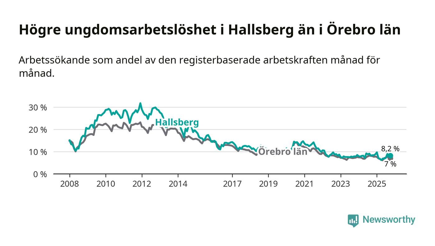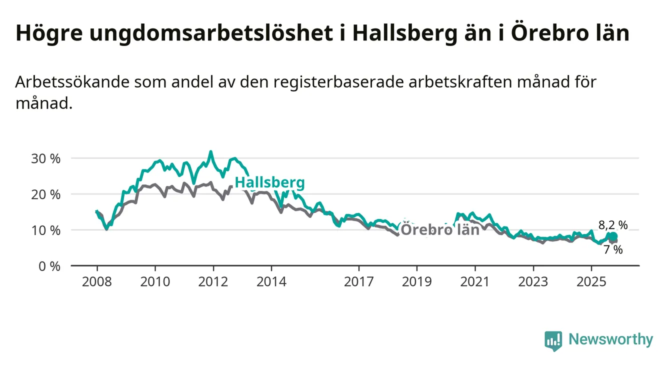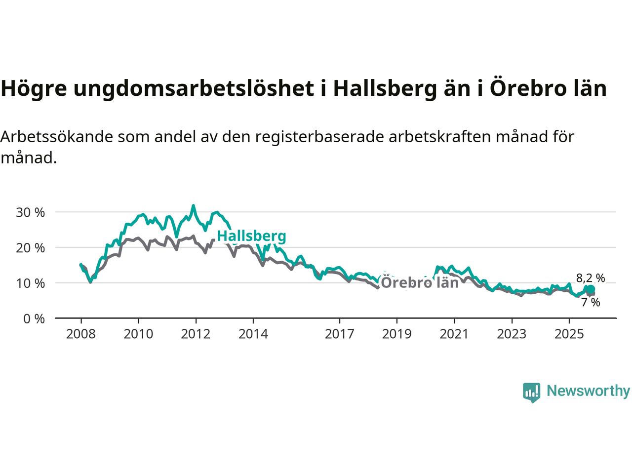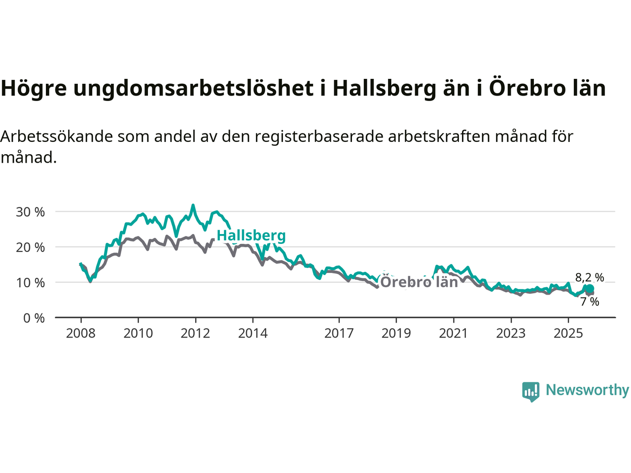 Medan Hallsberg har lägre total arbetslöshet än Örebro, ligger ungdomsarbetslösheten 1,2 procentenheter högre i Hallsberg.
