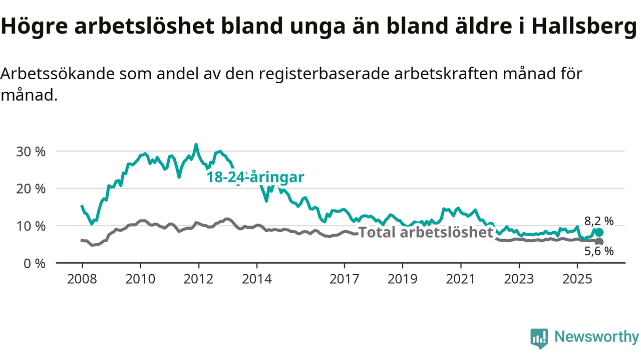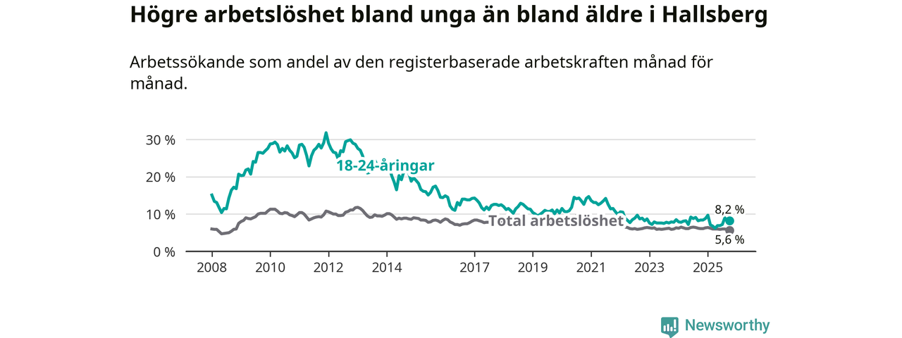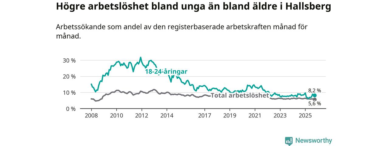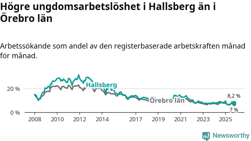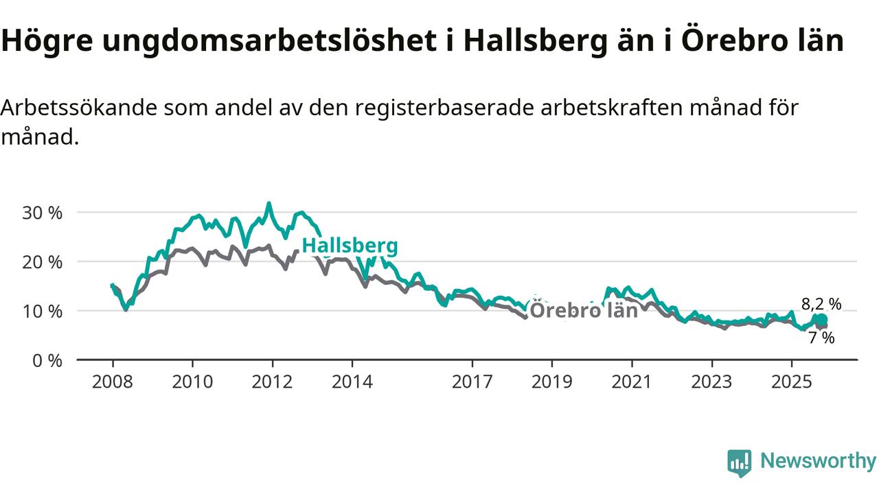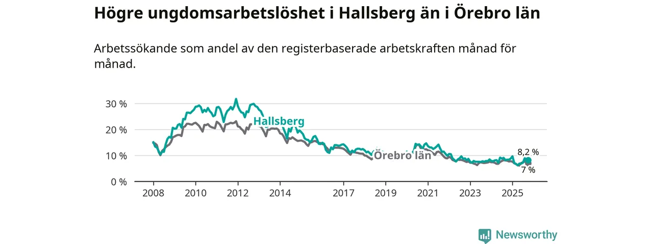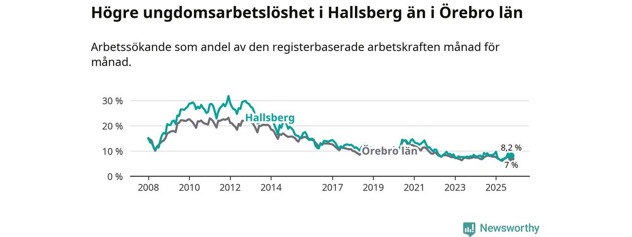 Medan Hallsberg har lägre total arbetslöshet än Örebro, ligger ungdomsarbetslösheten 1,2 procentenheter högre i Hallsberg.
