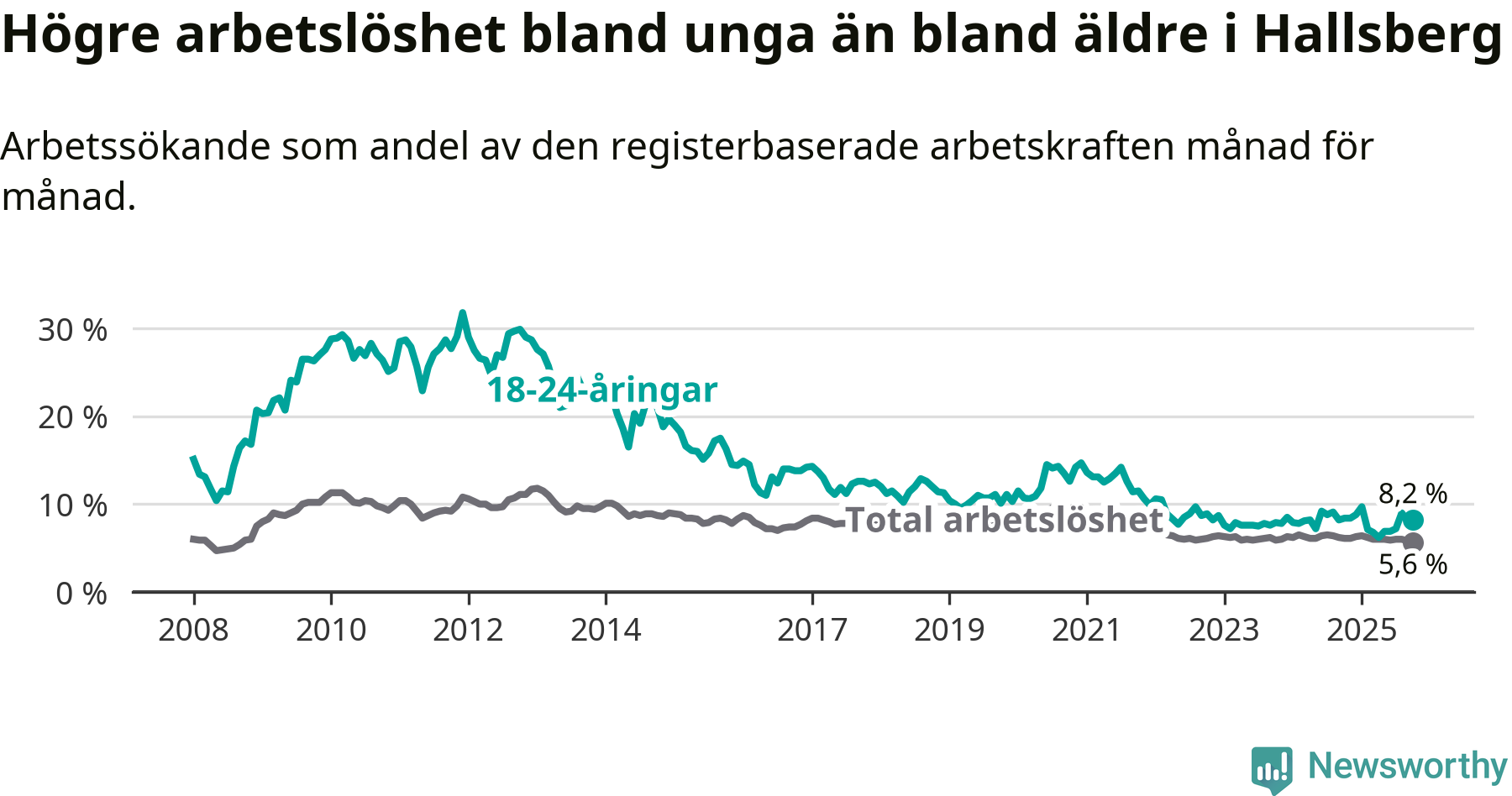 I och med den senaste månadens nedgång har de ungas arbetslöshet i Hallsberg sjunkit nio månader i följd (ner från 9,7 procent i januari till 8,2 procent nu).