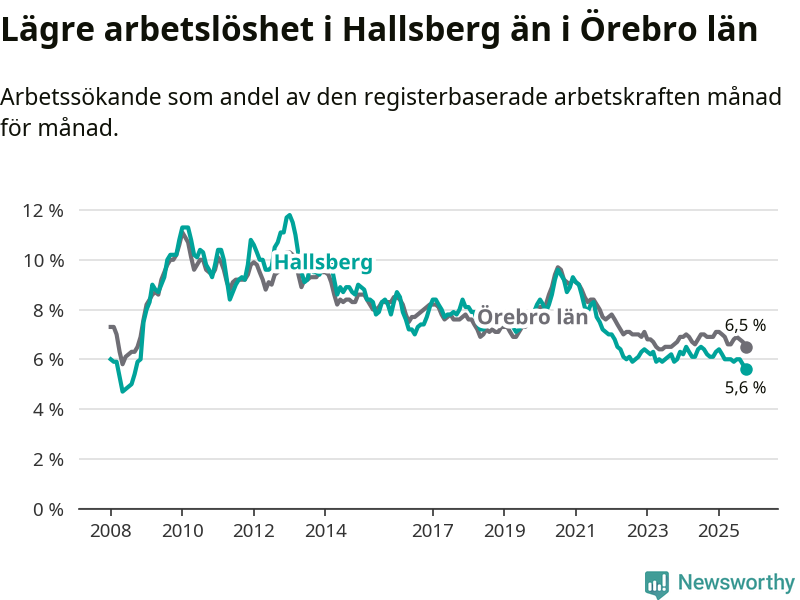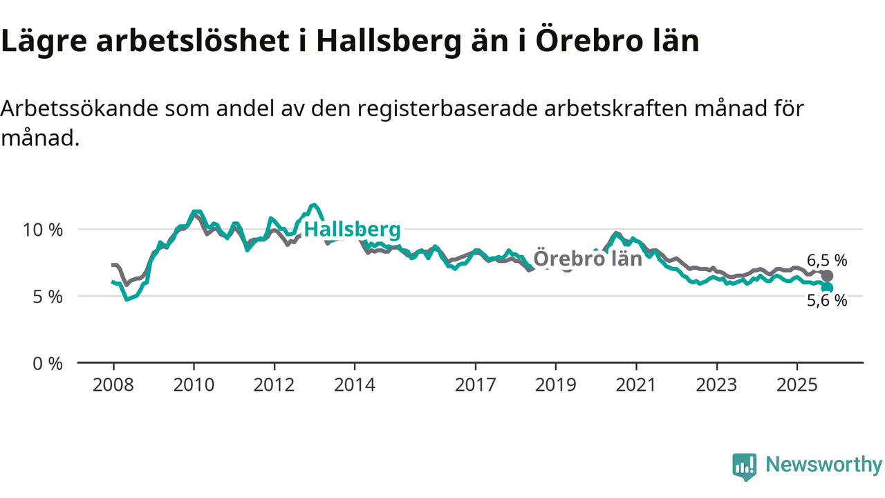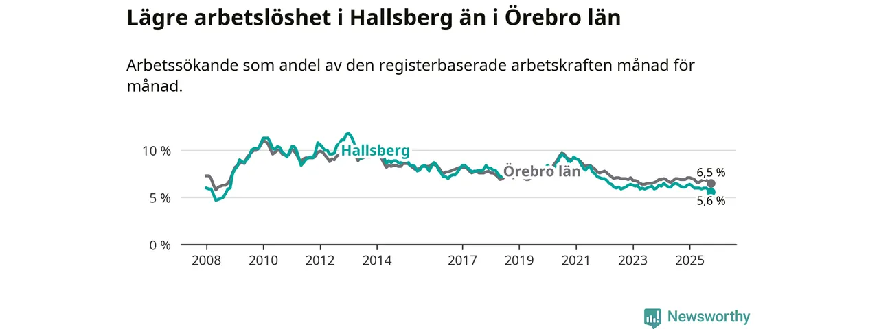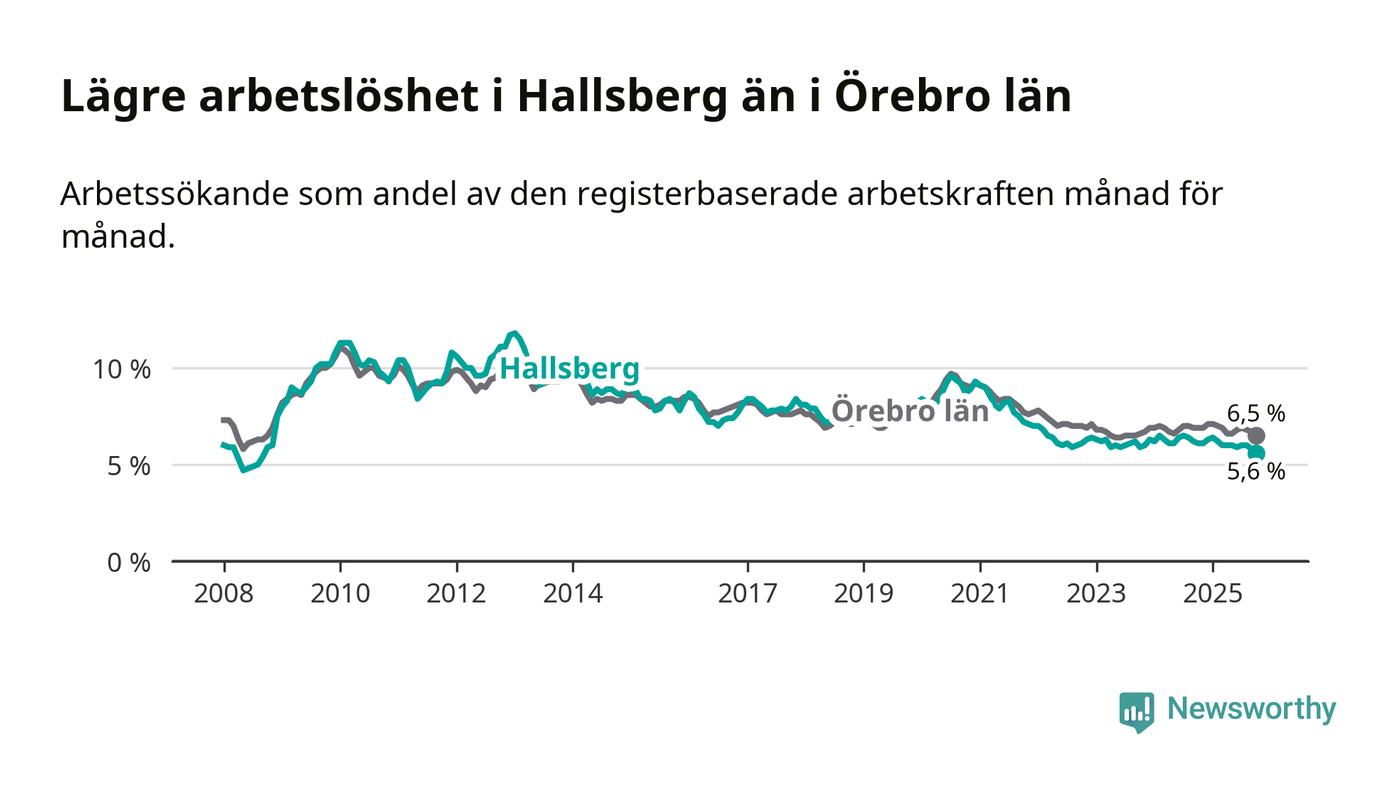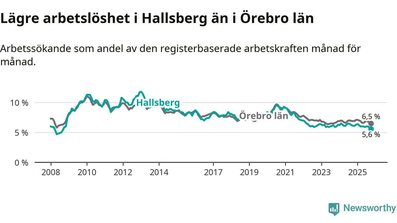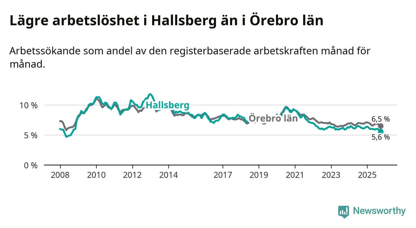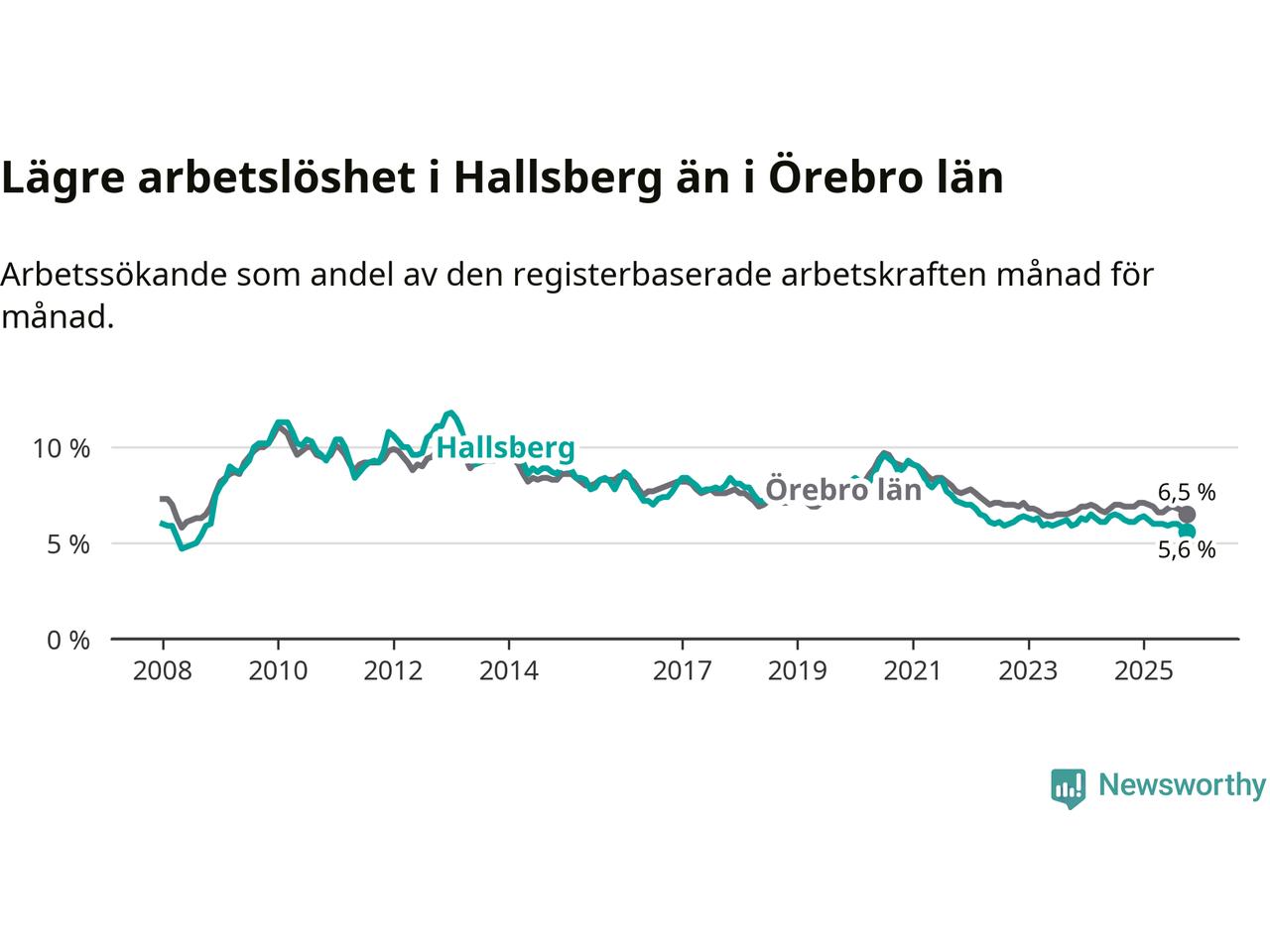 Under oktober månad rapporterade Hallsbergs kommun en total arbetslöshet på 5,6 procent. Det är en minskning jämfört med samma tidpunkt i fjol (−0,5 procentenheter). Även i Örebro län sjunker arbetslösheten .