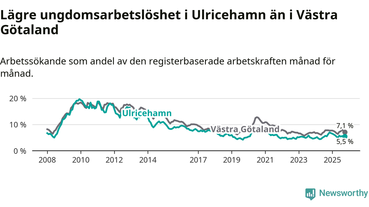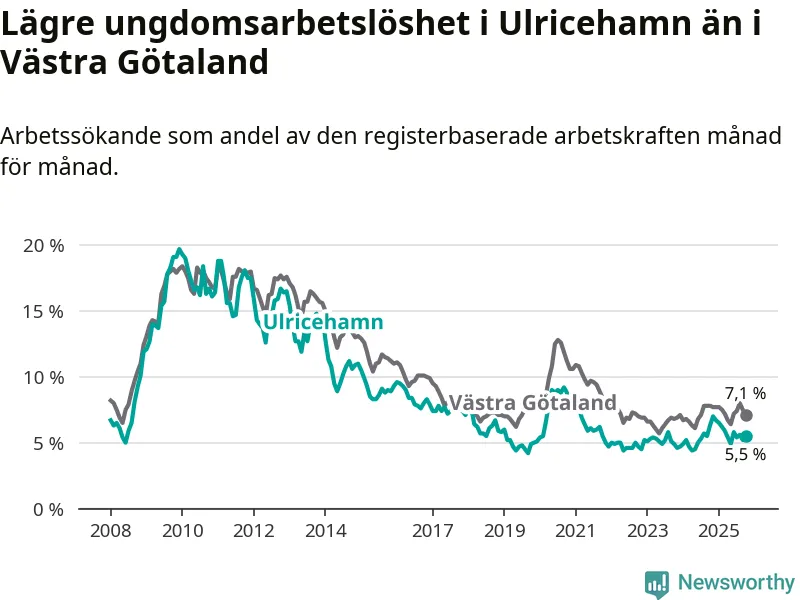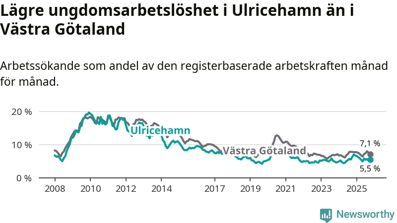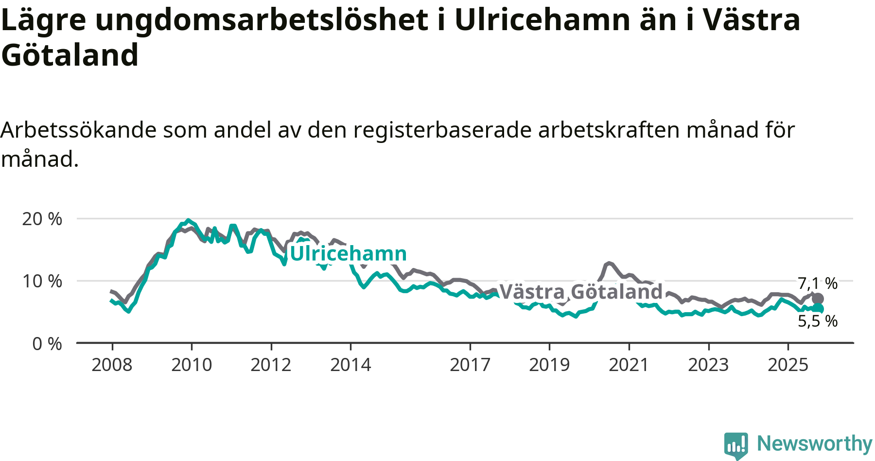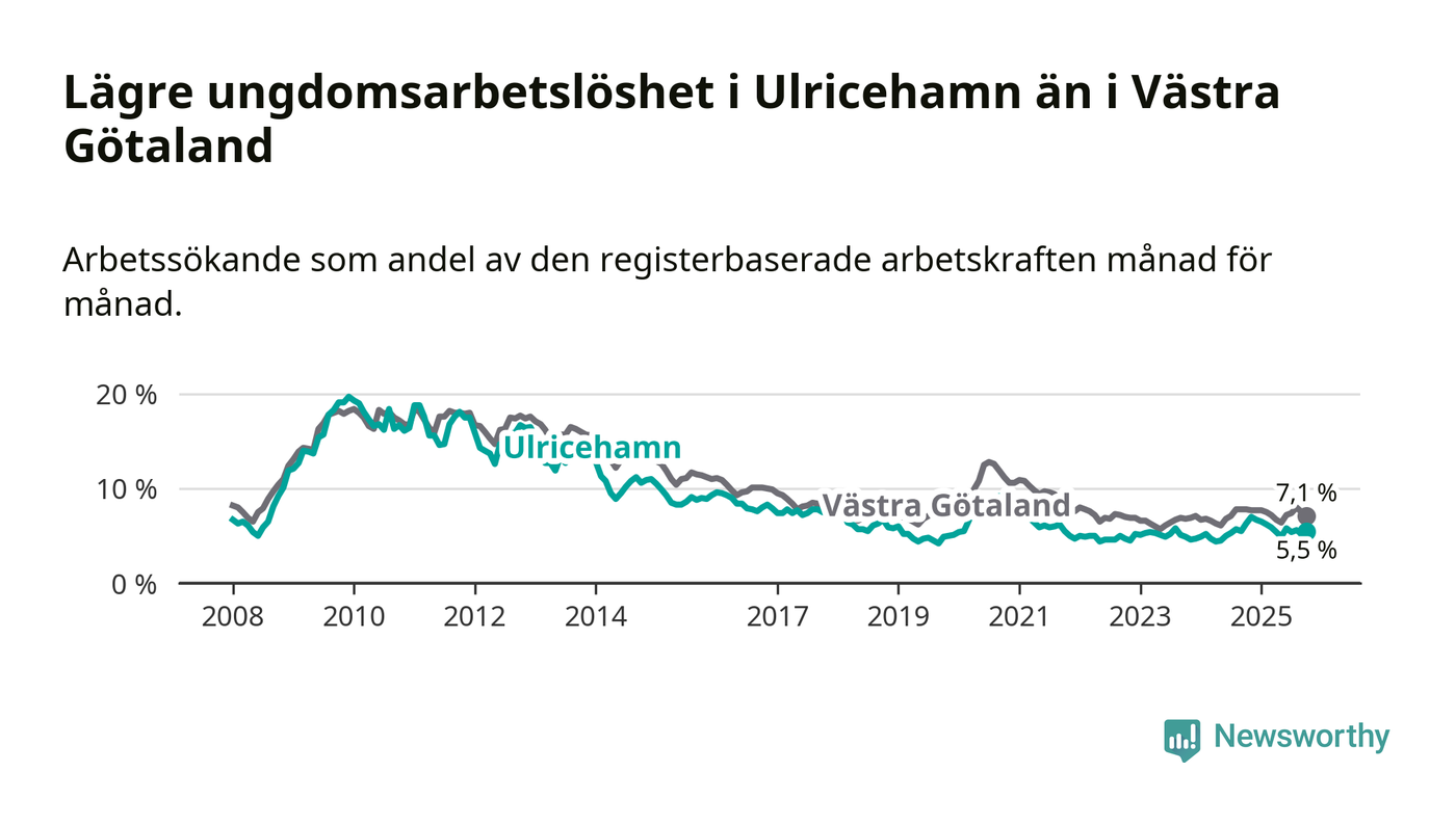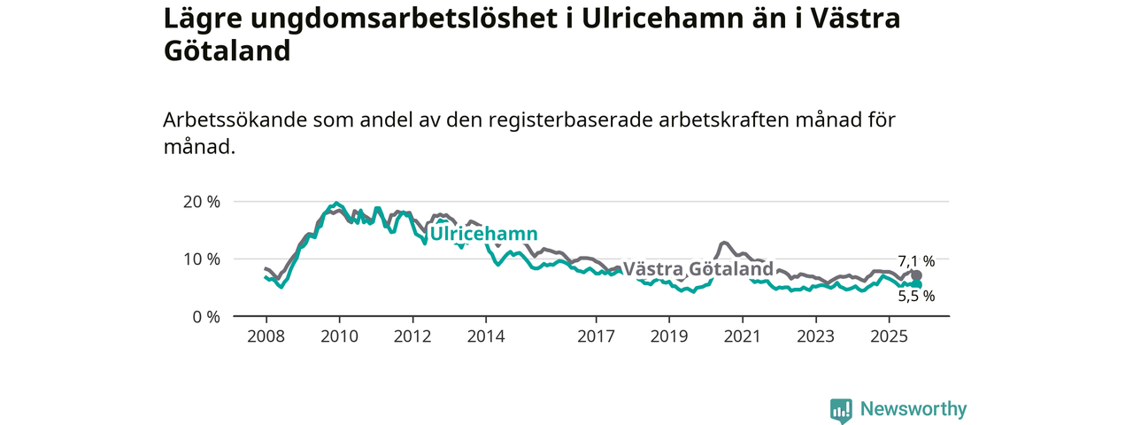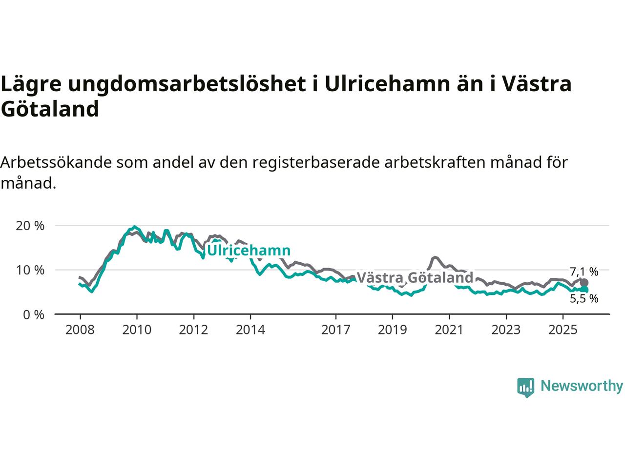 Precis som den totala arbetslösheten ligger ungdomsarbetslösheten i Ulricehamn lägre än i Västra Götaland som helhet. Skillnaden mellan kommunen och länet är 1,6 procentenheter.