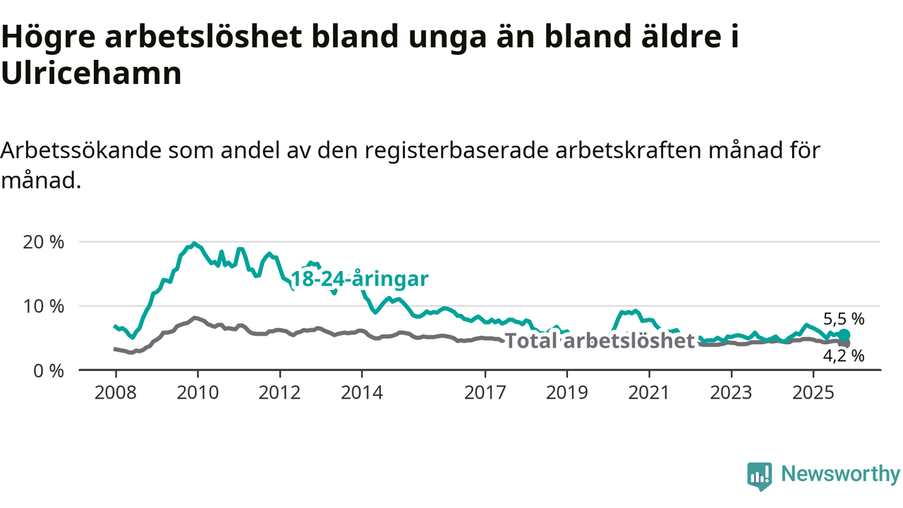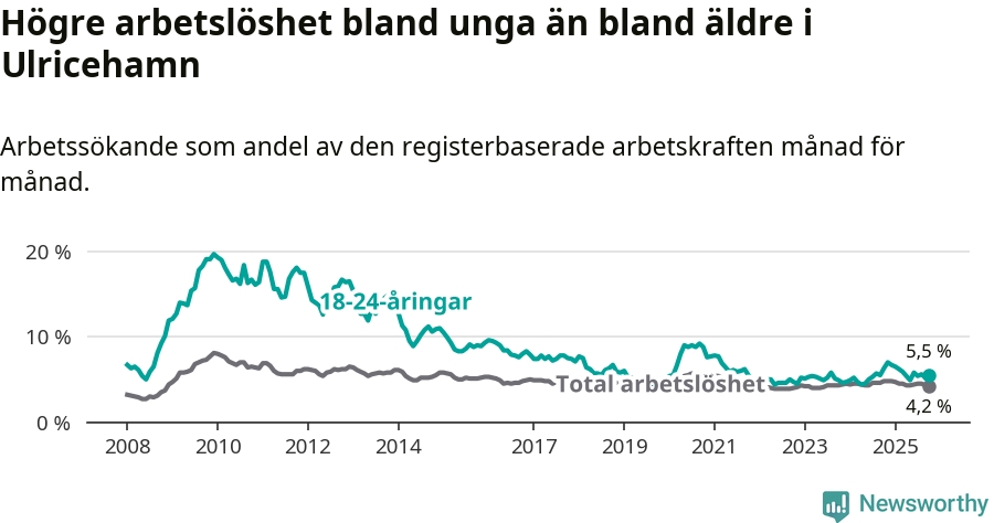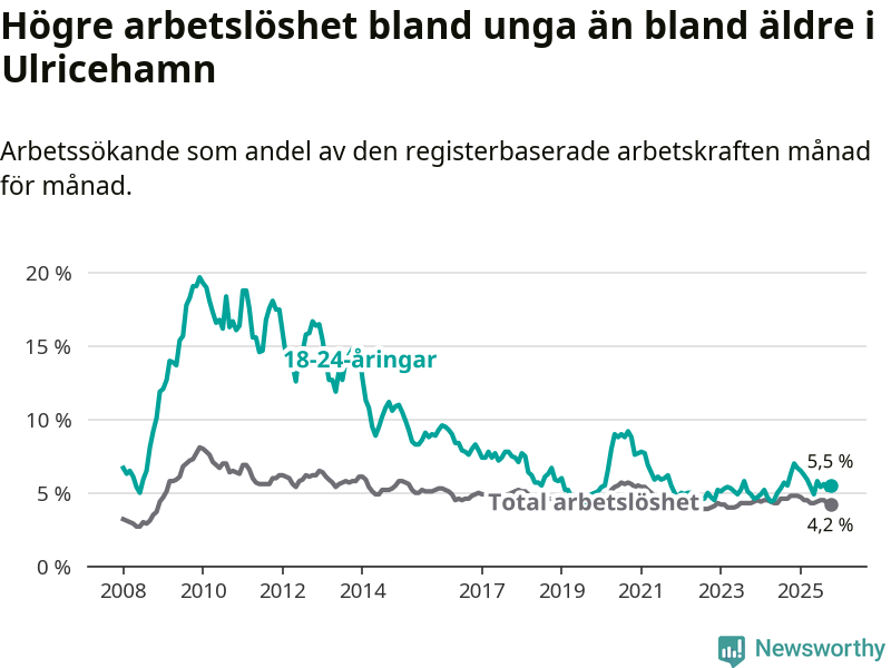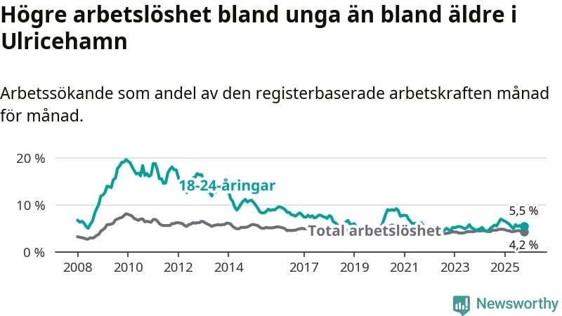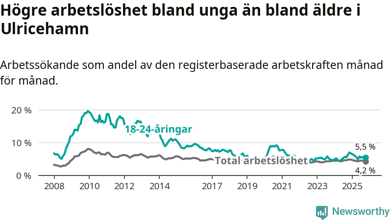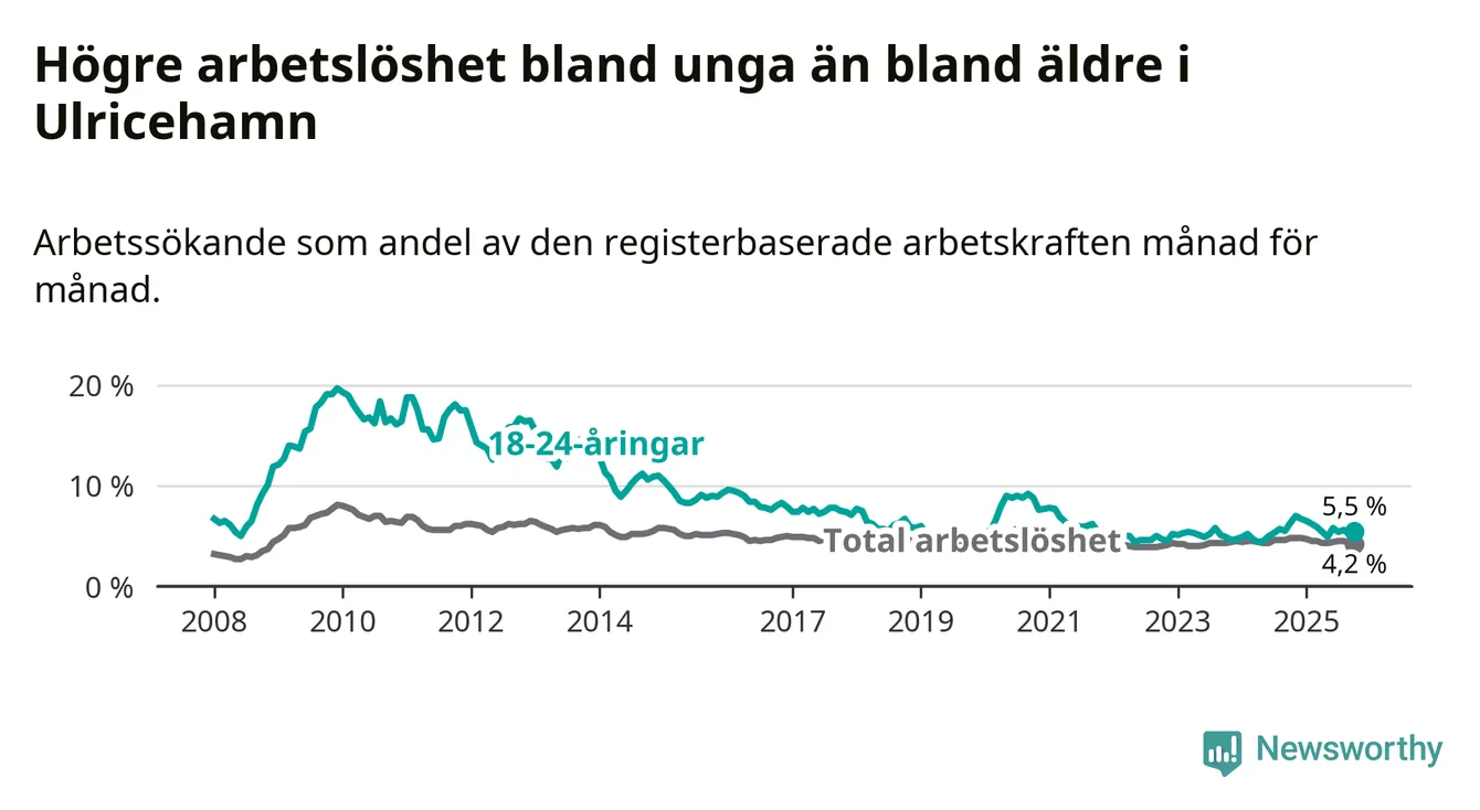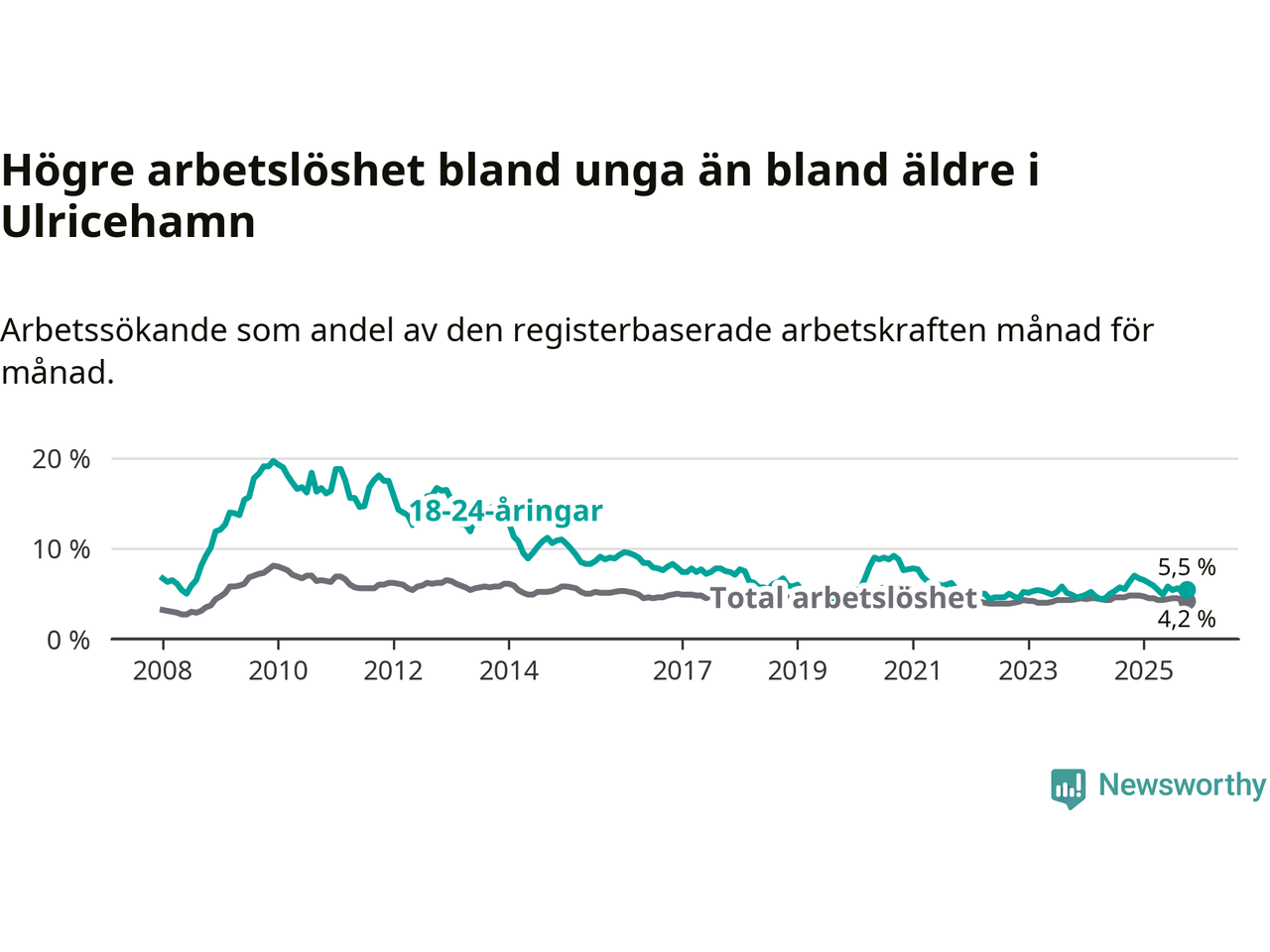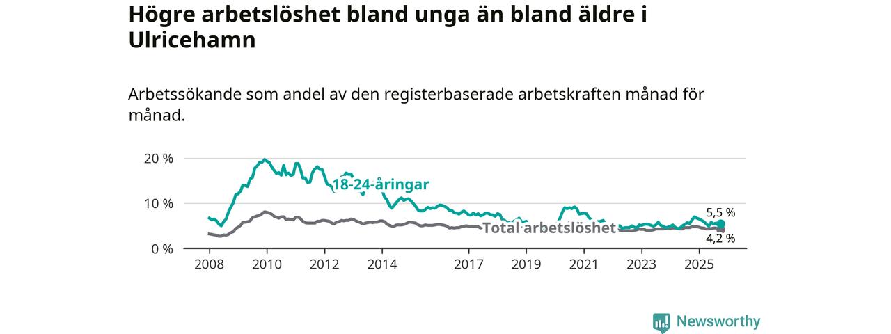 Precis som den totala arbetslösheten ligger ungdomsarbetslösheten i Ulricehamn lägre än i Västra Götaland som helhet. Skillnaden mellan kommunen och länet är 1,6 procentenheter.