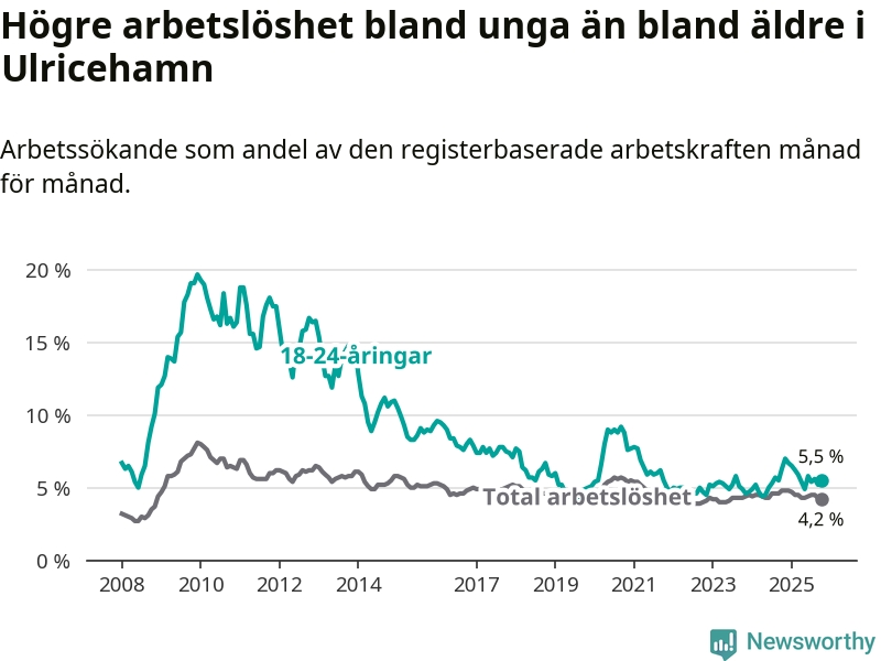 | Bland ungdomar | 5,5 % | −0,8 % ▼ | 7,1 % | −0,7 % ▼ | 7,8 % | −0,5 % ▼ |