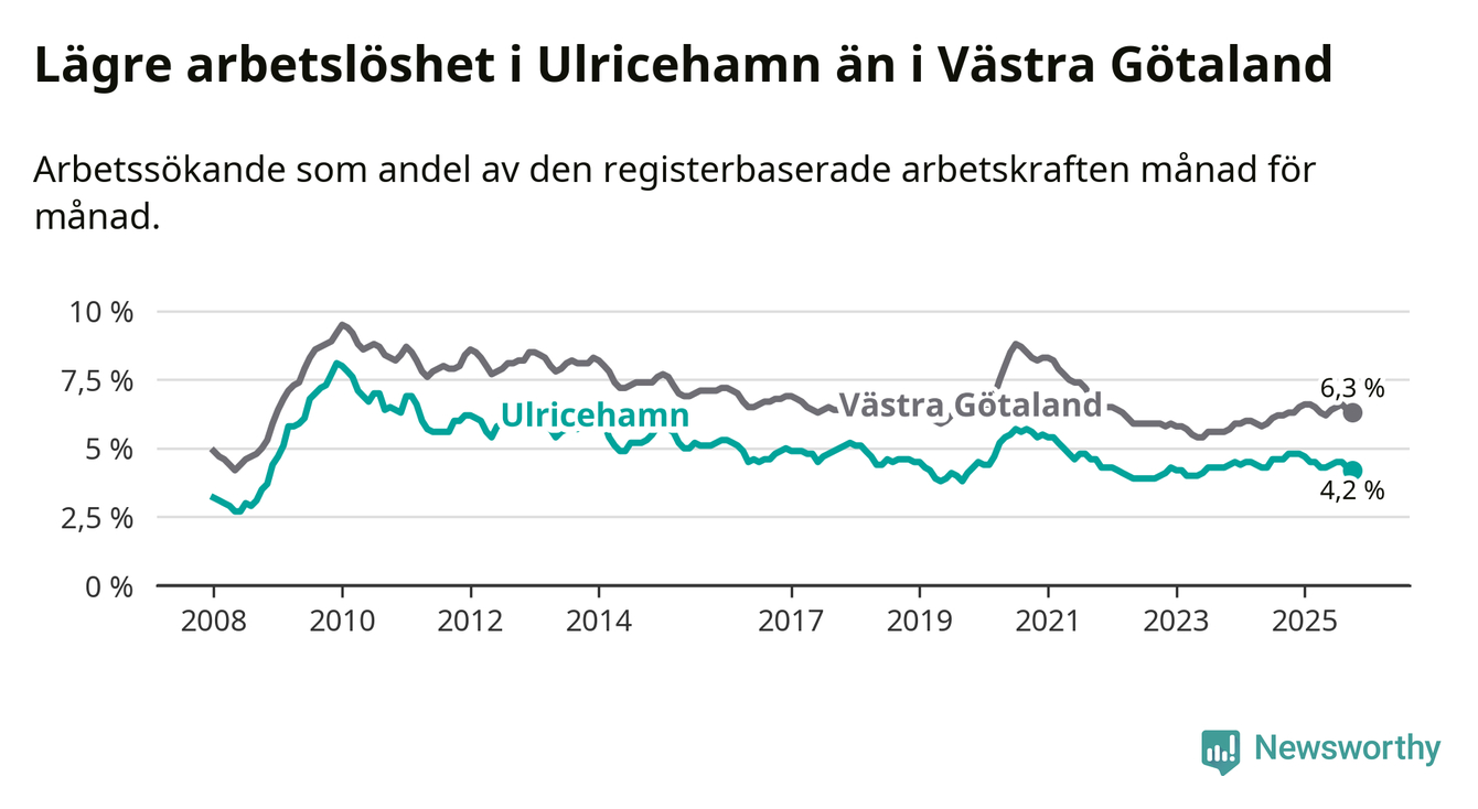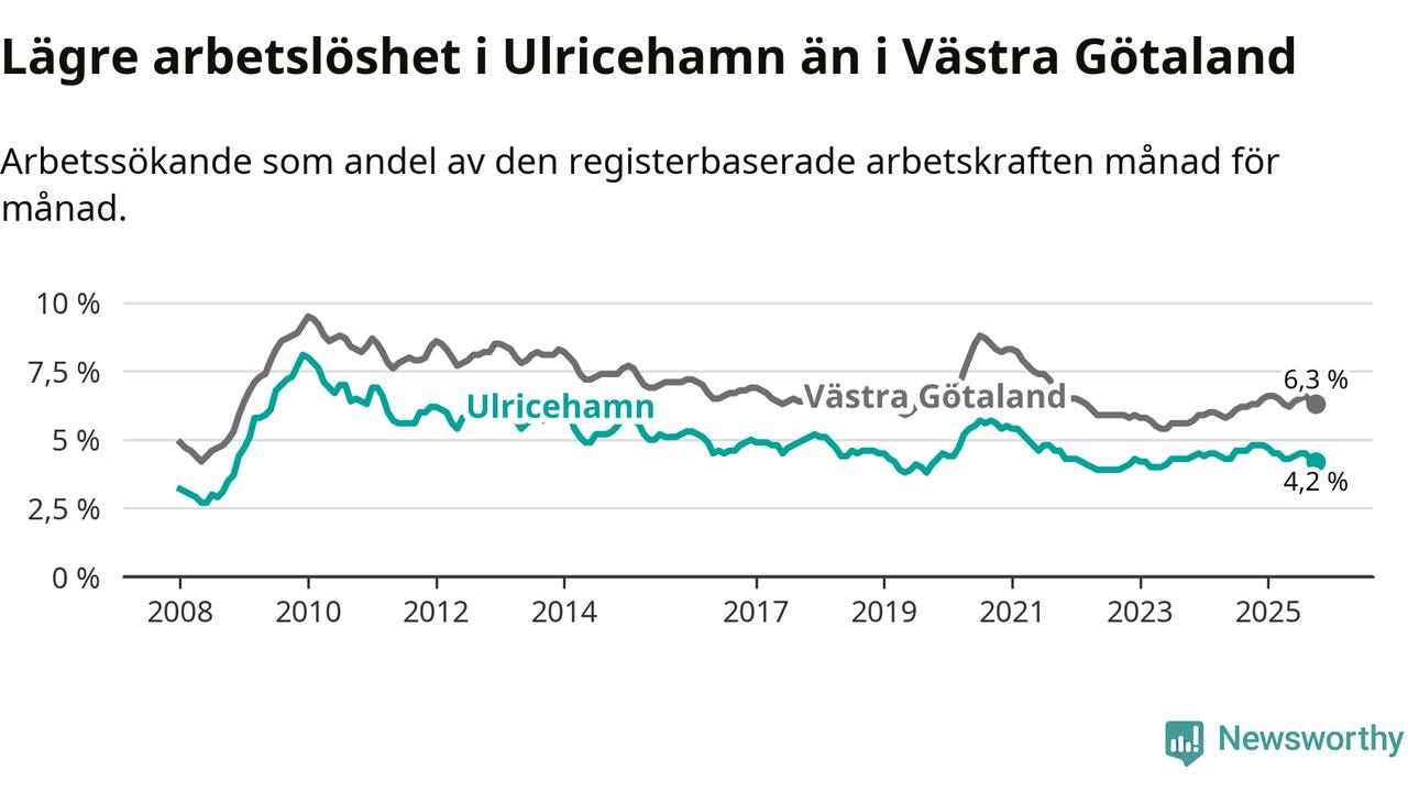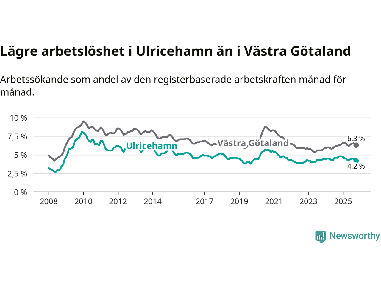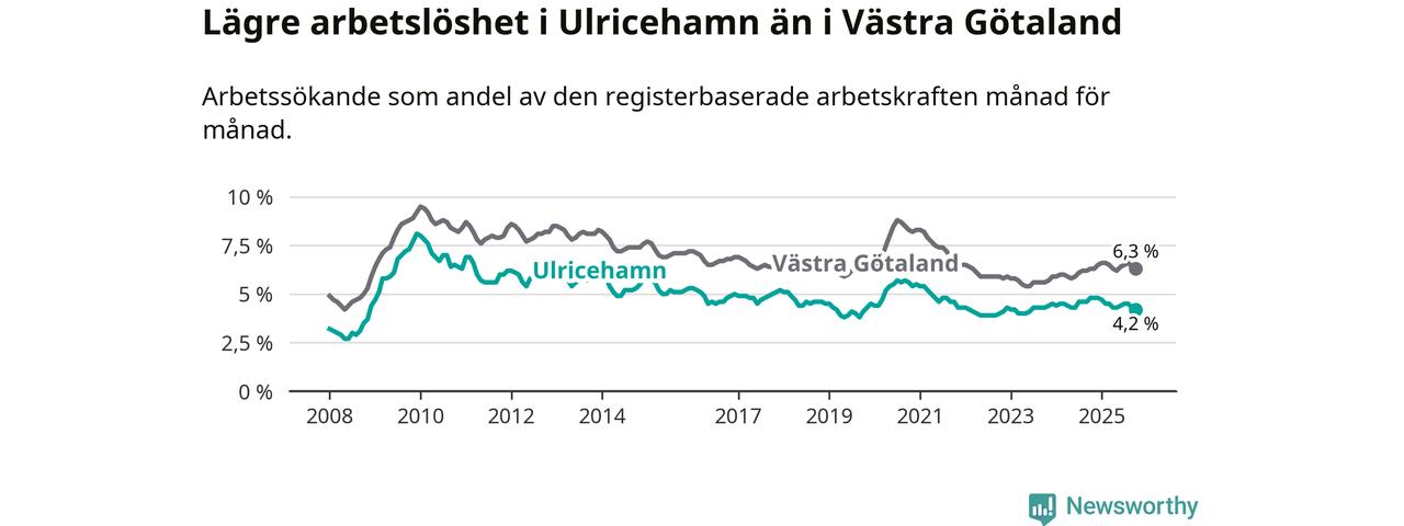 Under oktober månad rapporterade Ulricehamns kommun en total arbetslöshet på 4,2 procent. Det är en minskning jämfört med samma tidpunkt i fjol (−0,6 procentenheter). I Västra Götalands län däremot står arbetslösheten stilla.