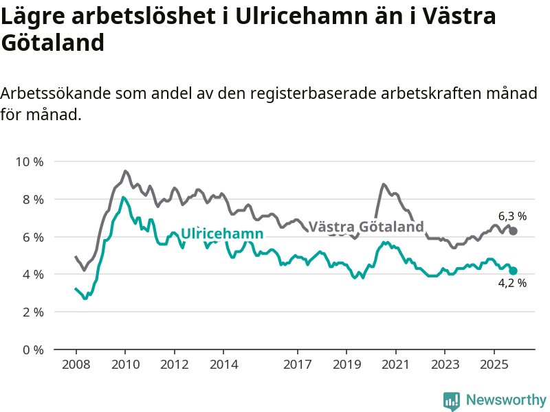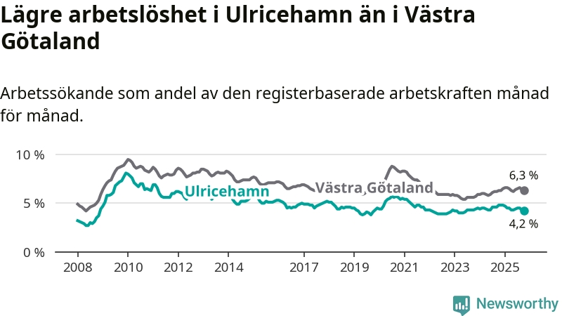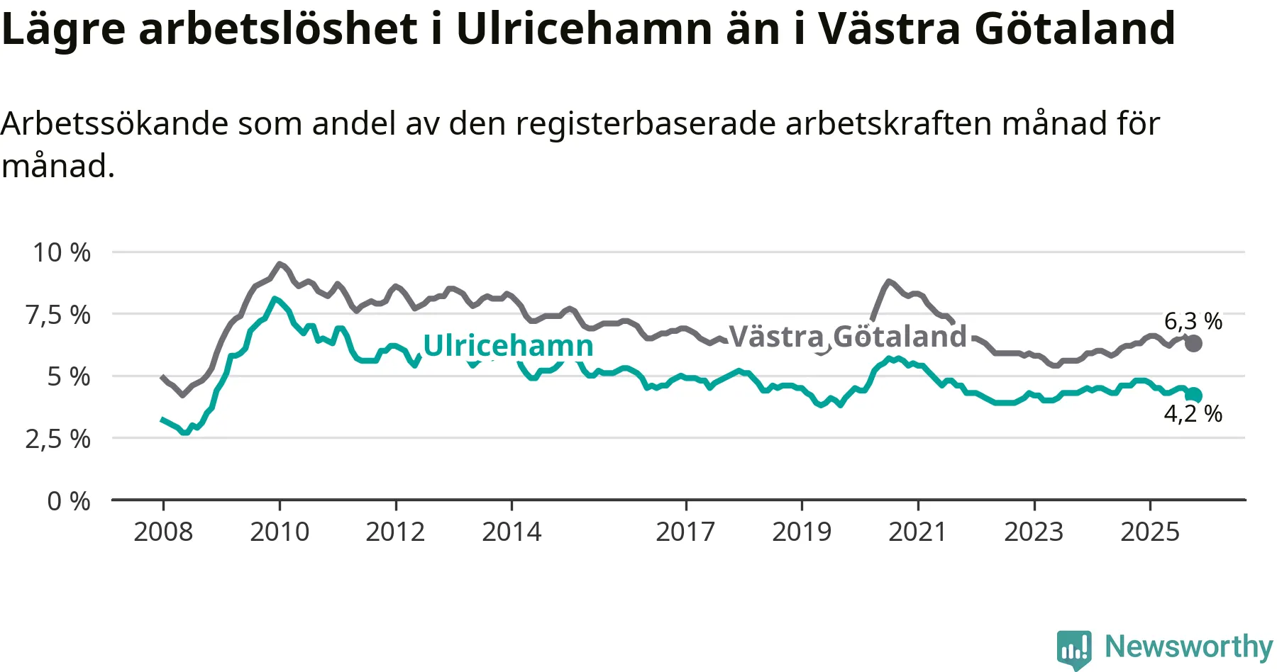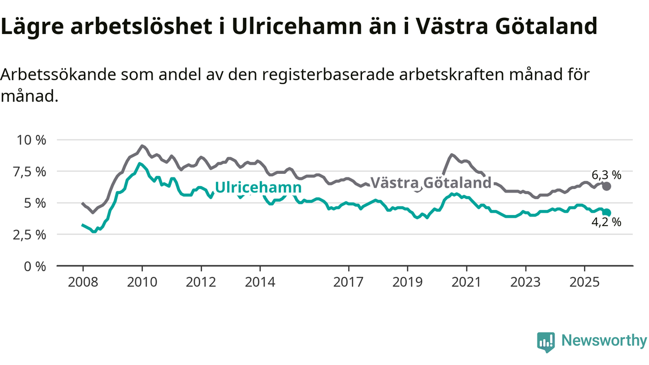Under oktober månad rapporterade Ulricehamns kommun en total arbetslöshet på 4,2 procent. Det är en minskning jämfört med samma tidpunkt i fjol (−0,6 procentenheter). I Västra Götalands län däremot står arbetslösheten stilla.