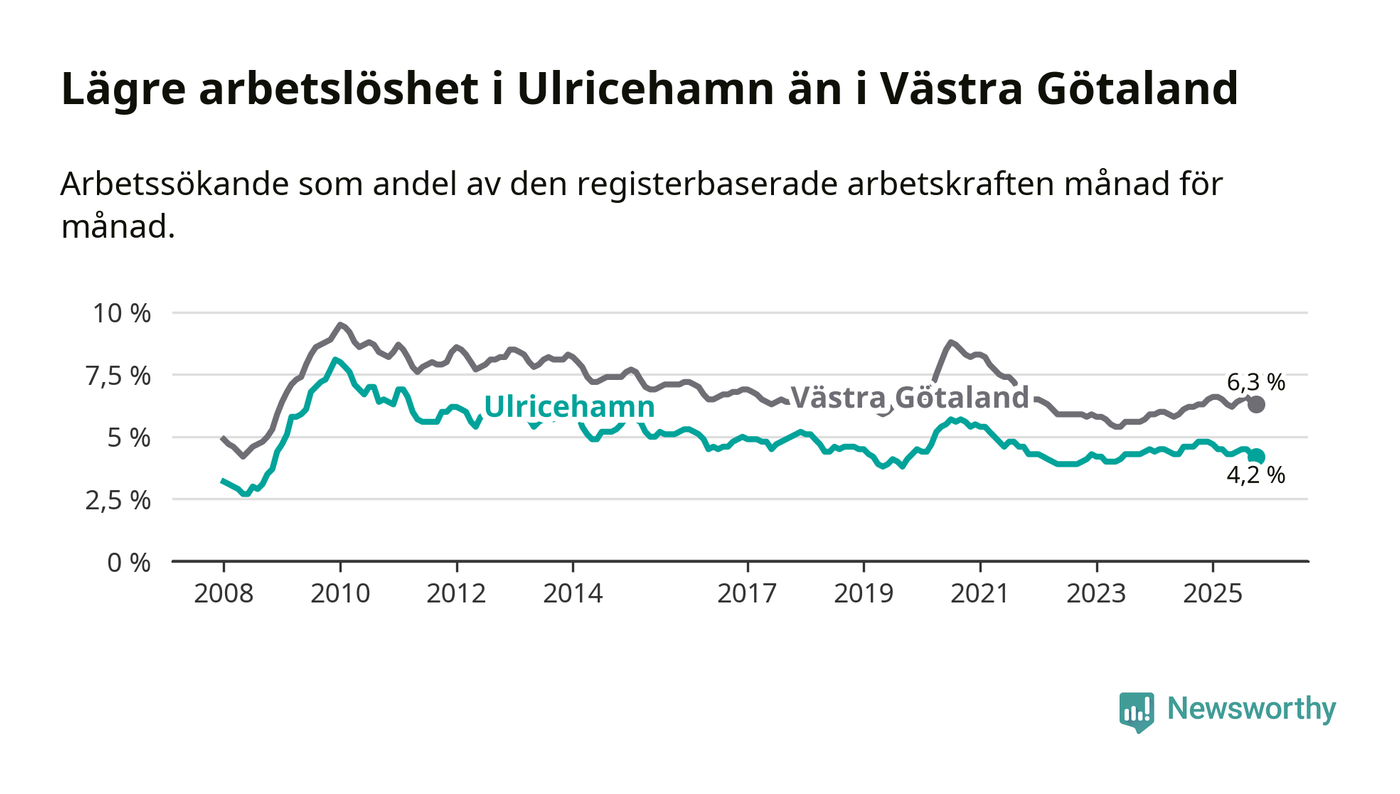 Ulricehamn hade redan tidigare lägre arbetslöshet än snittet i hela Västra Götalands län och nu växer klyftan (4,2 procent i kommunen, jämfört med 6,3 procent i hela länet). Öckerö har den lägsta arbetslösheten i länet (2,7 procent), medan Gullspång har den högsta (8,8 procent). För att Ulricehamn skulle komma ner i samma arbetslöshetsnivå som Öckerö skulle 184 personer behöva sysselsättas.