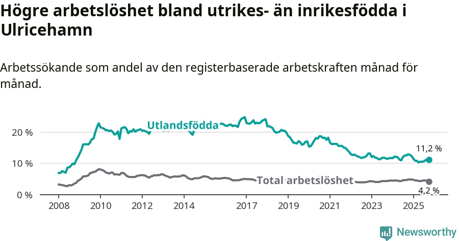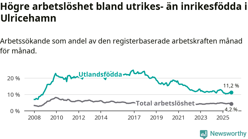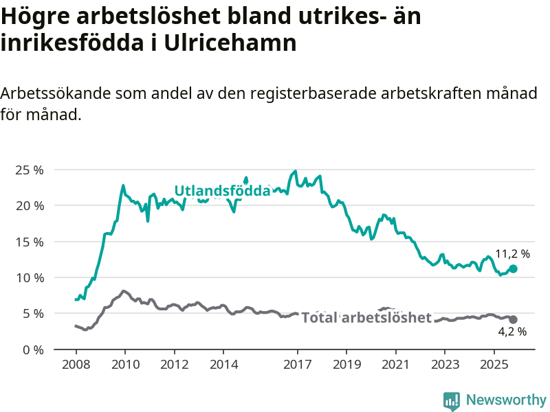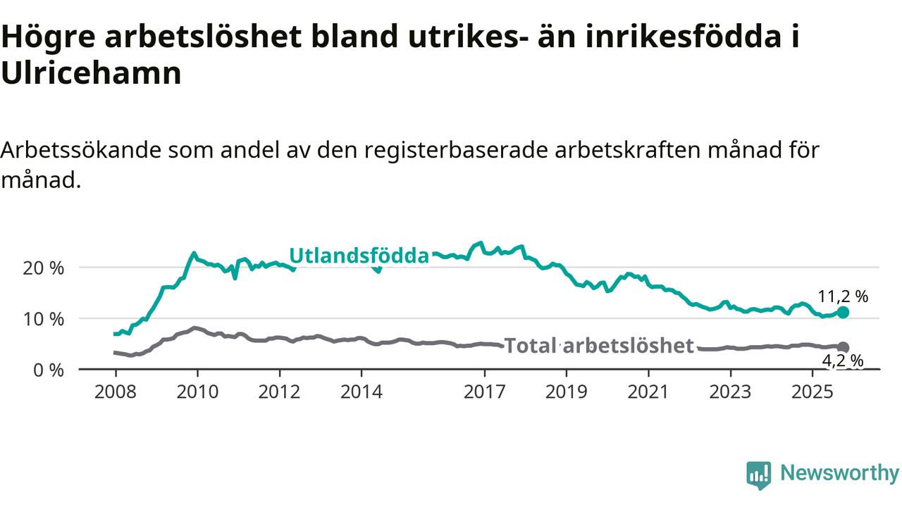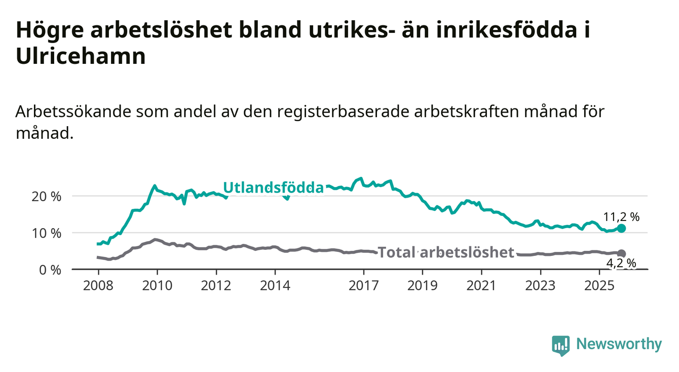 Arbetslösheten bland utlandsfödda var 11,2 procent i Ulricehamn under oktober månad, motsvarande 223 av 1 991 personer. Det är 1,7 procentenheter färre än vid samma tidpunkt i fjol (−36 om man räknar personer). Därmed är de utlandsföddas arbetslöshet lägre än vid samma tidpunkt i fjol för tionde månaden i följd. Sedan december 2024 har arbetslösheten bland utlandsfödda minskat från 12,3 till 11,2 procent.