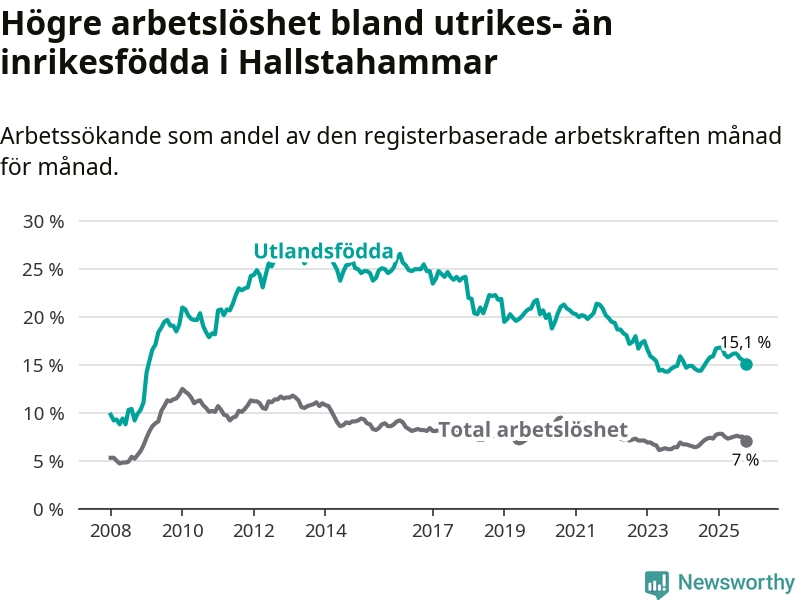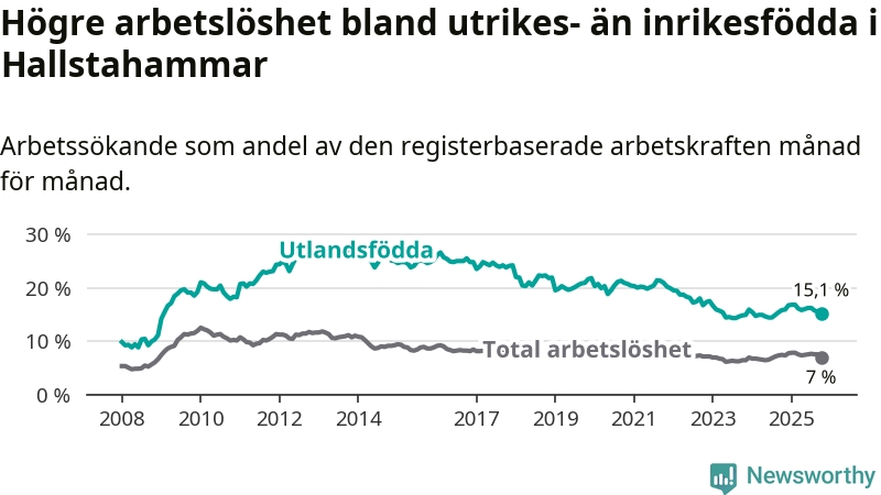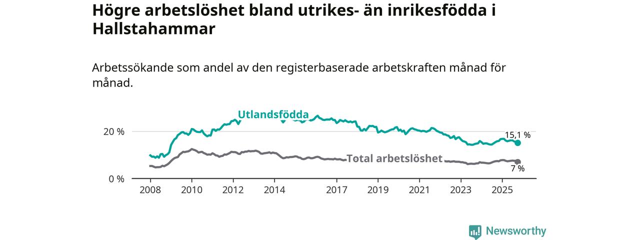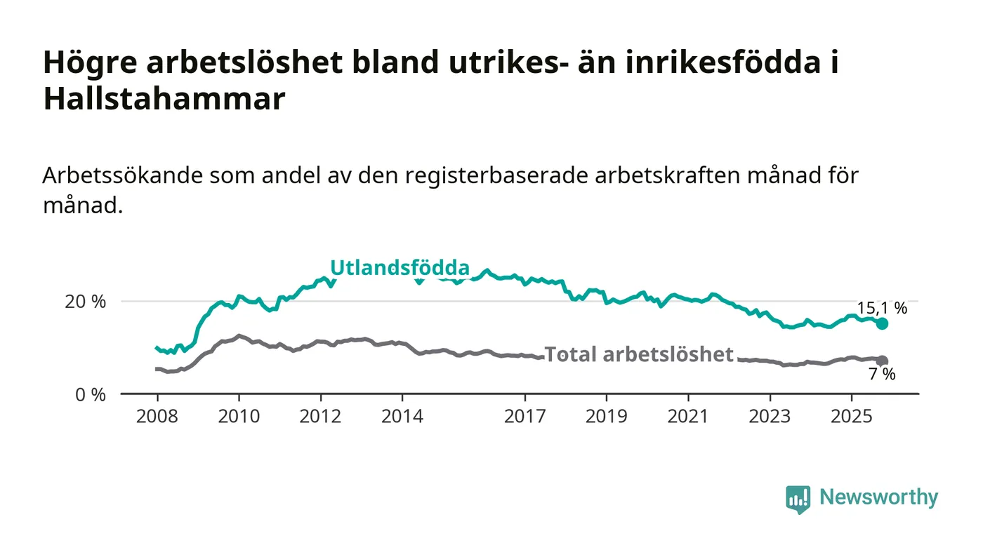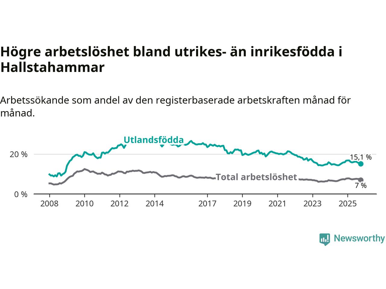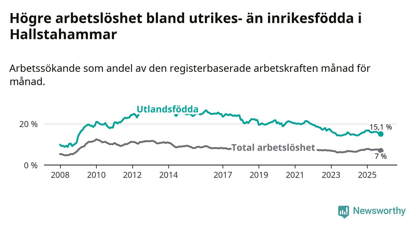 Arbetslösheten bland utlandsfödda var 15,1 procent i Hallstahammar under oktober månad, motsvarande 249 av 1 649 personer. Det är 0,7 procentenheter färre än vid samma tidpunkt i fjol (−10 om man räknar personer). Den senaste månadens nedgång innebär ett trendbrott. Under de 15 föregående månaderna hade arbetslösheten bland utlandsfödda varit högre än motsvarande tidpunkt året innan.
