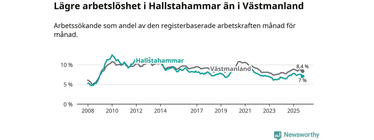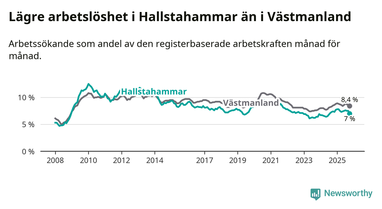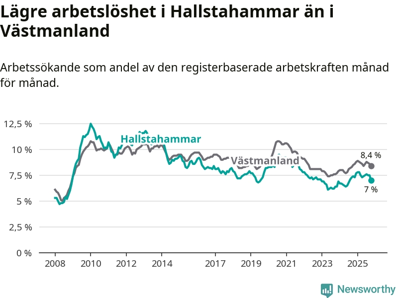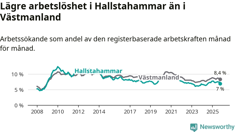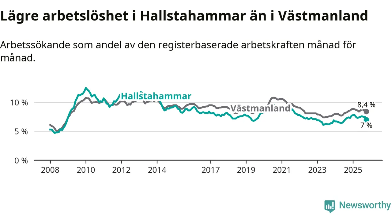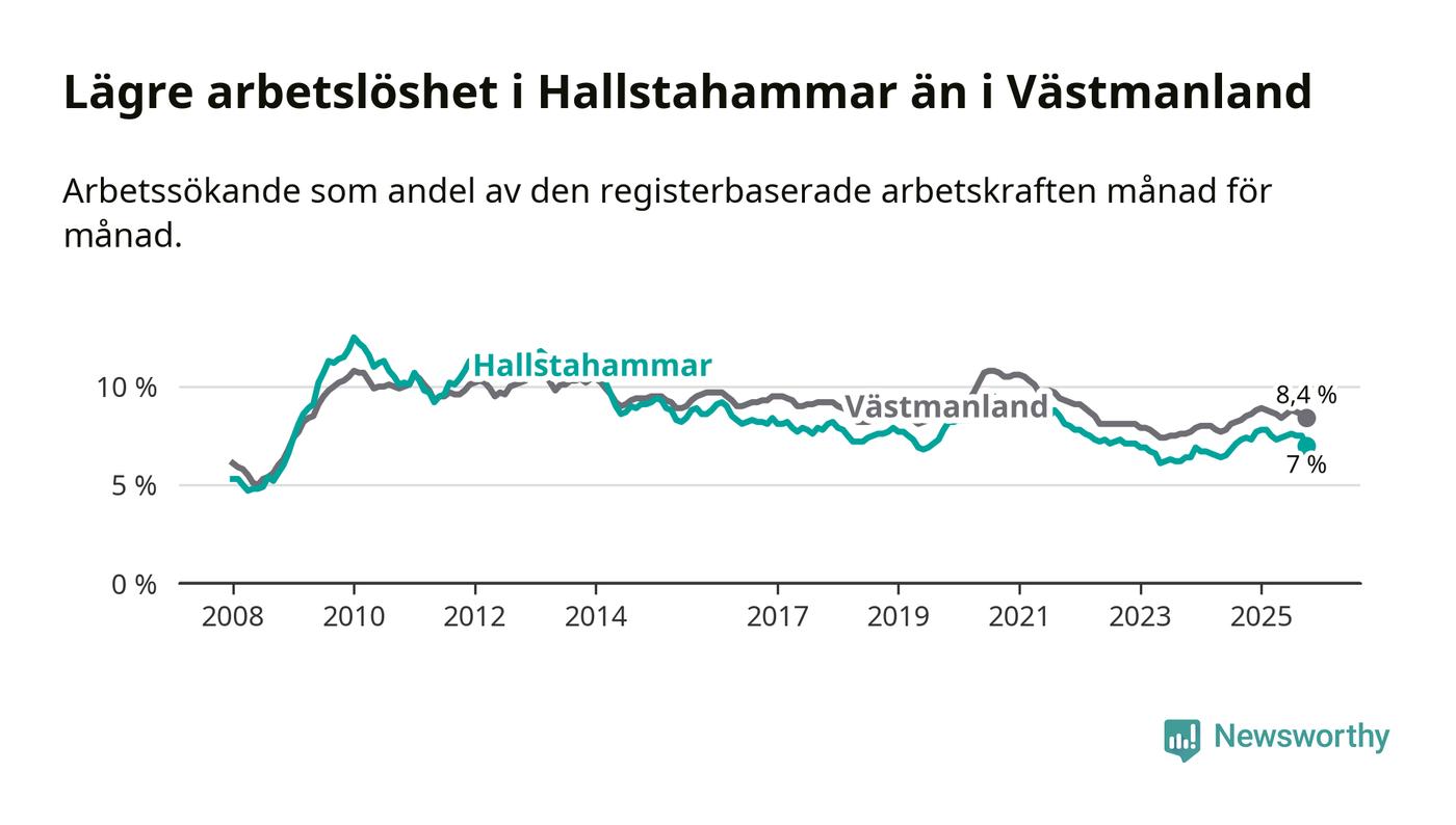 Hallstahammar hade redan tidigare lägre arbetslöshet än snittet i hela Västmanlands län och nu växer klyftan (7,0 procent i kommunen, jämfört med 8,4 procent i hela länet). Surahammar har den lägsta arbetslösheten i länet (6,4 procent), medan Fagersta har den högsta (9,2 procent). För att Hallstahammar skulle komma ner i samma arbetslöshetsnivå som Surahammar skulle 47 personer behöva sysselsättas.