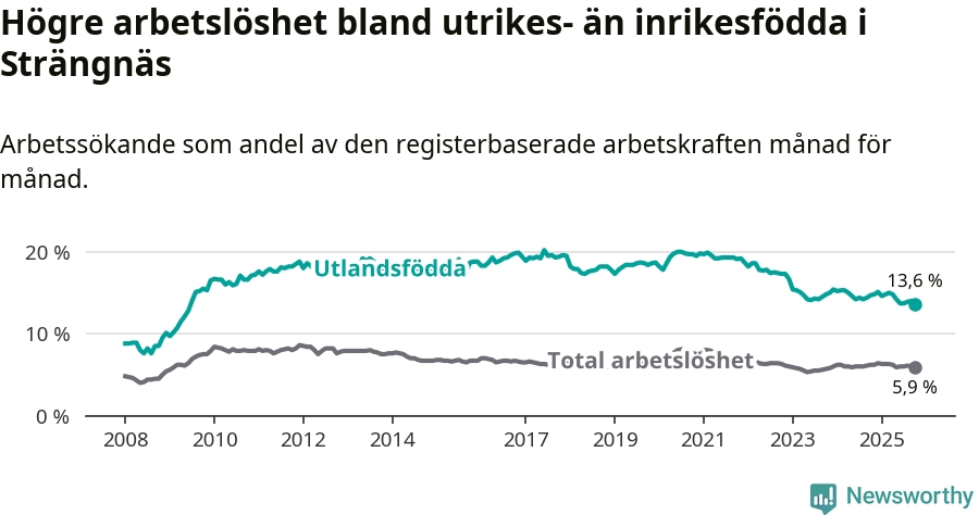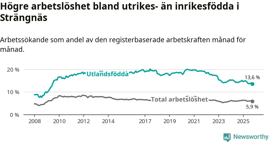 Skillnaden i arbetslöshet mellan utrikesfödda och hela befolkningen är 7,7 procentenheter i Strängnäs. Det är en mindre skillnad än för ett år sedan (−0,8 procentenheter).