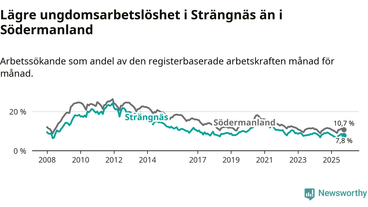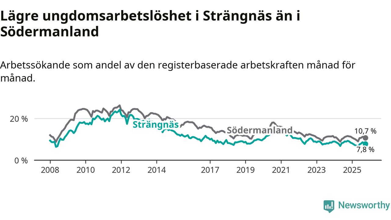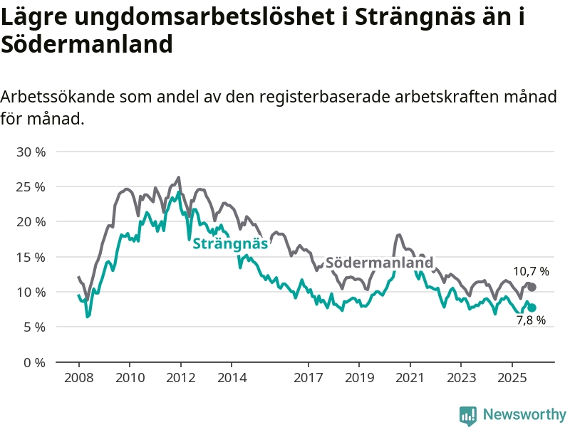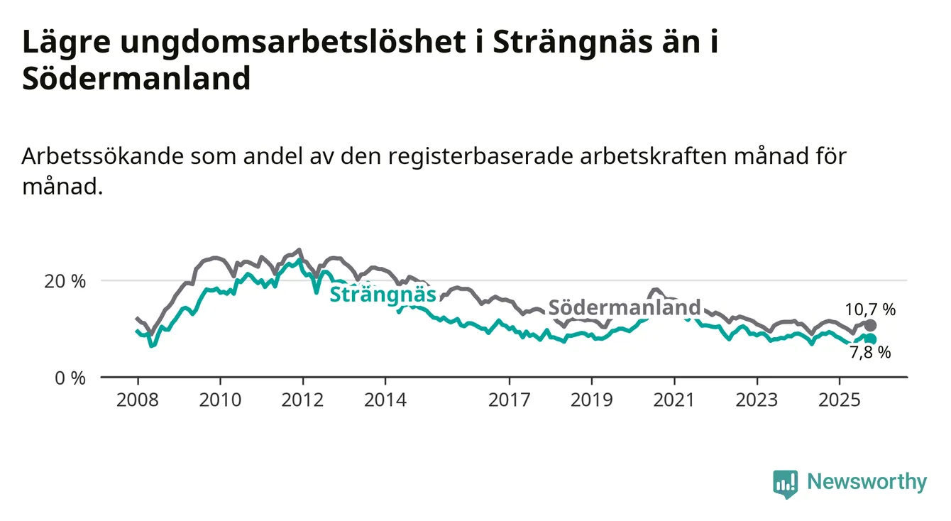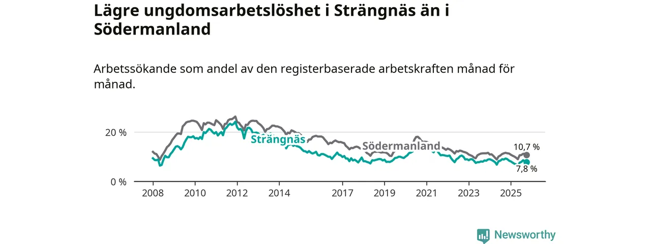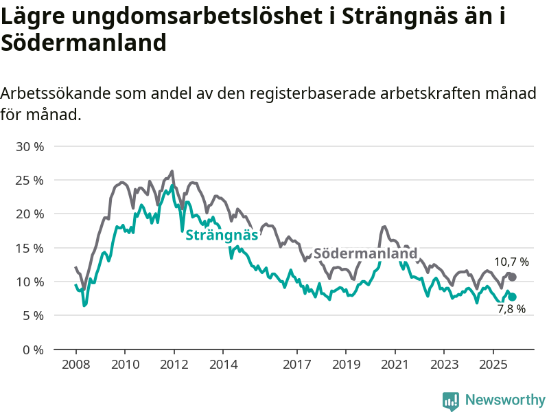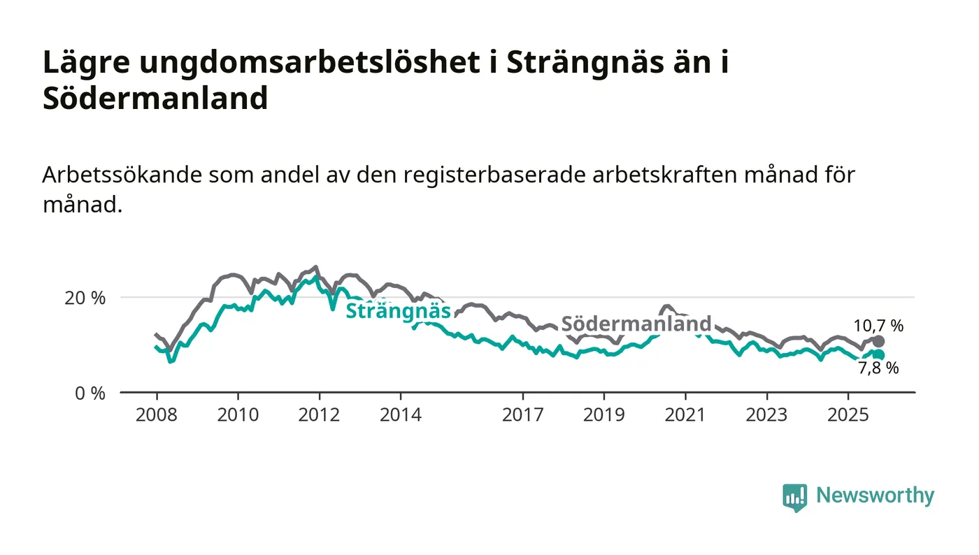 I och med den senaste månadens nedgång har de ungas arbetslöshet i Strängnäs sjunkit elva månader i följd (ner från 9,0 procent i november 2024 till 7,8 procent nu).