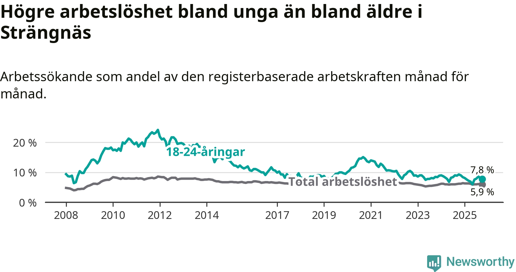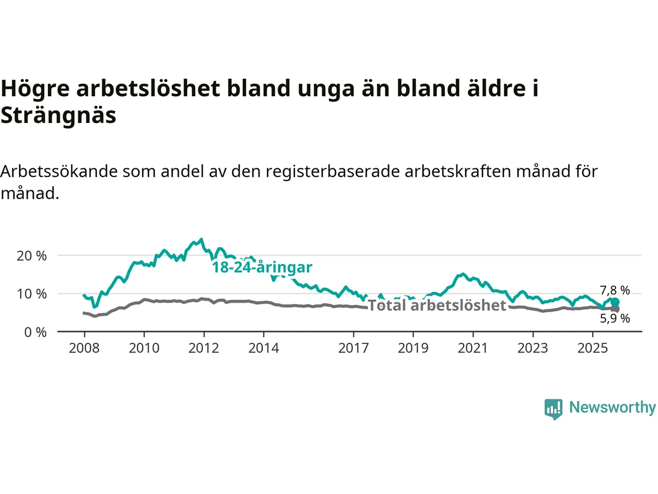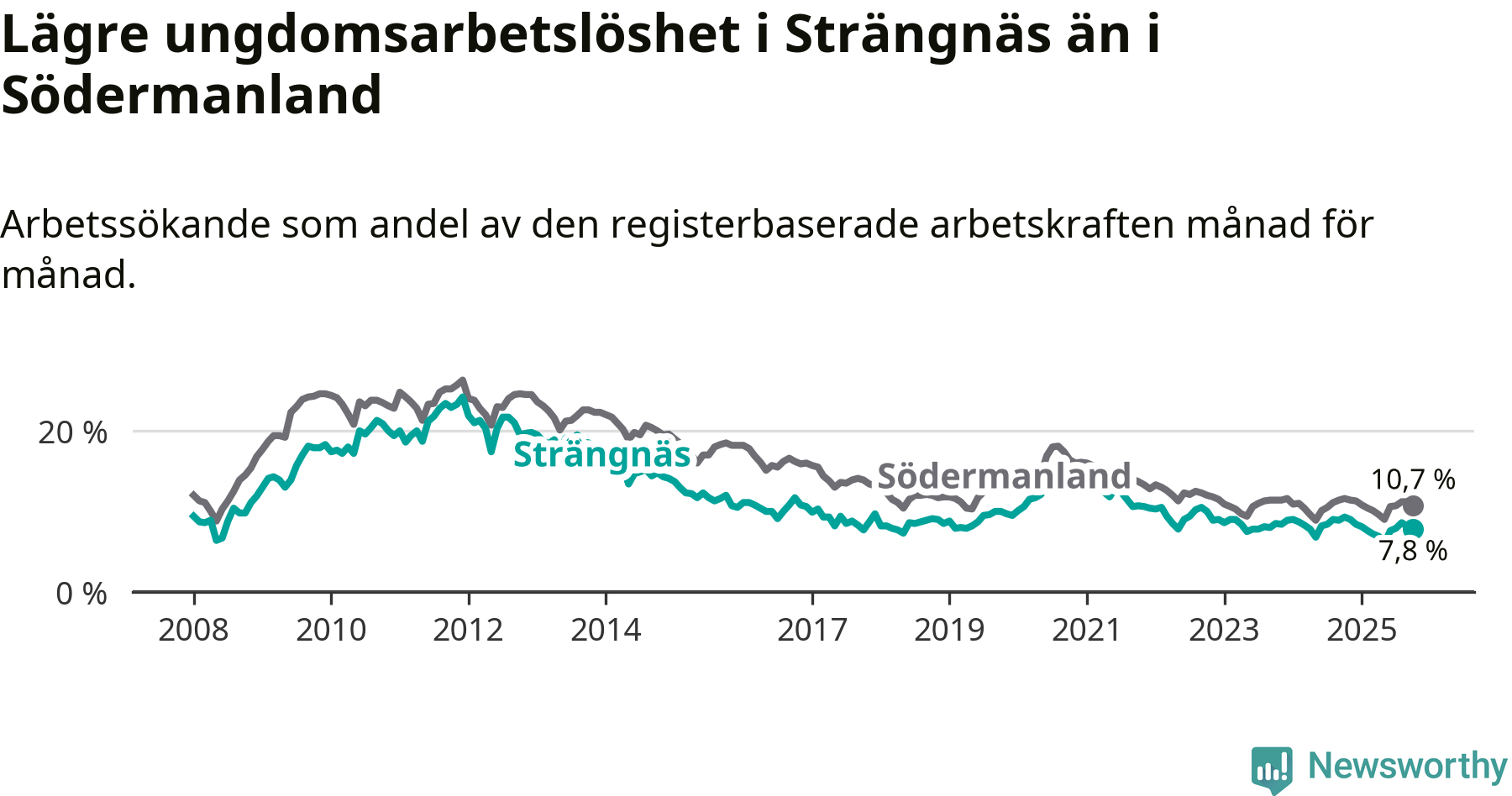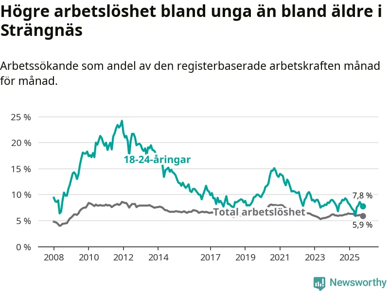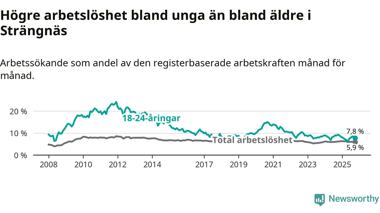 I och med den senaste månadens nedgång har de ungas arbetslöshet i Strängnäs sjunkit elva månader i följd (ner från 9,0 procent i november 2024 till 7,8 procent nu).
