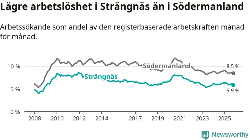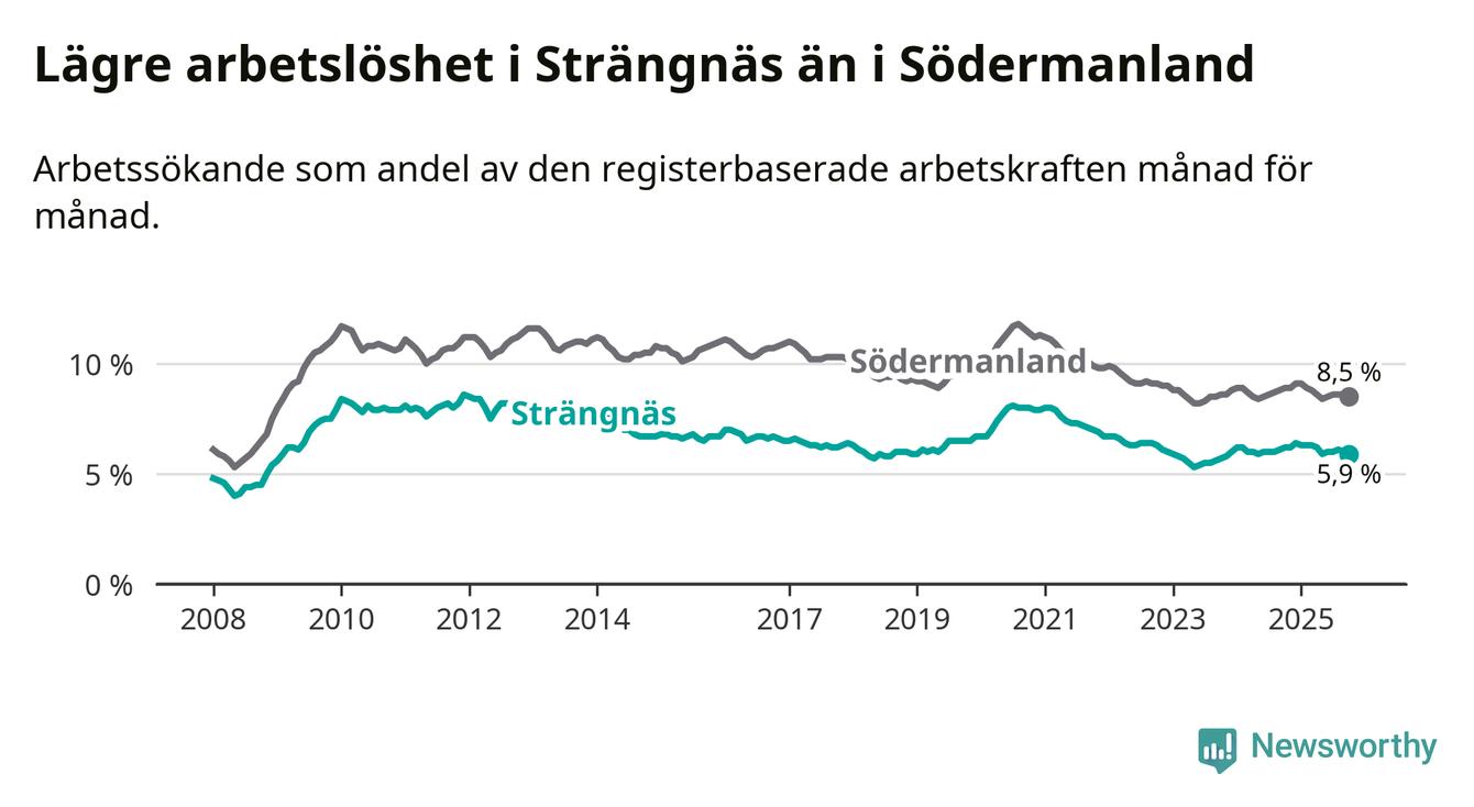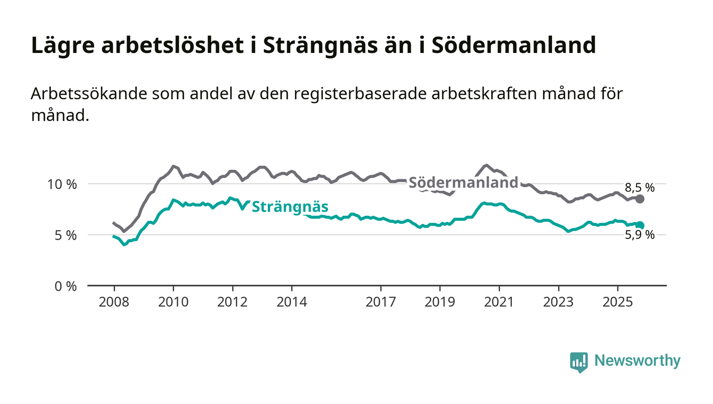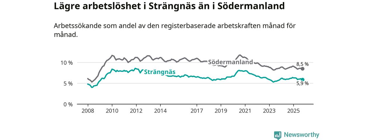 Under oktober månad rapporterade Strängnäs kommun en total arbetslöshet på 5,9 procent. Det är en minskning jämfört med samma tidpunkt i fjol (−0,3 procentenheter). Även i Södermanlands län sjunker arbetslösheten .