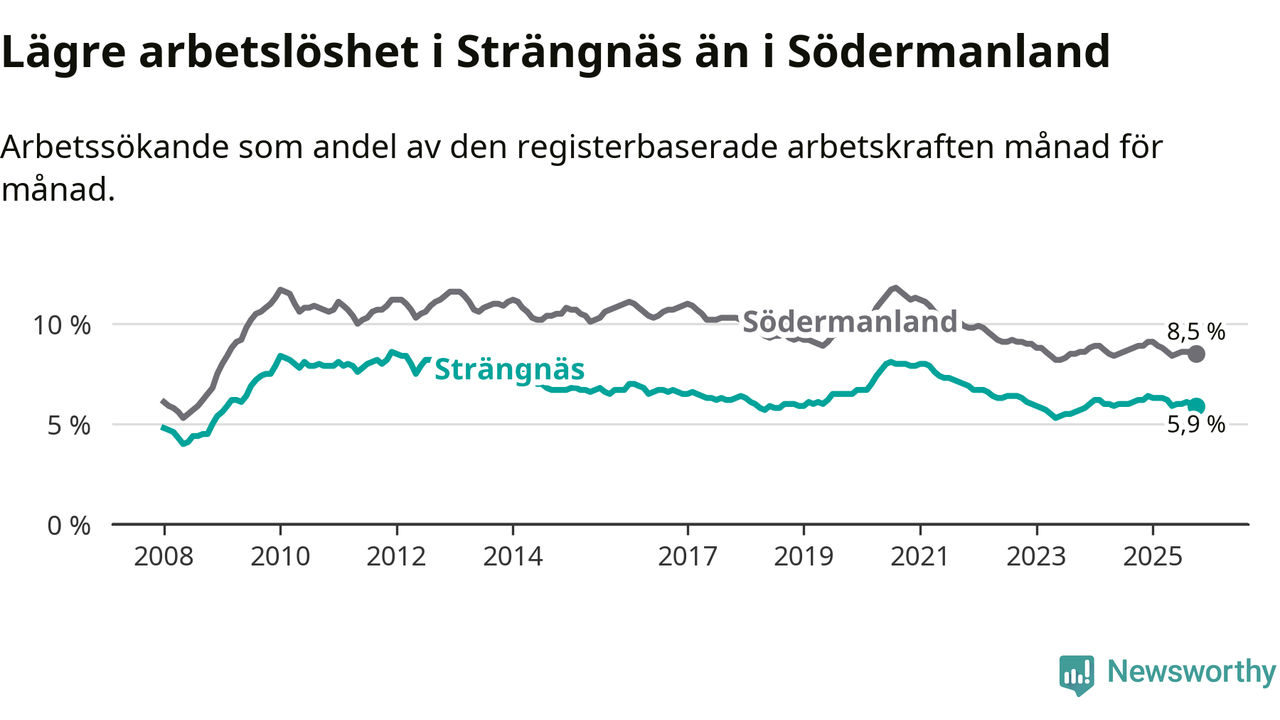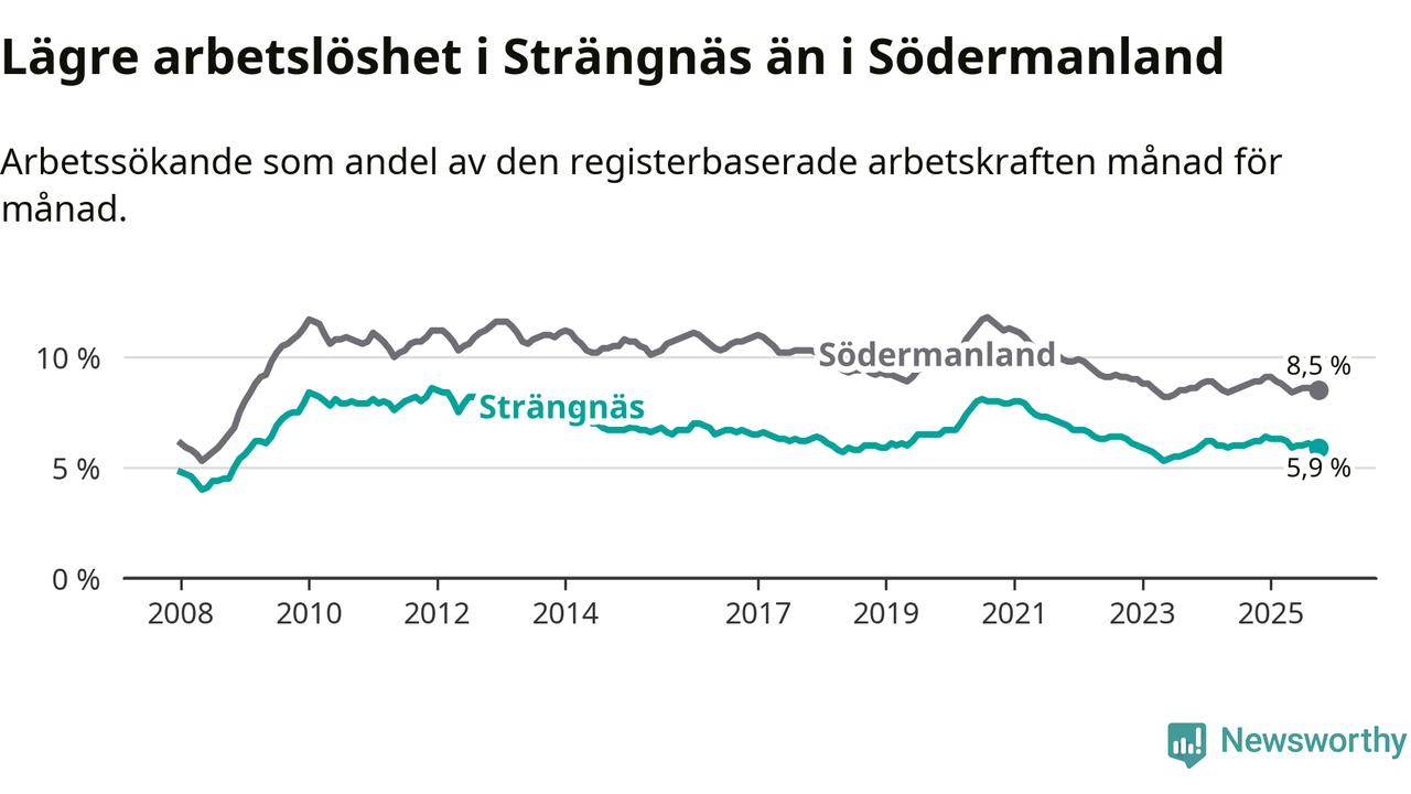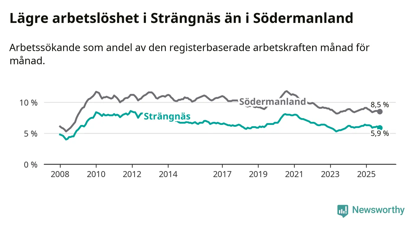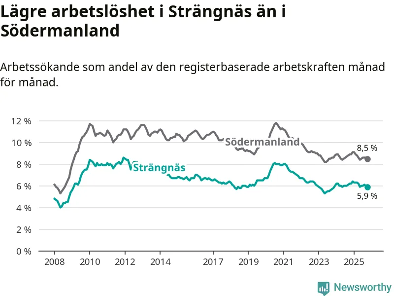Under oktober månad rapporterade Strängnäs kommun en total arbetslöshet på 5,9 procent. Det är en minskning jämfört med samma tidpunkt i fjol (−0,3 procentenheter). Även i Södermanlands län sjunker arbetslösheten .