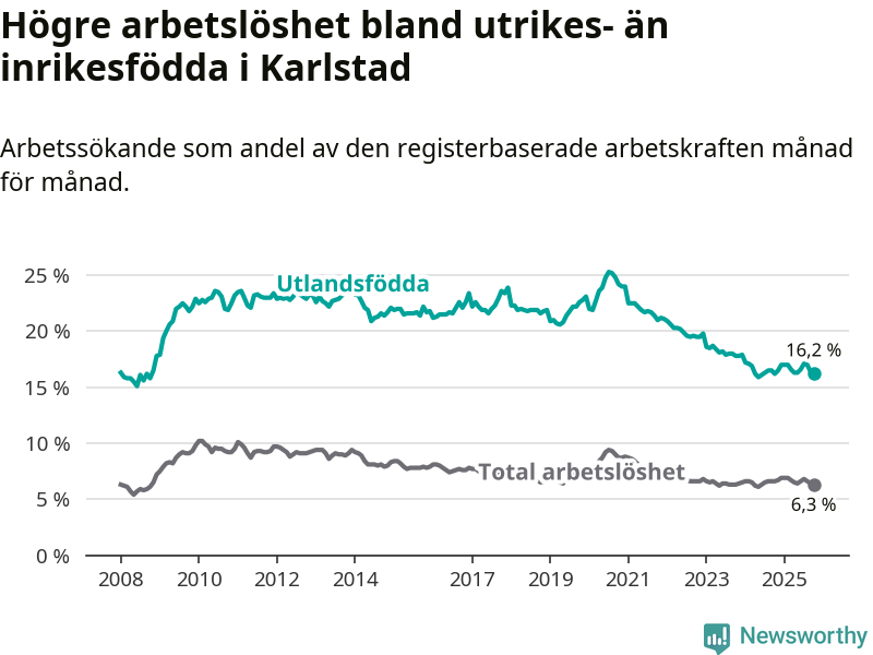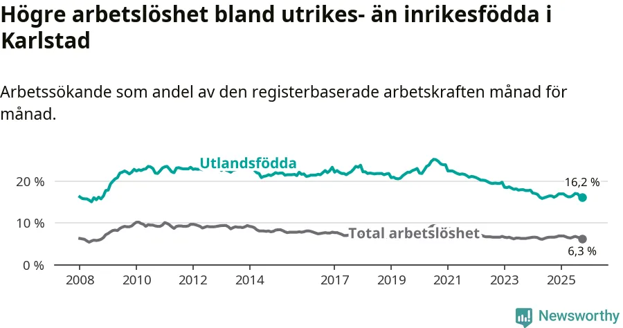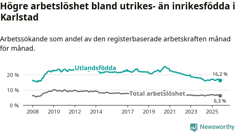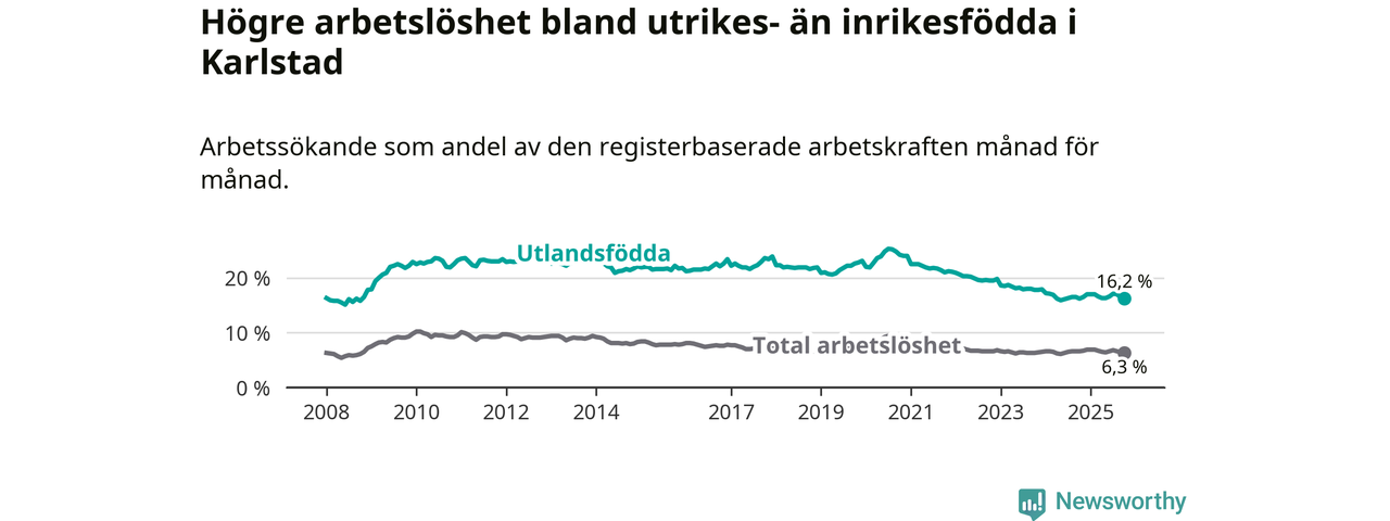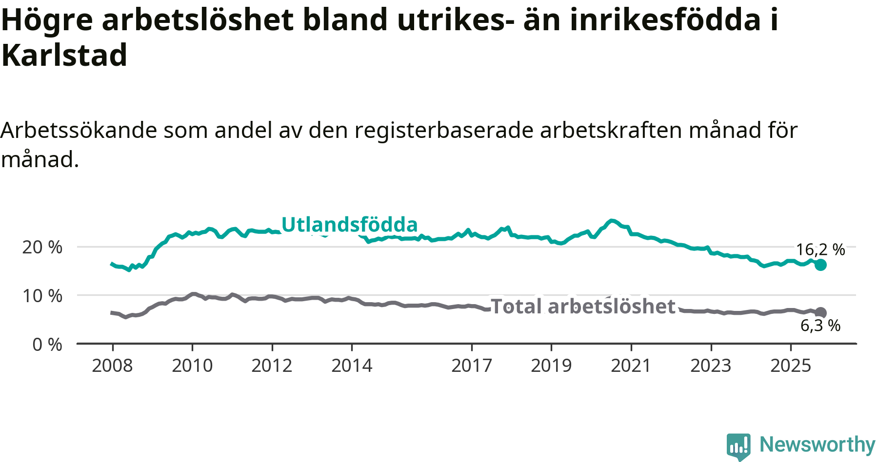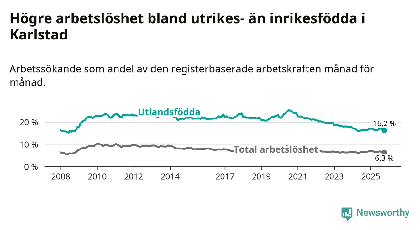 Arbetslösheten bland utlandsfödda var 16,2 procent i Karlstad under oktober månad, motsvarande 1 463 av 9 031 personer. Det är i stort sett lika stor andel som i fjol.