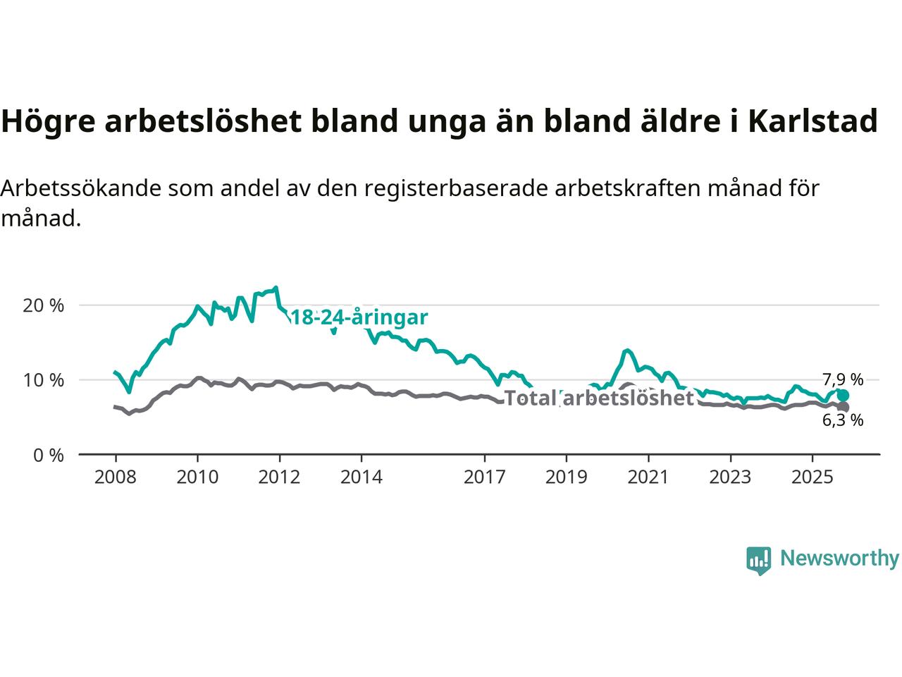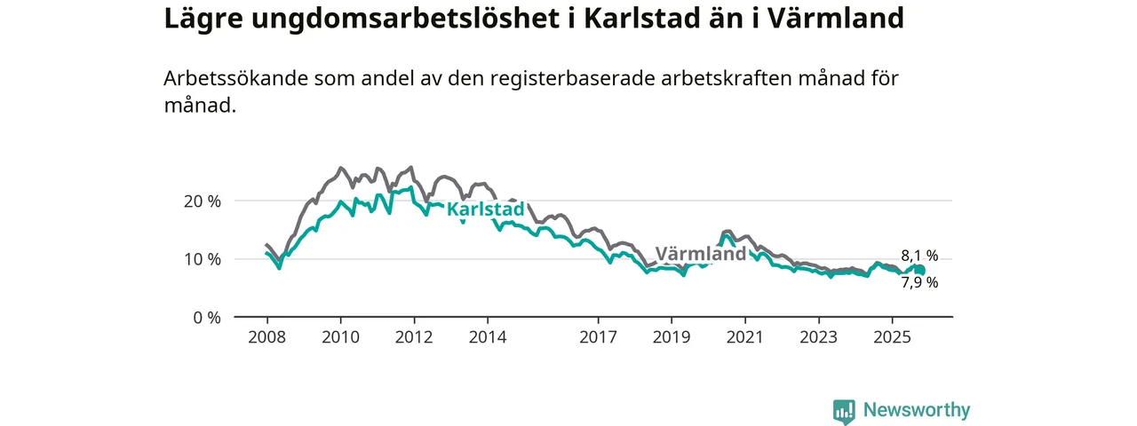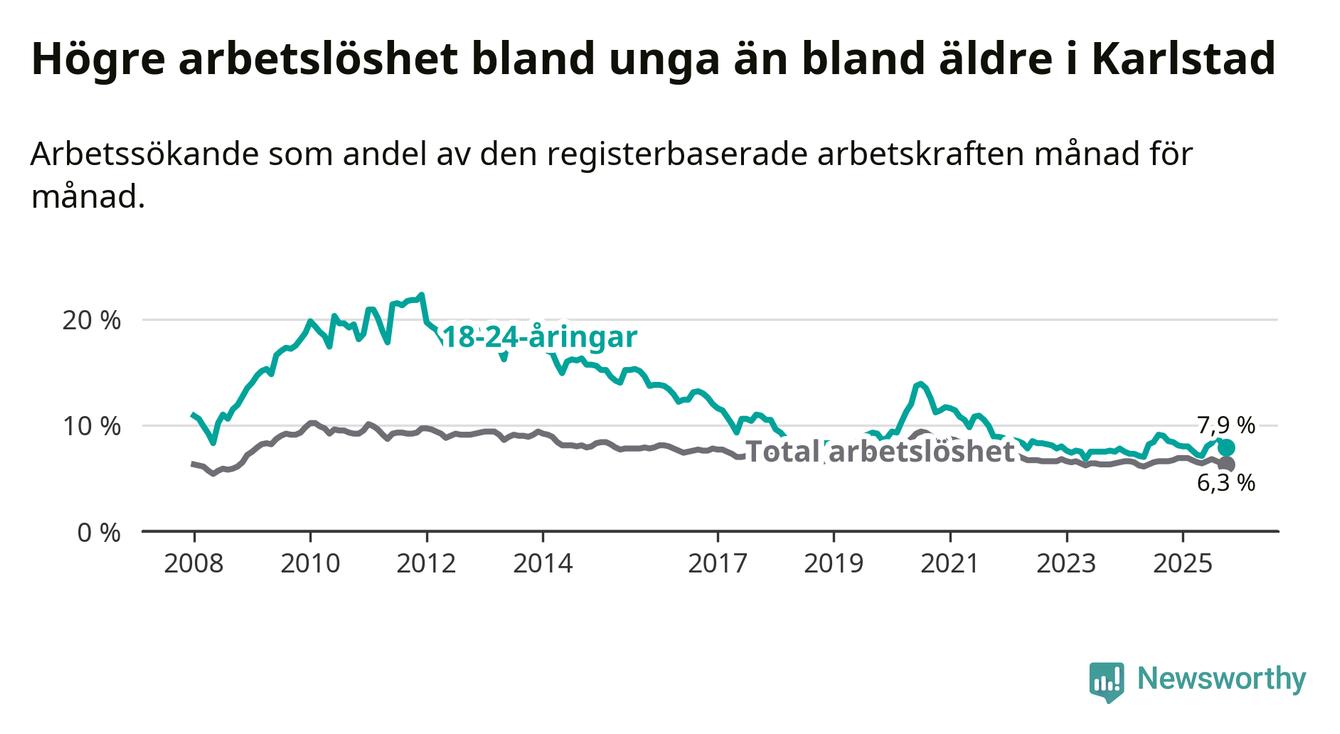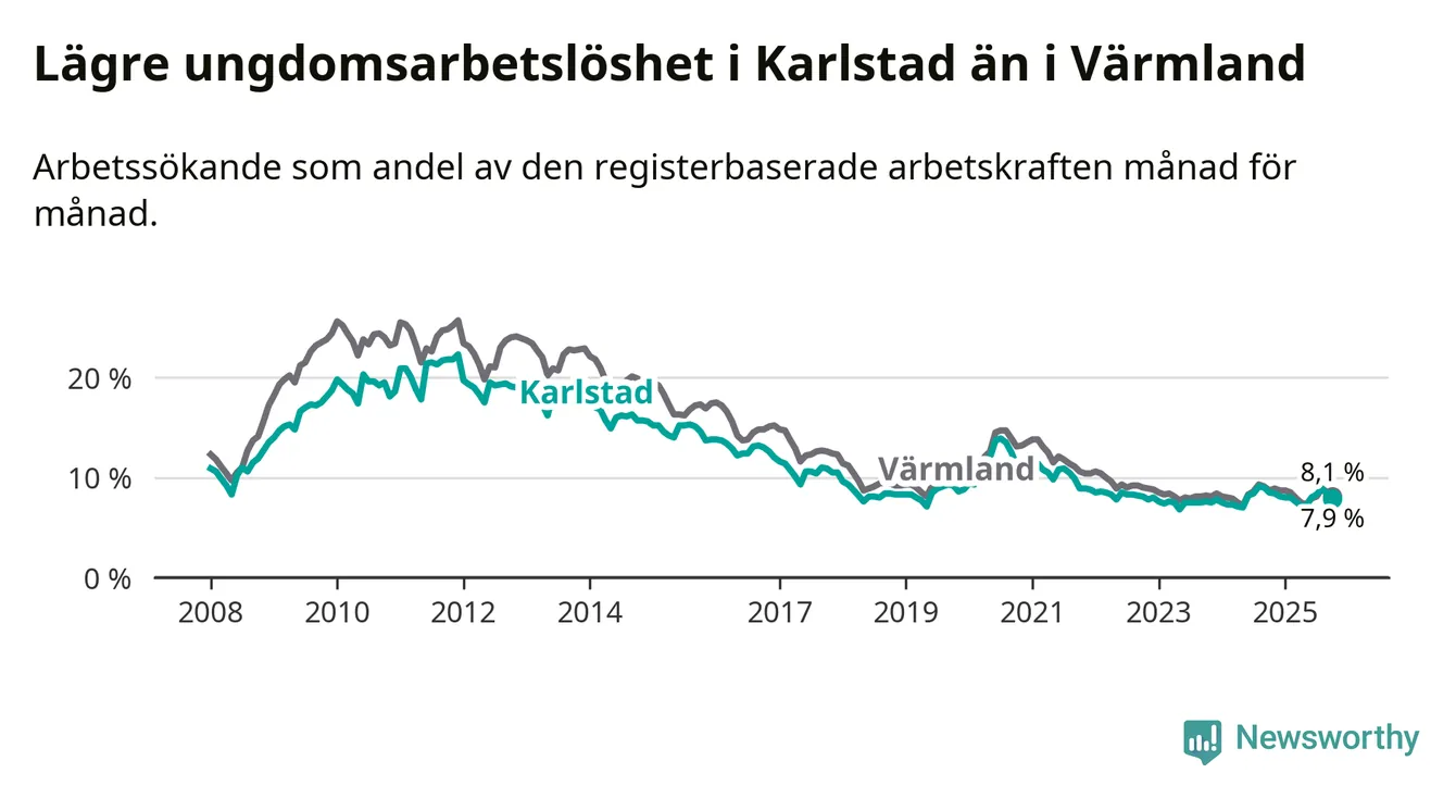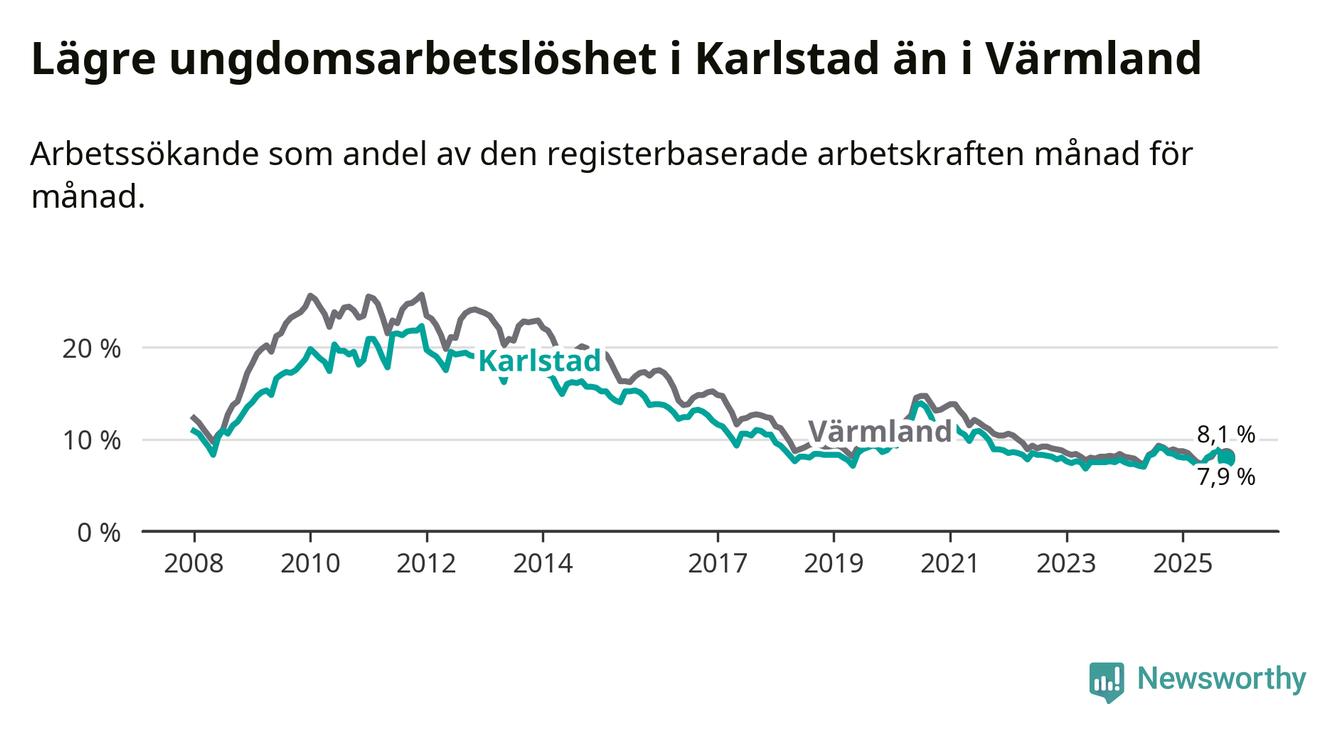 Medan Karlstad har högre total arbetslöshet än Värmland, ligger ungdomsarbetslösheten 0,2 procentenheter lägre i Karlstad.