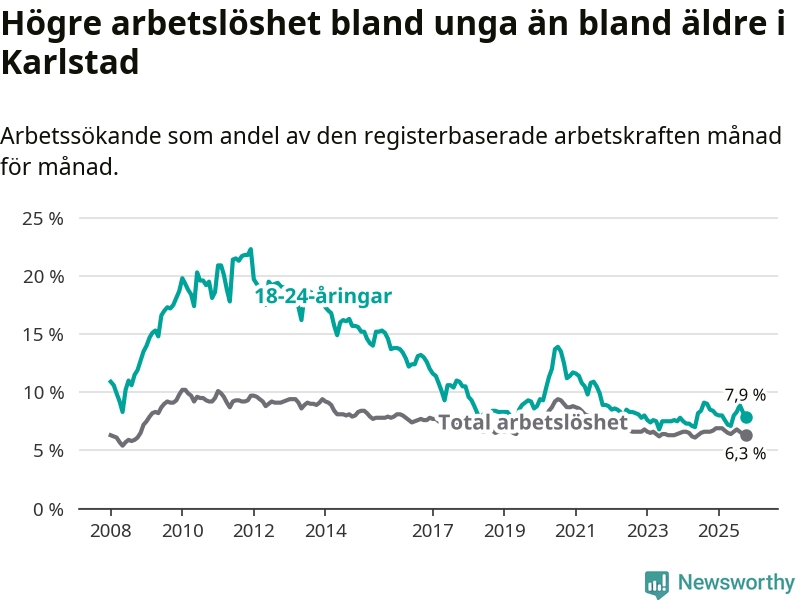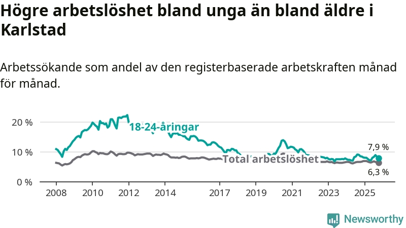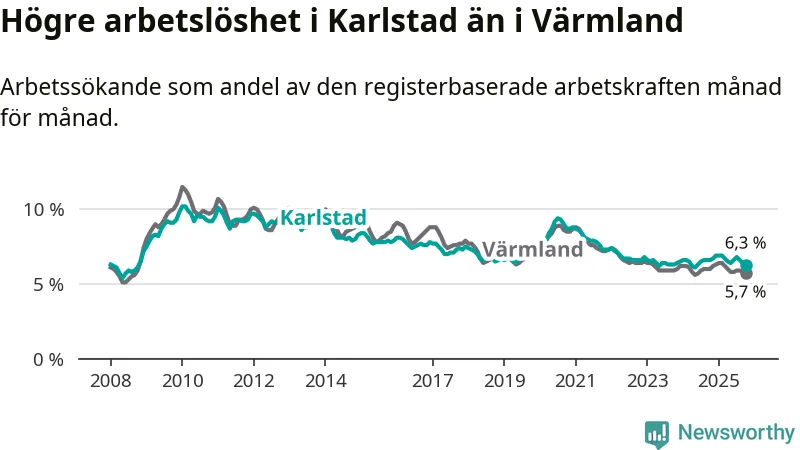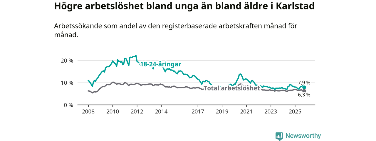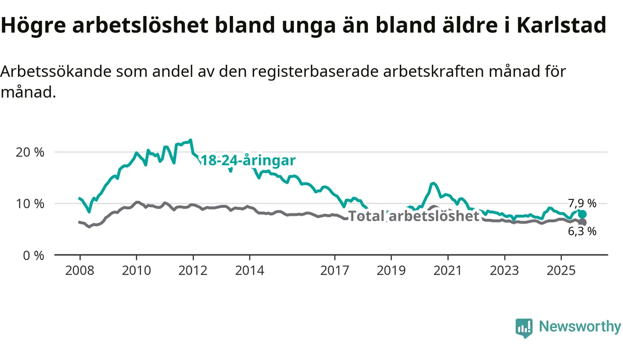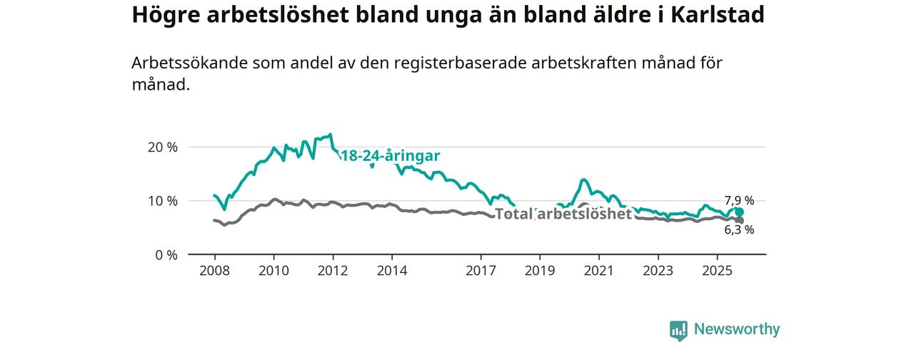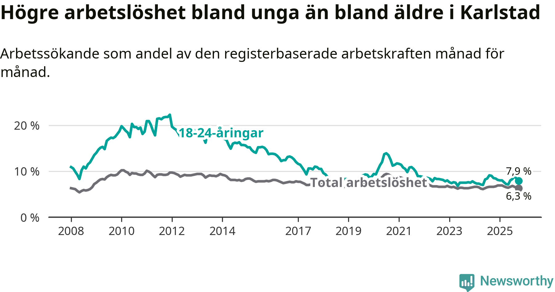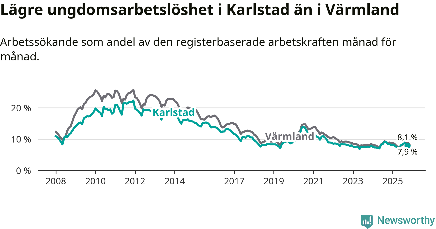 Medan Karlstad har högre total arbetslöshet än Värmland, ligger ungdomsarbetslösheten 0,2 procentenheter lägre i Karlstad.