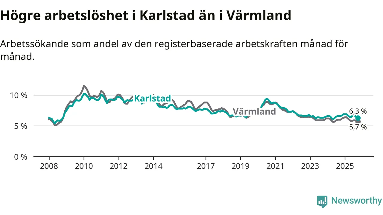 Även om arbetslösheten i Karlstad alltså minskar, så ligger den fortfarande över snittet i hela Värmlands län (6,3 procent i kommunen, jämfört med 5,7 procent i hela länet). Torsby har den lägsta arbetslösheten i länet (3,4 procent), medan Filipstad har den högsta (8,2 procent). För att Karlstad skulle komma ner i samma arbetslöshetsnivå som Torsby skulle 1 463 personer behöva sysselsättas.