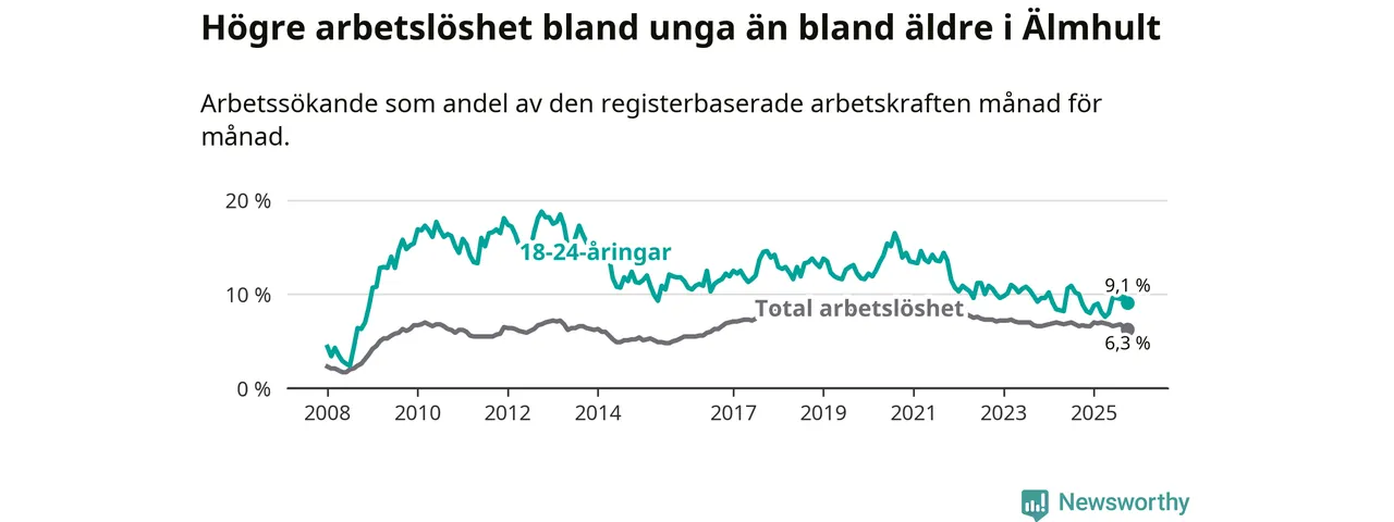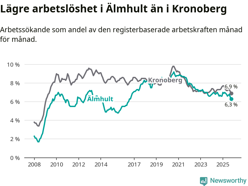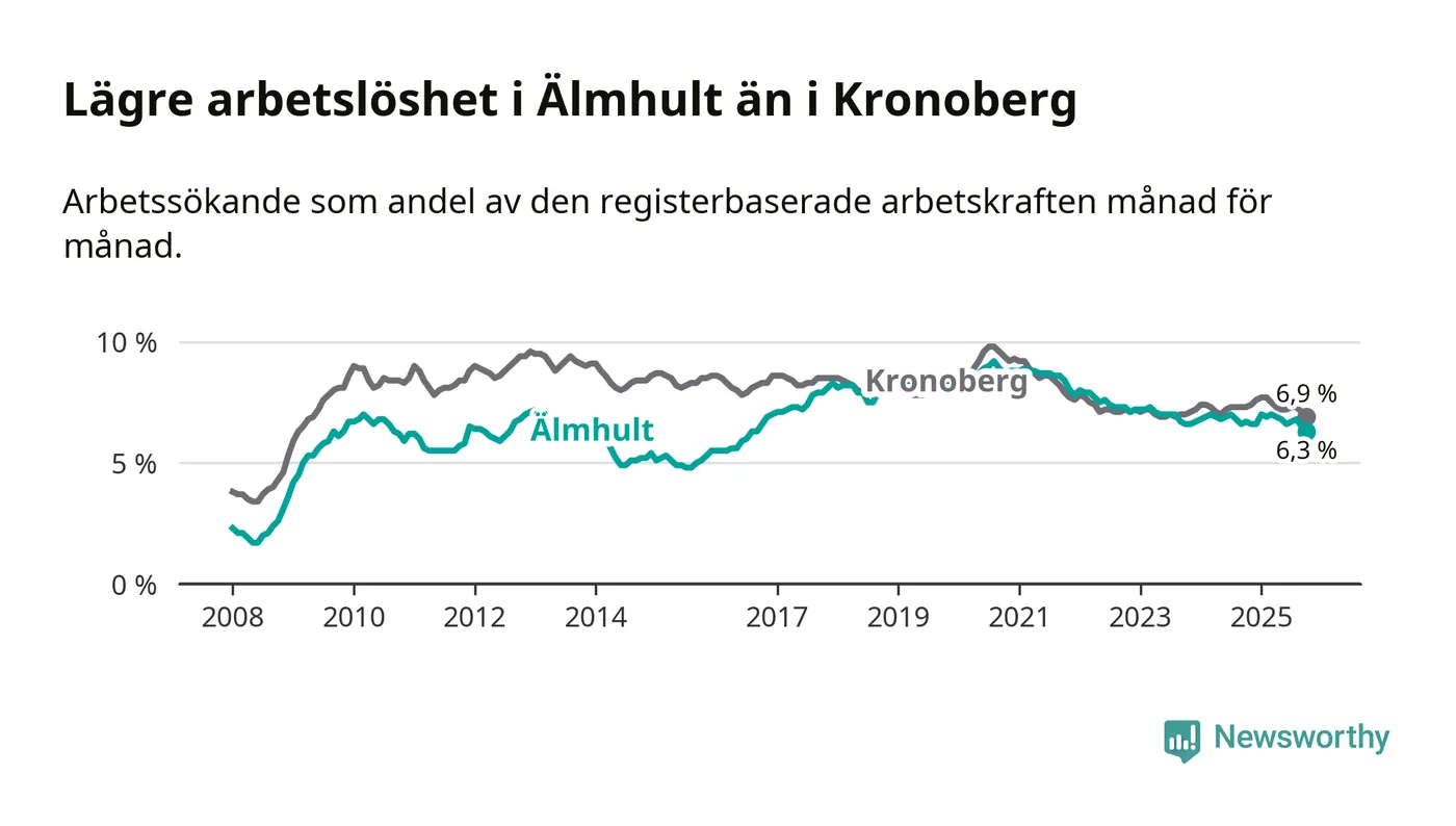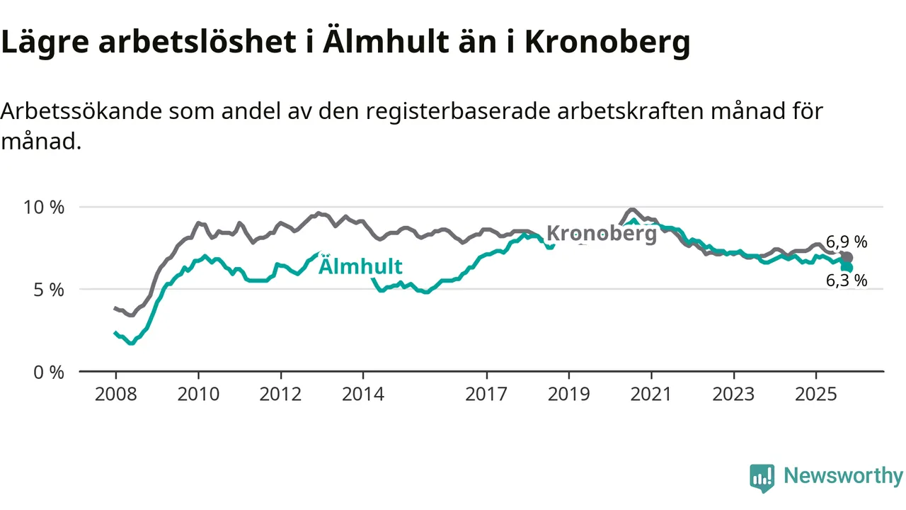 Under oktober månad rapporterade Älmhults kommun en total arbetslöshet på 6,3 procent. Det är en minskning jämfört med samma tidpunkt i fjol (−0,4 procentenheter). Även i Kronobergs län sjunker arbetslösheten .