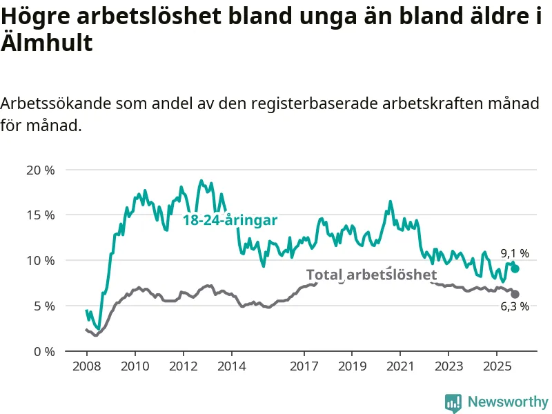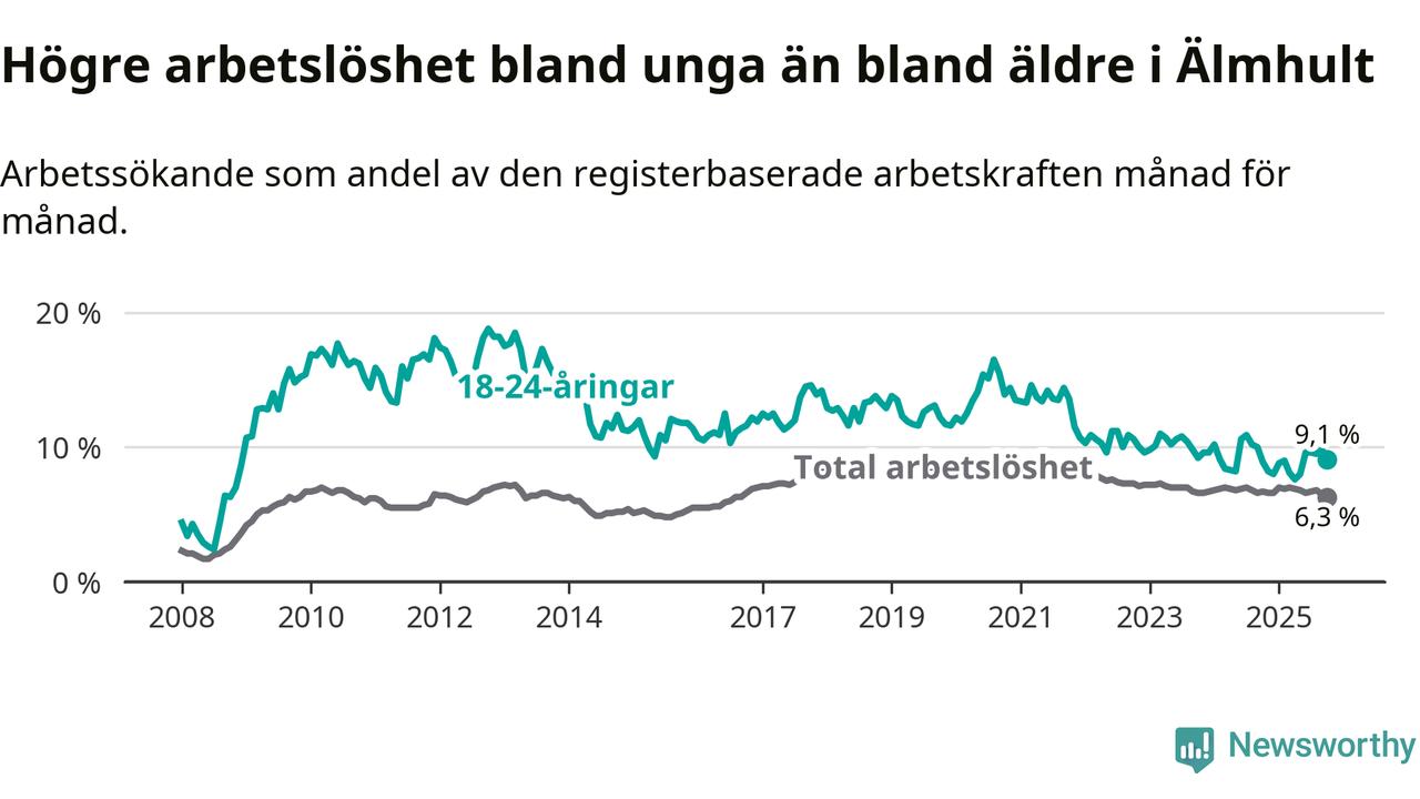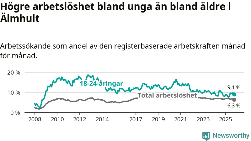 I oktober var 9,1 procent av 18–24-åringarna inskrivna som arbetssökande (motsvarande 65 personer). Mäter vi antalet inskrivna ser vi en minskning med ett personer på ett års sikt.