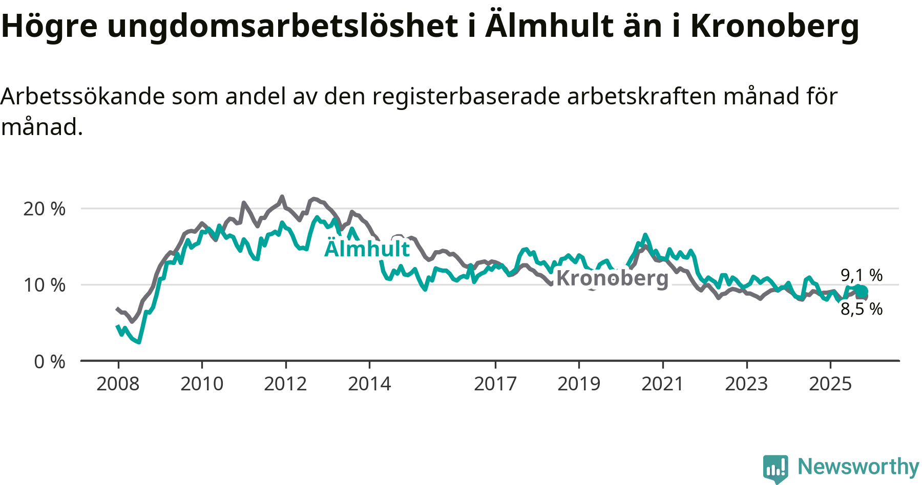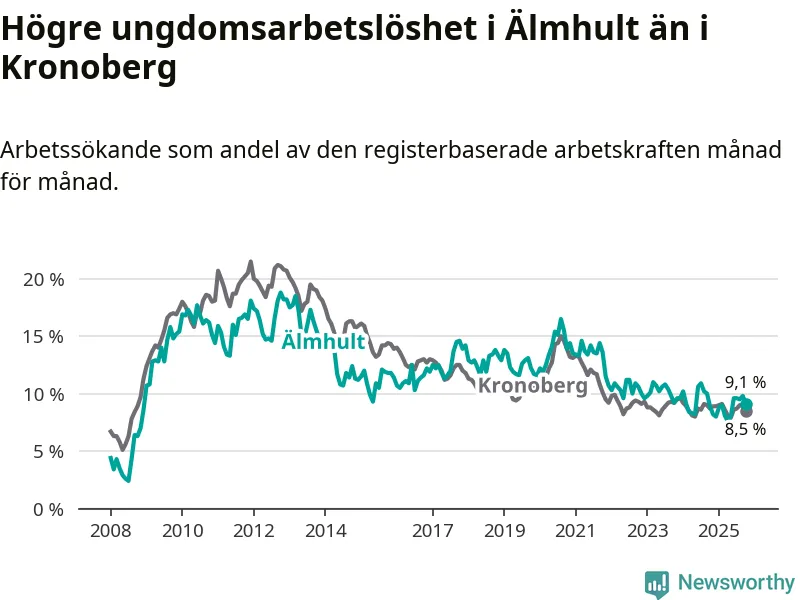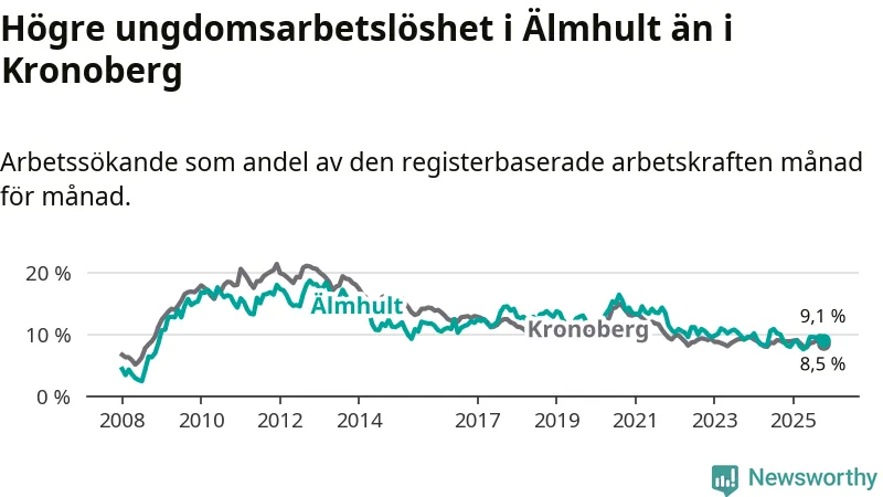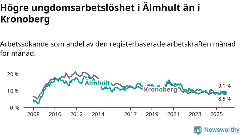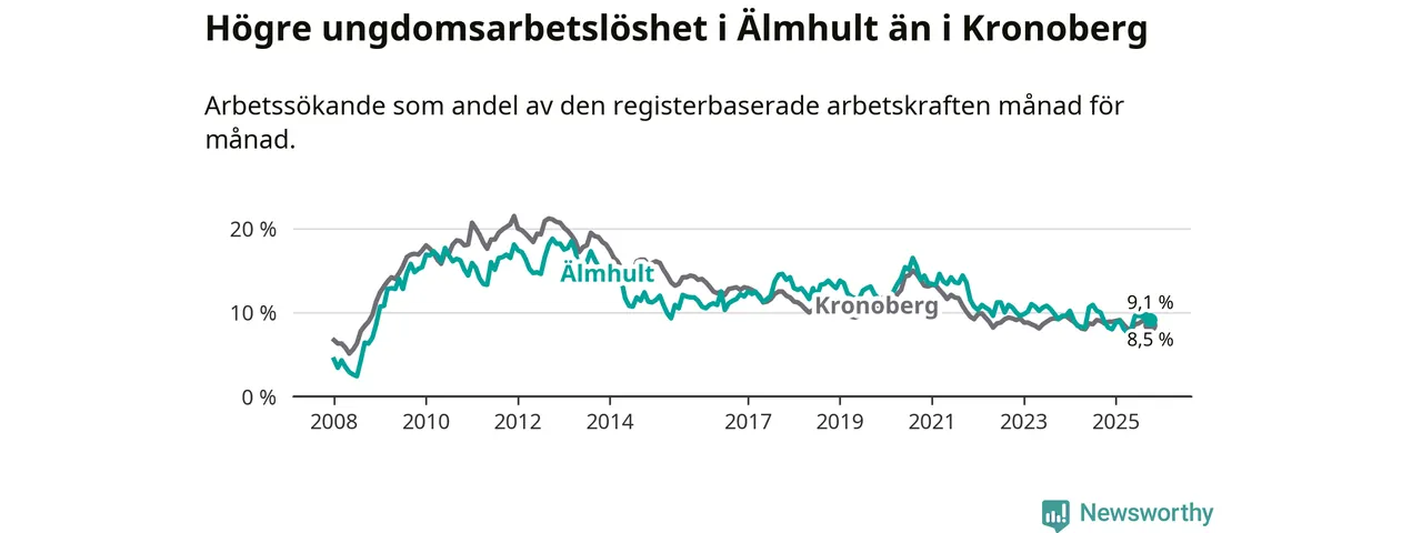 Älmhult hade redan tidigare lägre arbetslöshet än snittet i hela Kronobergs län och nu växer klyftan (6,3 procent i kommunen, jämfört med 6,9 procent i hela länet). Ljungby har den lägsta arbetslösheten i länet (5,0 procent), medan Lessebo har den högsta (10,0 procent). För att Älmhult skulle komma ner i samma arbetslöshetsnivå som Ljungby skulle 112 personer behöva sysselsättas.