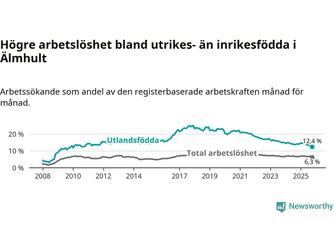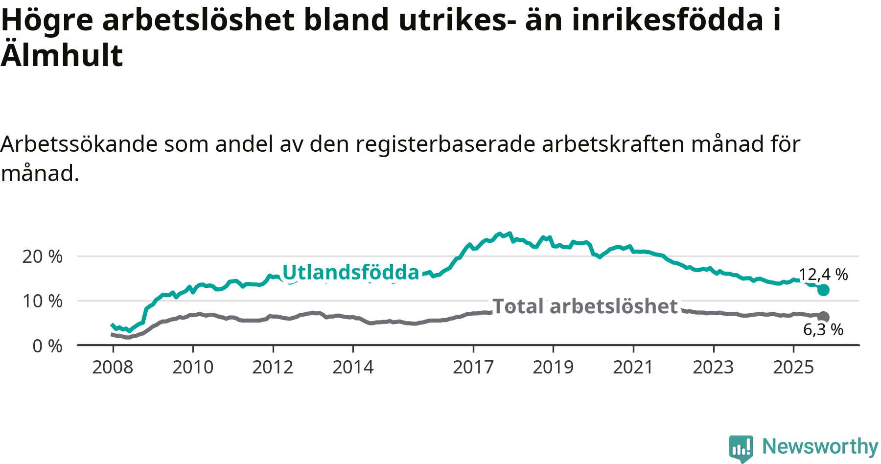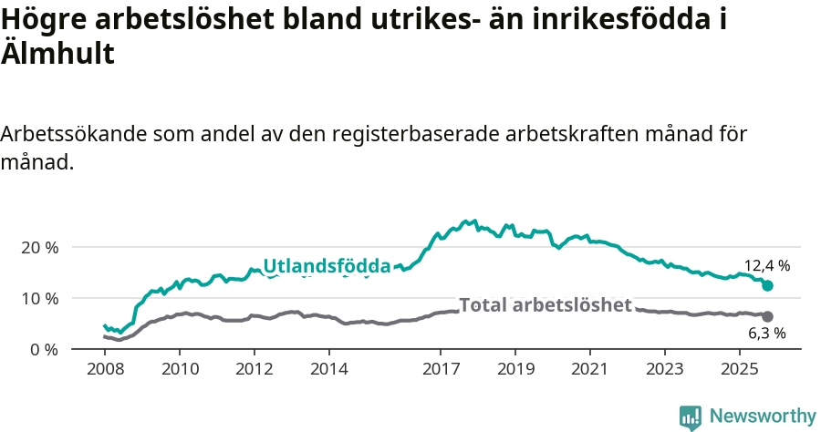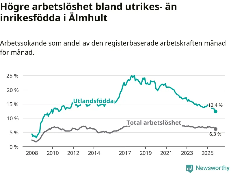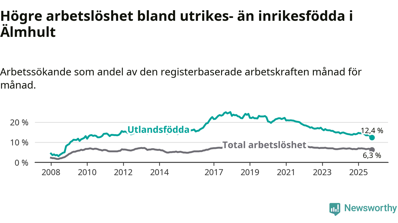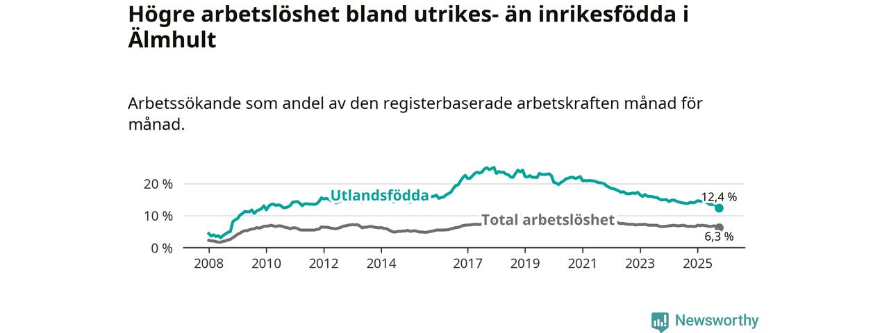 Skillnaden i arbetslöshet mellan utrikesfödda och hela befolkningen är 6,1 procentenheter i Älmhult. Det är en mindre skillnad än för ett år sedan (−1,4 procentenheter).