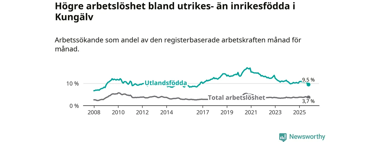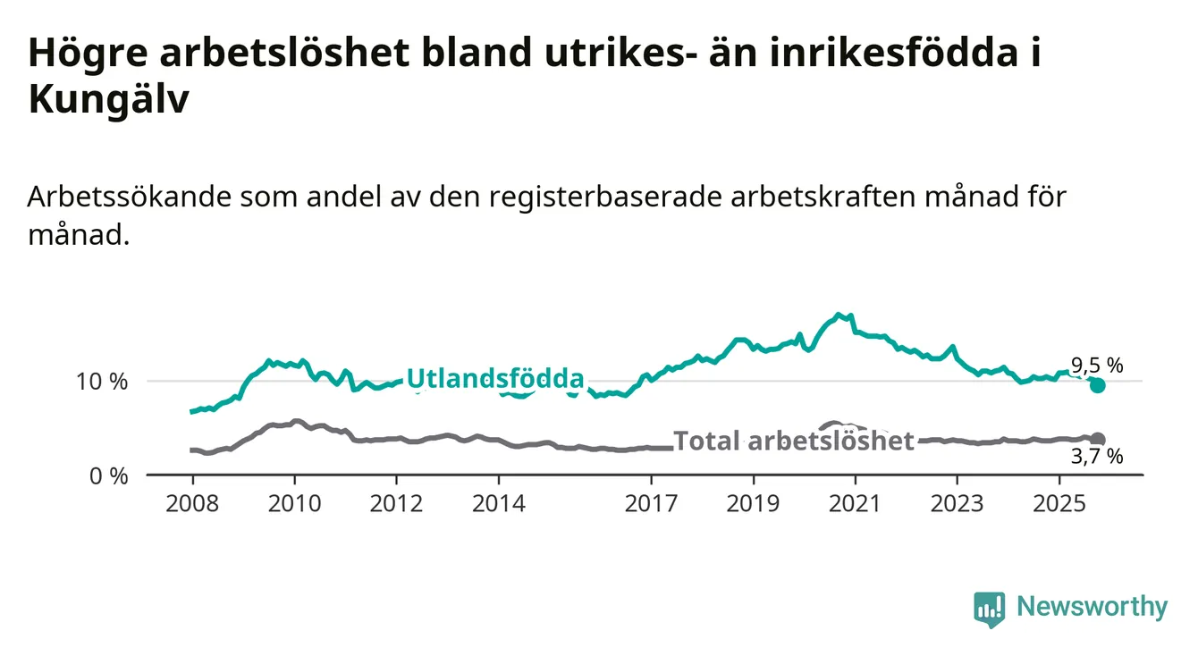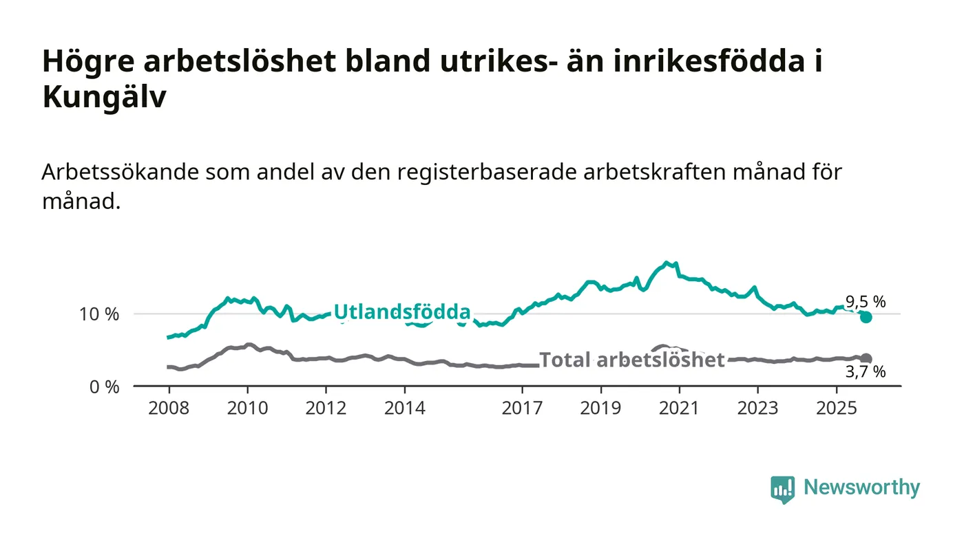 Skillnaden i arbetslöshet mellan utrikesfödda och hela befolkningen är 5,8 procentenheter i Kungälv. Det är en mindre skillnad än för ett år sedan (−1,0 procentenheter).