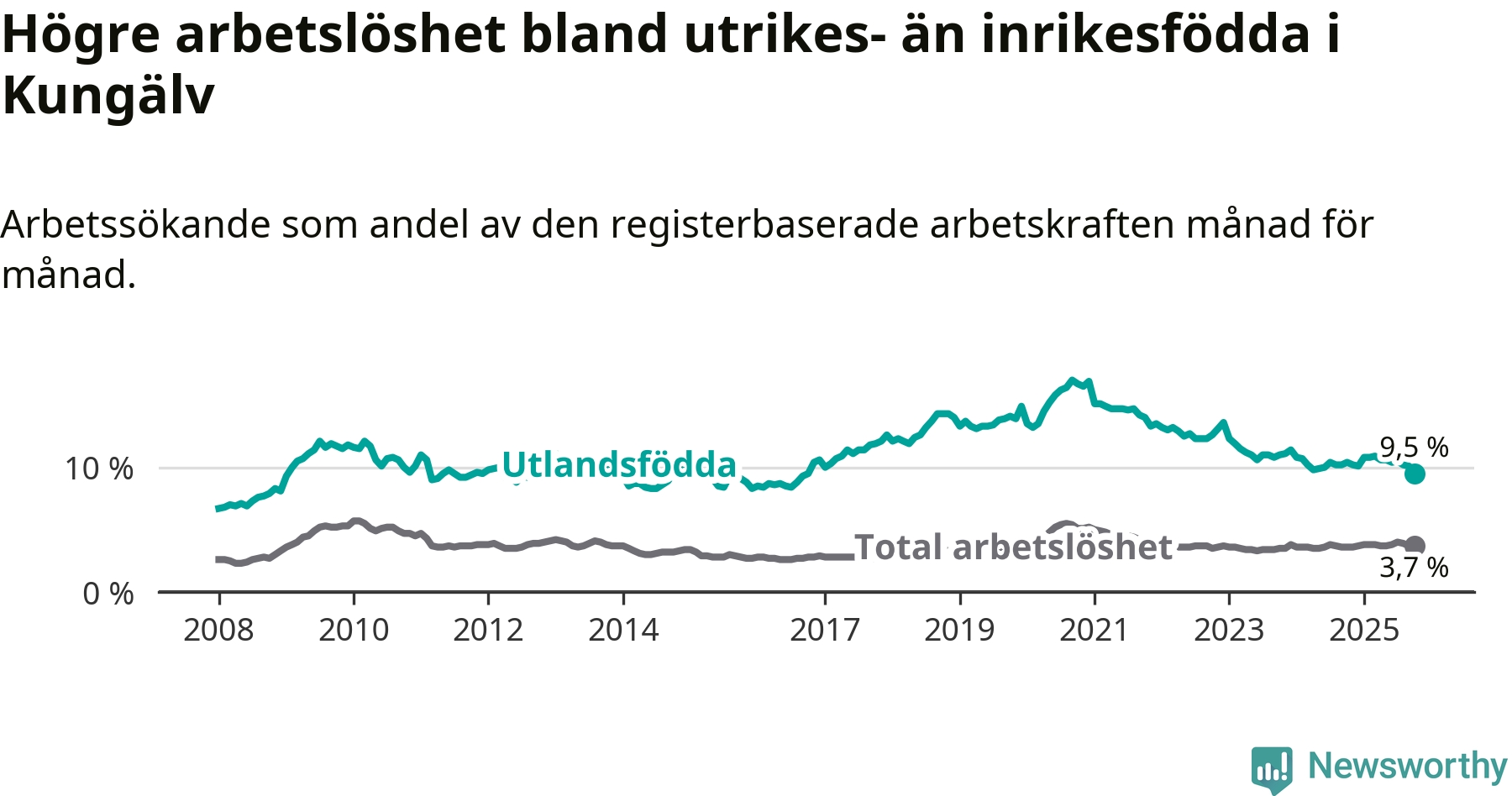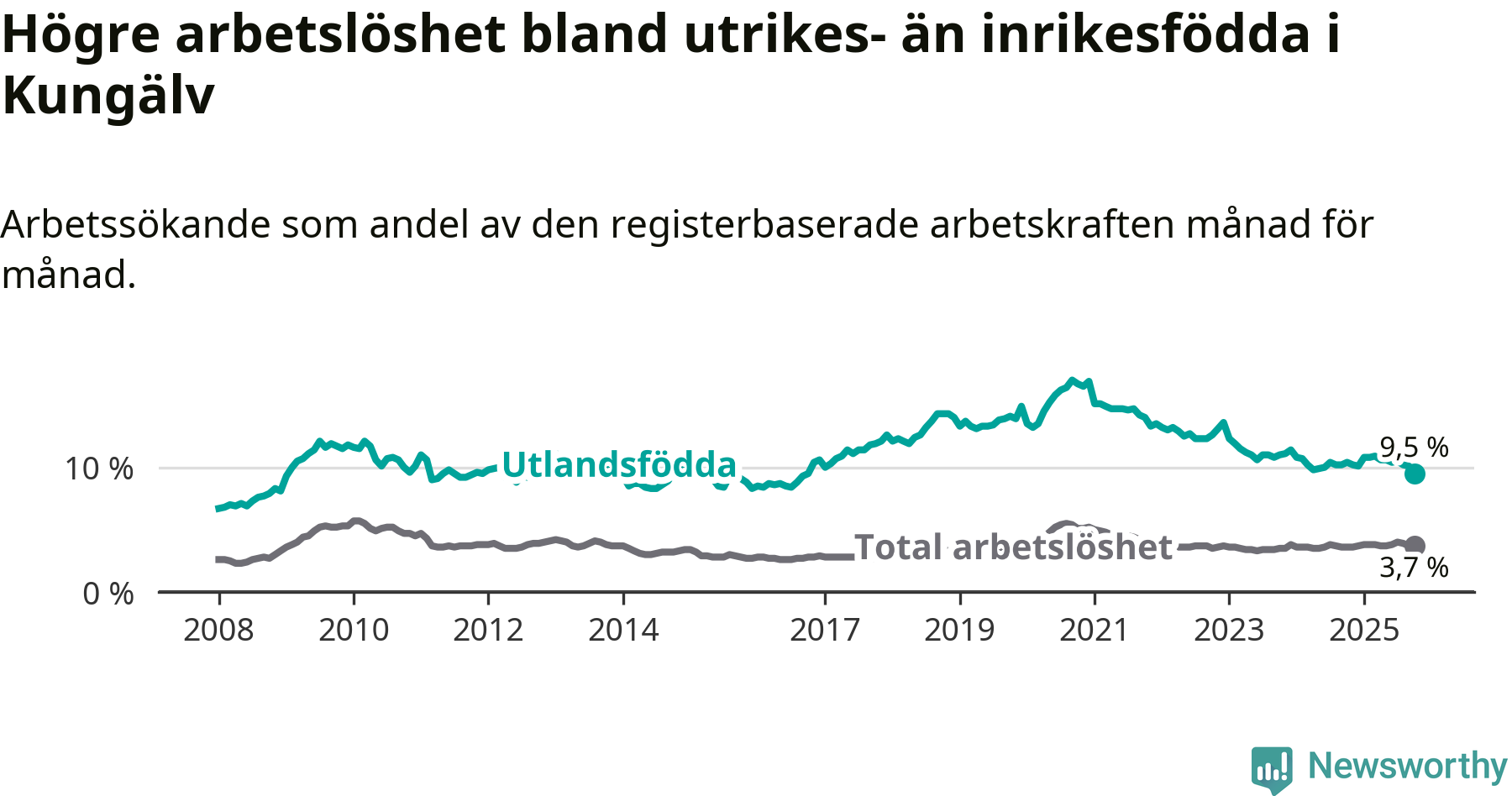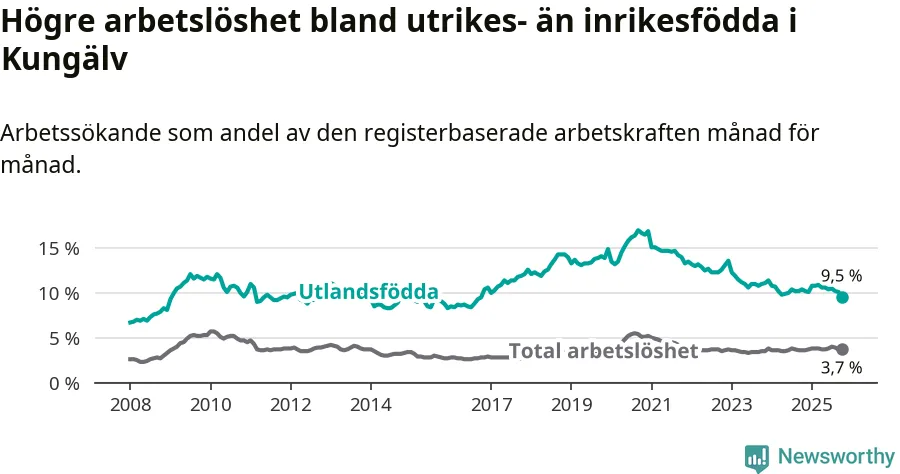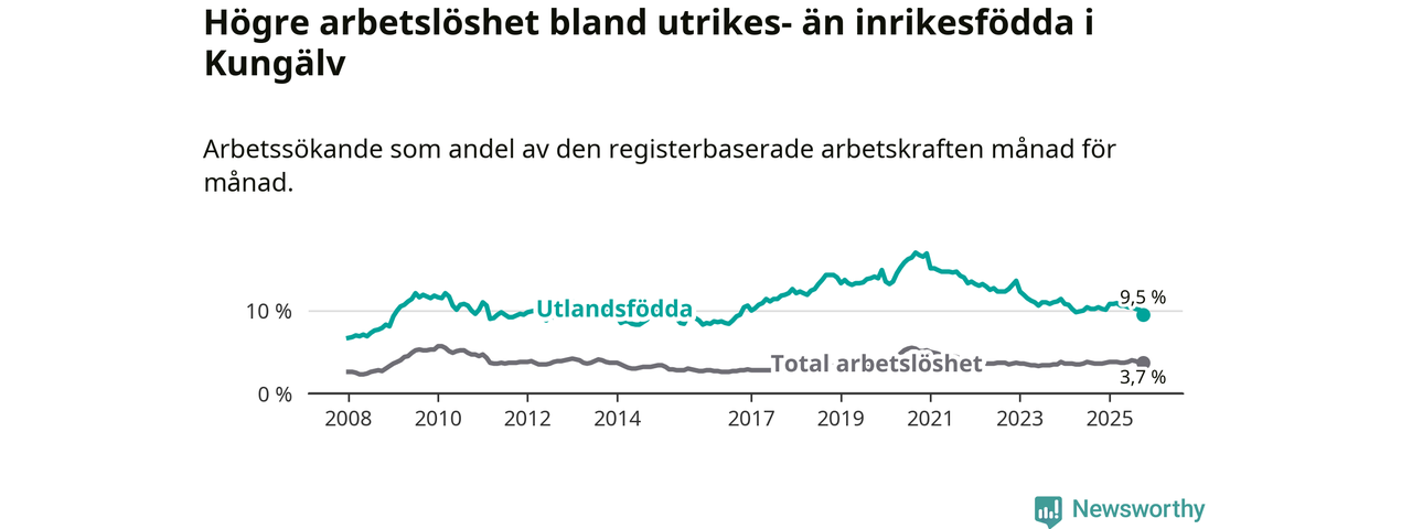 Arbetslösheten bland utlandsfödda var 9,5 procent i Kungälv under oktober månad, motsvarande 333 av 3 505 personer. Det är 0,9 procentenheter färre än vid samma tidpunkt i fjol (−25 om man räknar personer). Den nuvarande arbetslöshetsnivån är den lägsta sedan oktober 2016.