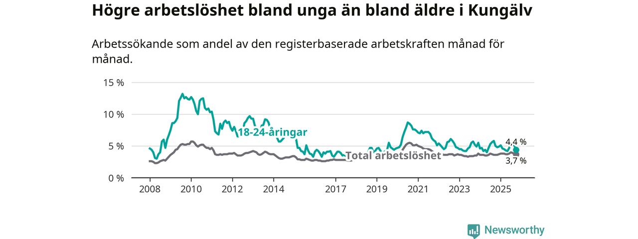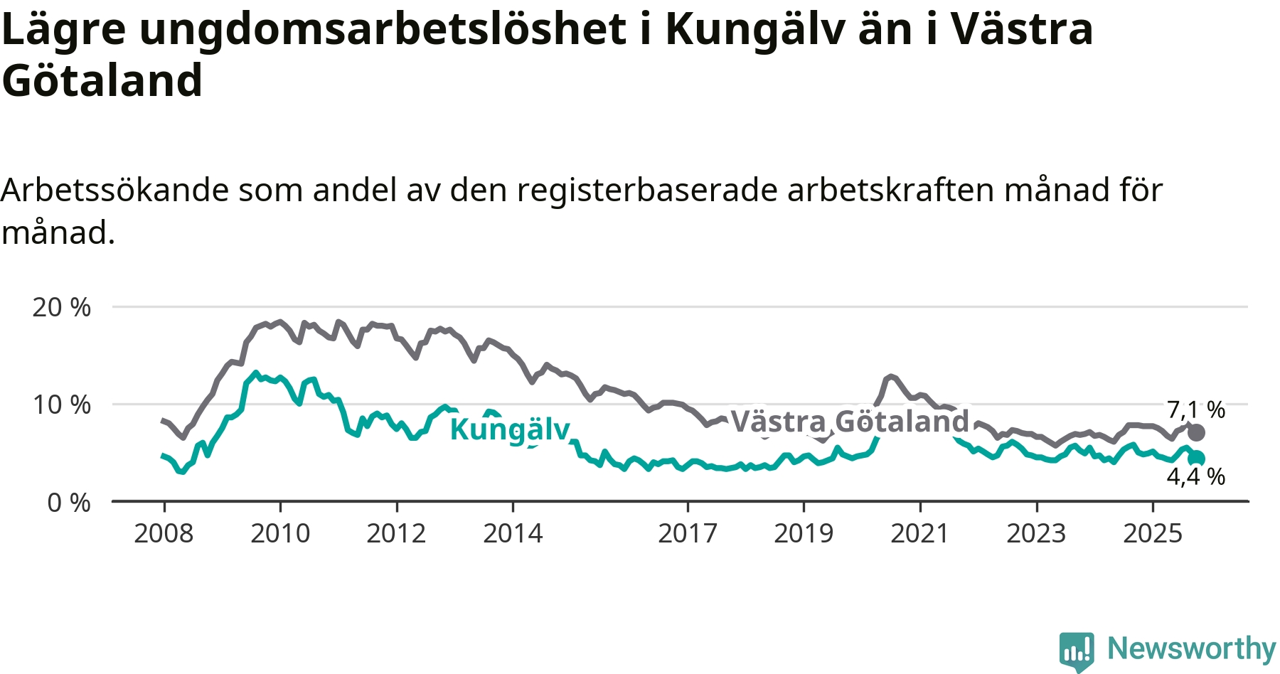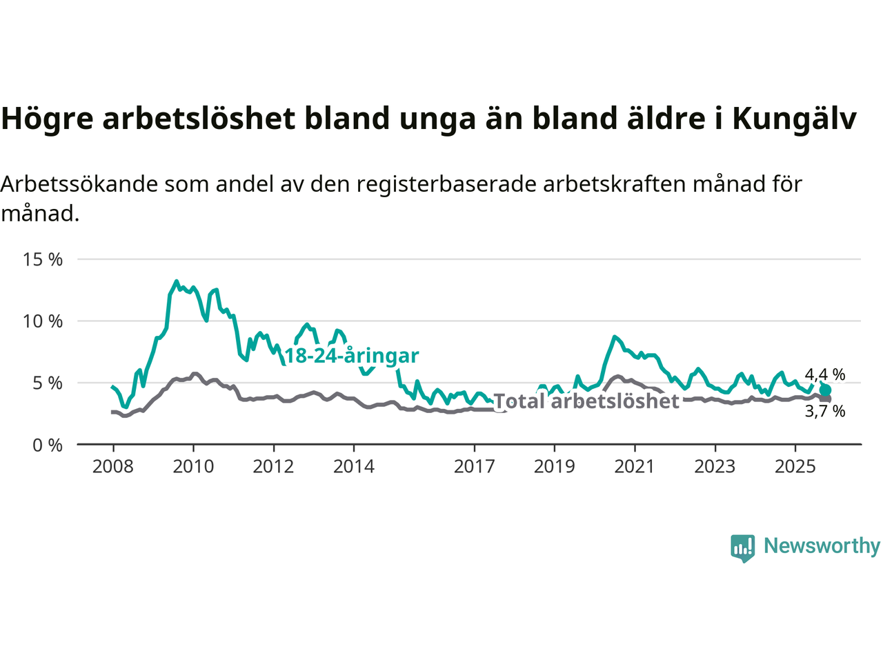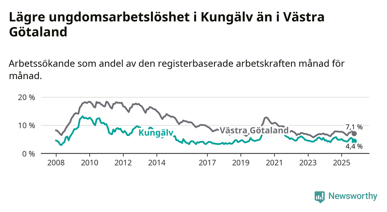 Precis som den totala arbetslösheten ligger ungdomsarbetslösheten i Kungälv lägre än i Västra Götaland som helhet. Skillnaden mellan kommunen och länet är 2,7 procentenheter.