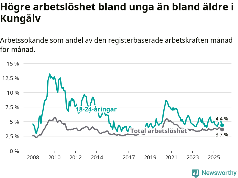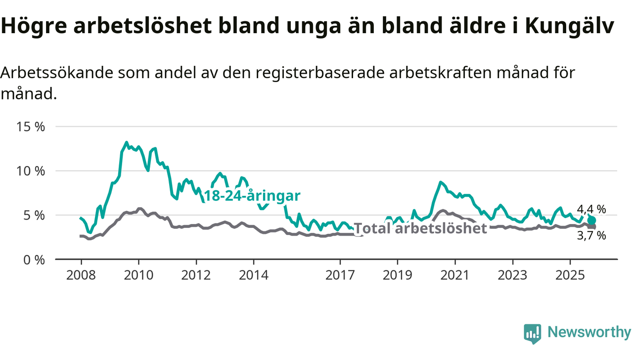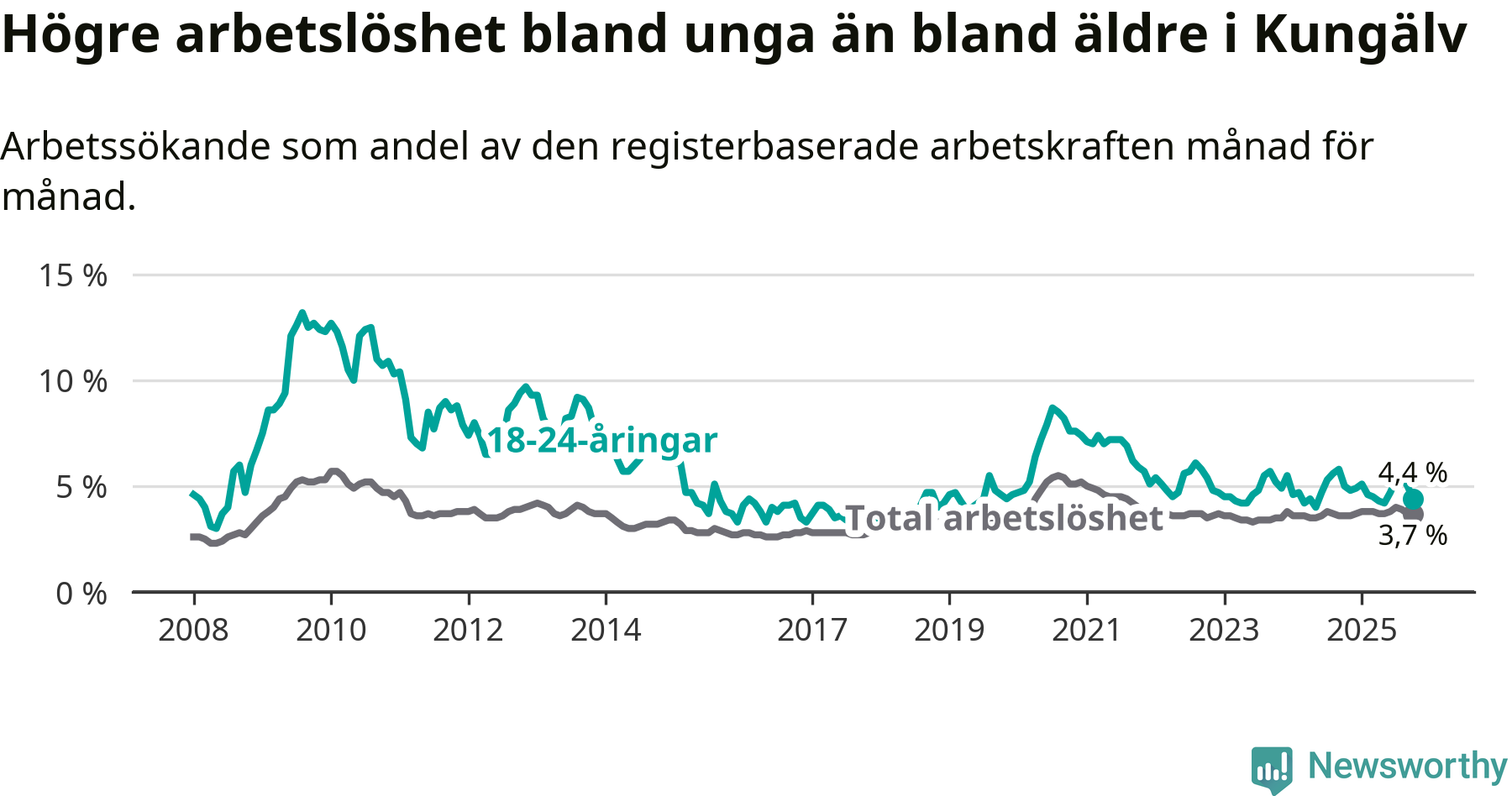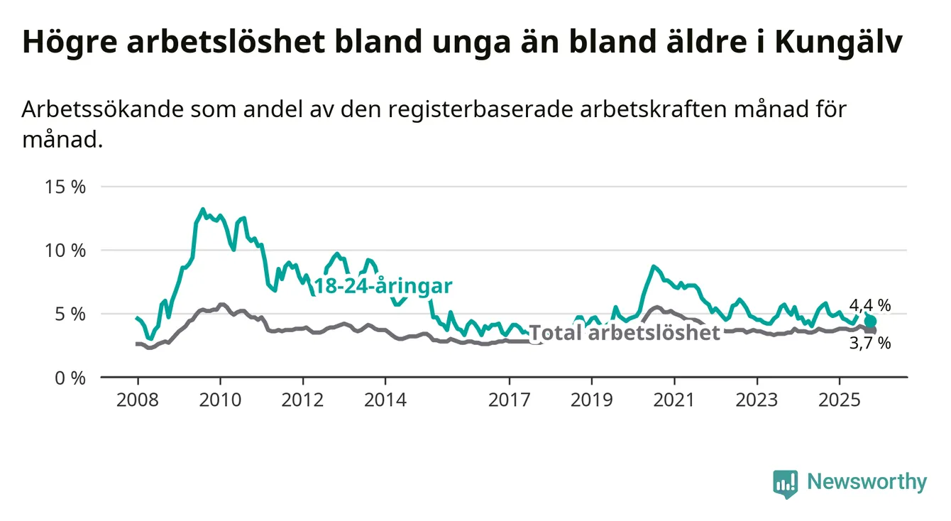 Precis som den totala arbetslösheten ligger ungdomsarbetslösheten i Kungälv lägre än i Västra Götaland som helhet. Skillnaden mellan kommunen och länet är 2,7 procentenheter.
