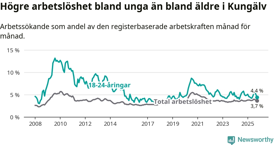 Till skillnad från den totala arbetslösheten sjunker arbetslösheten bland unga (−0,6 procentenheter). I oktober var 4,4 procent av 18–24-åringarna inskrivna som arbetssökande (motsvarande 111 personer). Mäter vi antalet inskrivna ser vi en minskning med 15 personer på ett års sikt.