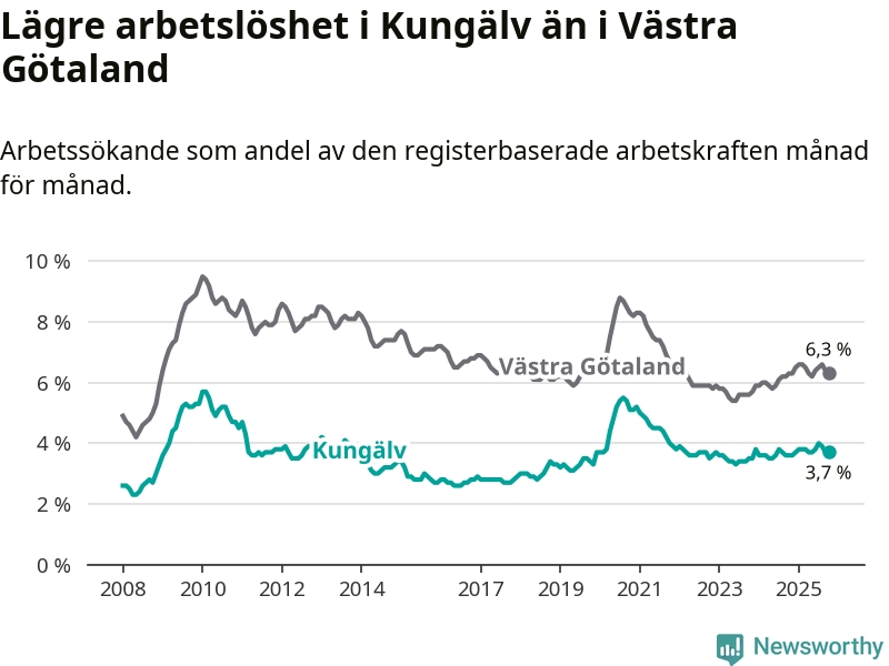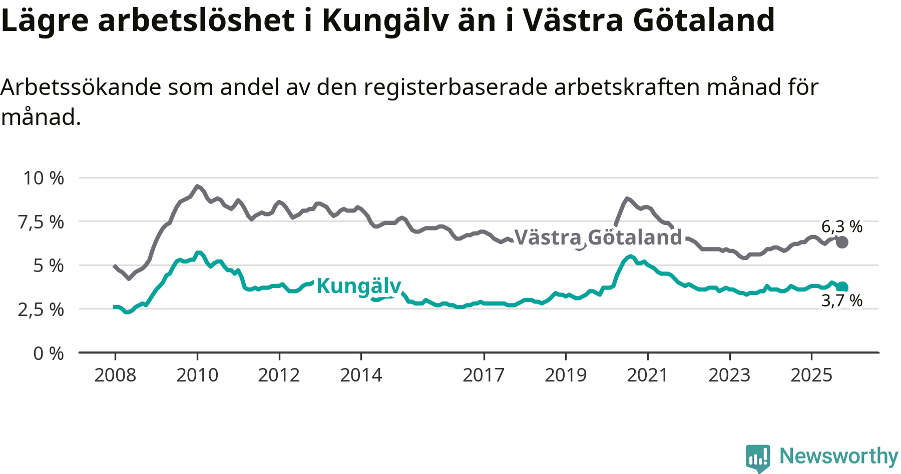 Under oktober månad rapporterade Kungälvs kommun en total arbetslöshet på 3,7 procent. Det är en ökning jämfört med samma tidpunkt i fjol (+0,1 procentenheter). I Västra Götalands län däremot står arbetslösheten stilla.