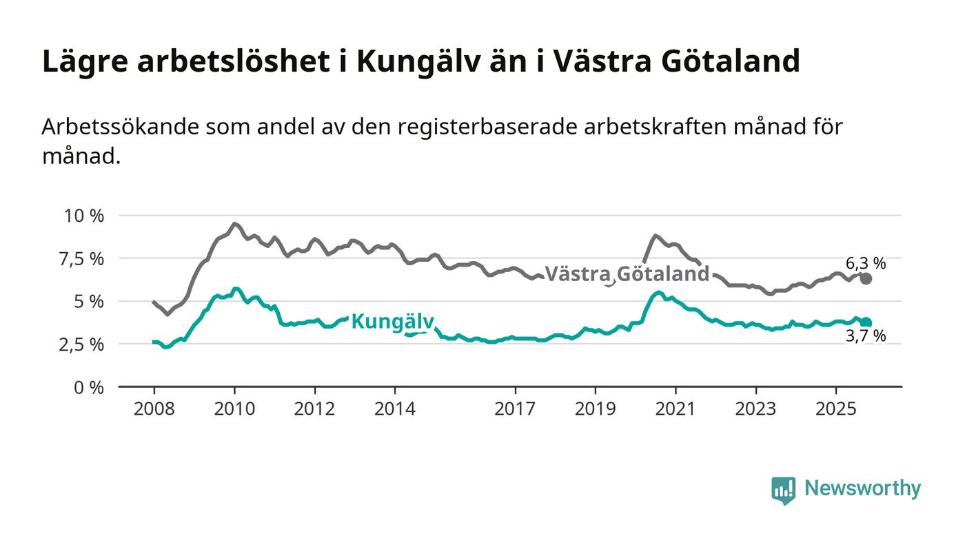 Även om arbetslösheten i Kungälv alltså ökar, så ligger den fortfarande under snittet i hela Västra Götalands län (3,7 procent i kommunen, jämfört med 6,3 procent i hela länet). Öckerö har den lägsta arbetslösheten i länet (2,7 procent), medan Gullspång har den högsta (8,8 procent). För att Kungälv skulle komma ner i samma arbetslöshetsnivå som Öckerö skulle 259 personer behöva sysselsättas.
